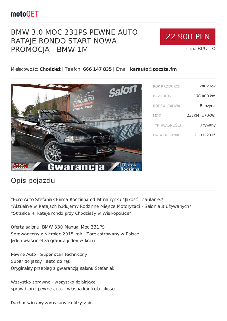 BMW 3.0 MOC 231PS PEWNE AUTO RATAJE RONDO START NOWA PROMOCJA - BMW 1M 22 900 PLN cena BRUTTO Miejscowość: Chodzież | Telefon: 666 147 835 | Email: [email protected] 2002 rok 178 000 km Benzyna 231KM (170KW) Używany 21-11-2016 Opis pojazdu *Euro Auto Stefaniak Firma Rodzinna od lat na rynku *Jakość i Zaufanie.* *Aktualnie w Ratajach budujemy Rodzinne Miejsce Motoryzacji - Salon aut używanych* *Strzelce + Rataje rondo przy Chodzieży w Wielkopolsce* Oferta salonu: BMW 330 Manual Moc 231PS Sprowadzony z Niemiec 2015 rok - Zarejestrowany w Polsce Jeden właściciel za granicą jeden w kraju Pewne Auto - Super stan techniczny Super do jazdy , auto do ręki Oryginalny przebieg z gwarancją salonu Stefaniak Wszystko sprawne - wszystko działające sprawdzone pewne auto - własna kontrola jakości Dach otwierany zamykany elektrycznie dach cały w super stanie Wzbogacone wyposażenie rubryka dodatkowe wyposażenie + Dodatki Wizualnie stan dobry Dołączyliśmy autentyczne zdjęcia + aktualny opis stworzony do oferty Gwarancja Mechaniczna + Prawna W skład gwarancji wchodzi Program Firmowy Pewne Auto serwisowanie , auto zastępcze + Pakiet Korzyści Zdobyta wiedza i doświadczenie pozwalają nam na wystawienie fachowej opinii o danym samochodzie AUTO ROZLICZENIE - ZAMIANY - WYMIANY - Atrakcyjne warunki Możliwość pozostawienia swojego pojazdu w rozliczeniu RATY - KREDYT LEASING oferta kilku bank�łw jesteśmy AUTORYZOWANYM PARTNEREM Żaden szczeg�łłowy opis oraz zdjęcia nie zastąpią rzetelnej rozmowy Sprzedaż partnerska. Konsultacje , doradztwo. Mateusz 666 147 835 Karol Stefaniak 533 133 800 Biuro obsługi - Finansowanie 533 165 165 Magda, Dominika Kontakt mailowy mile widziany Oferta w kraju średnio 150 samochod�łw + oddział w Niemczech Samochody sprzedajemy z gwarancją wymiany, zamiany, odkupu. #Ponosimy pełną prawną odpowiedzialność za zamieszczone ogłoszenie# Kr�łtko o nas: Firma rodzinna. Pasjonaci kt�łrzy kochają swoją pracę. Pełni ciepła, uwielbiamy dzielić się z innymi swoją pozytywną energią. �€�Wierzymy w to co robimy i uwielbiamy kiedy efekty naszej pracy są widoczne. Najważniejszy dla nas jest uśmiech na twarzy klienta.�€� Wspieramy Fundacje UKRYTE MARZENIA Wspieramy r�łżnego rodzaju szlachetne cele. Pomagamy sportowcom z powiatu Chodzieskiego. Wspieramy Zesp�łł piłki nożnej Polonia Chodzież Oldboje. Promujemy inne firmy. Organizujemy r�łżnego typy imprezy w regionie. Stajnia Strzelęcin - wprowadzamy naukę jazdy konnej. Szkoła nauki jazdy - nasza rodzina jest od 27 lat na rynku. Możemy pochwalić się wieloma sukcesami. Staramy się jak najlepiej - działamy dynamicznie. Firma Rodzinna Stefaniak z silną pozycją na rynku. Serdecznie Zapraszamy - ASR - kierownica wielofunkcyjna - ESP - ABS - alufelgi - centr. zamek - el. lusterka - el. szyby - immobiliser - klimatyzacja automatyczna - komputer - poduszki - radio z CD - wsp. kierownicy - ksenony