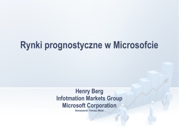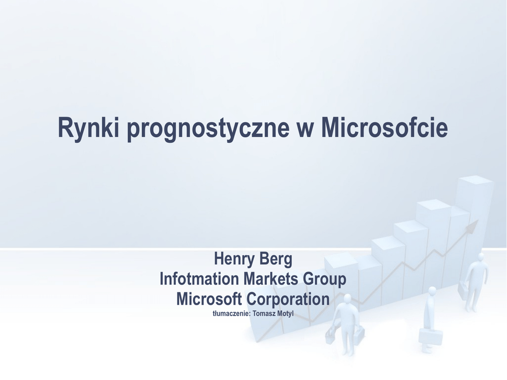 Rynki prognostyczne w Microsofcie Henry Berg Infotmation Markets Group Microsoft Corporation tłumaczenie: Tomasz Motyl Streszczenie ● ● Historia rynków prognostycznych w Microsofcie – Platformy – Rynki Wyciągnięte wnioski – Zachęty – Wyniki – Wnioski – Obawy Historia rynków prognostycznych w Microsofcie ● ● Information Forecasting Exchange (2003-2006) – Badania Microsoftu (Todd Proebsting) – Automatyczny fabrykant rynków (logarytniczny MSR Hansona) – Tekstowy interface rynków sieciowych PredictionPoint (2006-obecnie) – Strategia korporacji, w chwili obecnej: reklama i handel – Obstawianie w celu zmniejszenia barier użytkowych – Interface suwaka – Bez zapisów Rynki predykcyjne w Microsofcie ● ● ● ● ● Produkty grupy A – harmonogram – liczba błędów (bugs) Produkcty grupy B – harmonogram (x2) Produkcty grupy C – harmonogram (x2) Produkcty grupy D – harmonogram (x2) Produkcty grupy E – harmonogram ● ● ● ● Grupa finansowa F – marża brutto (x2) – sprzedaż detaliczna (x3) Produkcty grupy G – harmonogram (x5) Grupa finansowa H – zysk oraz EPS firm zewnętrznych – Zgłoszenia konkursów wewn. – Udział w konkursach wewn. Produkcty grupy I – Proces zatrudniania (x5) Zachęty do uczestnictwa ● Pieniądze ● Zamiana pieniędzy wirtualnych na losy ● Nagroda dla najlepszego tradera ● Wyróżnienie czołowej piątki lub dziesiątki ● Nie było problemów z płaceniem za nagrody ● Uniknięcie „tablicy liderów” z uwagi na obawy o działanie demotywujące Wynik rynków ● Trafność – – – ● Kontrowersje – – ● Rynki dotyczące harmonogramu miałby bardzo dużą celność, czasem wręcz niesamowitą. Wysoka cena oznacza niemal zawsze, że wydarzenie będzie miało miejsce. Inne rynki różniły się trafnością w zależności od wiedy i zaangażowania uczestników. Brak wystarczających danych do porównania (częsty brak innych predykcji). Niektóre rynki podważały zdanie kadry zarządzającej i zostały uznane za nieproduktywne. W skrajnym przypadku rynek został zamkniety przed spodziewanym końcem. Większość grup uznała rynki prognostyczne za interesujący eksperyment. Nie zdecydowano się jednak szersze wdrożenie rynków. Podsumowanie – – Ludziom podobało się uczestnictwo w rynkach i możliwość wypowiadzenia własnego zdania Możliwość eksperymentowania z rynkami do pomiarów rozmaitych rzeczy Badania a cele biznesowe ● ● Cele badawcze: – Przedstawienie koncepcji i mechanizmów rynków prognostycznych – Zademonstrowanie możliwości rynków predykcyjnych – Uzyskanie prognoz tam, gdzie wcześniej nie były one praktykowane Cele biznesowe: – Uczynienie rynków predykcyjnych łatwymi do korzystania i zakładania – Pogłębienie stopnia integeracji pracowników – Poprawienie jakości dotychczasowych prognoz – Wygenerowanie nowych prognoz Podsumowanie: wszystkie prognozy ● ● Grupy zaznajomione z metodami prognostycznymi – Doświadczenie we wdrażaniu rezultatów prognoz – Możliwość porównania prognoz – Częsty brak potrzeby poprawy istniejących metod – Obawy, że nowe metody mogą wywołać zakłócenia rytmu pracy Grupy bez wcześniejszych prognoz – Brak wiedzy o tym co prognozować i jak wykorzystać wyniki – Często chętni do wypróbowania rynków, ale zdystansowani do ich systematycznego zastosowania – Kontrowersyjne rynki mogą nie być powtórzone, a niekotrowersyjne ucierpieć z powodu braku zainteresowania – Czas od zamknięcia rynku do wręczenia nagrody jego liderom nie może być za długi. Podsumowanie: prognozy finansowe ● ● Zalety: – Prognozy finansowe stanowią podstawę biznesu – Dobrze zdefiniowany wynik i istniejące prognozy do porównania i stworzenia ram badania Wady: – Brak widocznej potrzeby usprawniania istniejących metod – Często niewielka wiedza trader'ów nt. istniejących prognoz – Rynki prognostyczne postrzegane jako szkodliwe dla wypracowanego sposobu postępowania i praktyk finansowych, zwłasza dla spółek notowanych na giełdzie – Uczestnicy nie zaznajomieni z szansami (prawdopodobieństwami) Podsumowanie: prognozy sprzedaży ● ● Zalety: – Prognozy finansowe są powszechną praktyką biznesową – Dobrze zdefiniowany wynik i istniejące predykcje do porównania – Kompetentni uczestnicy – Wiedza z różnych dziedzin wymaga agregacji Wady: – Działy sprzedaży są już przymuszani do pracowniczych gier by wzbudzić chęć rywalizacji lub dla zabawy – W wysoce stresogennym środowisku trudno wdrożyć nowe metody przewidywania bez bezpośredniego przełożenia na sprzedaż – Małe zainteresowanie nowymi technikami predykcyjnymi Podsumowanie: prognozy dotyczące harmonogramu ● ● Zalety: – Istniejące prognozy najczęściej są bardzo niedokładne. – Duże zainteresowanie i zaangażowanie uczestników. – Trafne prognozy rynków. Wady: – Obawa przed samospełniającą się przepowiednią opóźnień - jedna osoba mogłaby skutecznie opóźnić projekt. – Kompetentni menadżerowie niechętnie przyznają się do braku kontroli nad harmonogramem. – Rezultaty widoczne dla wszystkich uczestników, co może postawić kierownictwo średniego szczebla w niezręcznej sytuacji jeśli nie ma planu zaradczego. Łatwo zrobić dobrą prognozę i zniechęcić decydentów. – Rynki mogą być trudne w zaadaptowaniu. Gdy projekt jest na czas, nie ma potrzeby prowadzenia rynku, gdy jest zaś opóźniniony - nie ma czasu na uczestniczenie w nich. Jak najlepiej wykorzystywać wyniki? Podsumowanie: prognozy wydarzeń ● ● Zalety: – Wiele wydarzeń, którymi mogą być zainteresowani uczestnicy – Wydarzenia w stylu: jak przyjmie się produkt konkurencji są często ściśle powiązane wiedzą uczestników. Wady: – Obawa przed wyciekiem prognoz, które mogłyby postawić firmę w niekorzystnym świetle. – Wydarzenie budzące najwięcej zainteresowania najczę