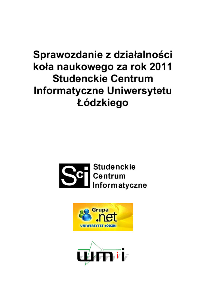Sprawozdanie z działalności koła naukowego za rok 2011 Studenckie Centrum Informatyczne Uniwersytetu Łódzkiego 22 stycznia 2011 - SCI zorganizowało konferencję “Linux w Łodzi #2” przy współpracy z: thecamels.org, oraz firmami: AMG.net, Teleca. Na konferencji pojawiło się kilkadziesiąt osób by wysłuchać następujących prezentacji: Automatyka domowa z wykorzystaniem projektów Open Source - (Home automation) - Filip Żyźniewski Portrety HPC - Daniel Rurarz, AMG.net Projekty Open Source - przegląd sposobów organizacji oraz źródeł finansowania Adam Walczak Vaadin - thinking of U and I - Arkadiusz Popa UŁ WMiI QT mobilnie, czyli Open Source w kilku smakach - Jacek Sandomierz, Teleca Środowisko PXE jako przyjemny zastępnik rescue cd, płyty instalacyjnej a nawet dysku twardego - Karol Kornatka Gdzie jest przyszłość Linuksa - Adrian Nowak, ubucentrum.net TOR - anonimowość w sieci - Łukasz Lisowski, SCI 14 marca 2011 - SCI zorganizowało konferencję “Zastosowanie informatyki w siłach zbrojnych RP”. Poniżej agenda wydarzenia: Podstawowe sieci teleinformatyczne w RON - płk mgr inż. Przemysław Michalak System reagowania na incydenty komputerowe MON. NATO Computer Incident Response Capability - płk mgr inż. Dariusz Osmulski System zarządzania bezpieczeństwem informacji - dr inż. Bartosz Orliński 5 kwietnia 2011 - odbyło się walne zebranie członków SCI 13 kwietnia 2011 - Łukasz Lisowski poprowadził wykład na “XI Festiwalu Nauki, Kultury i Sztuki” 1 czerwca 2011 - Łukasz Lisowski przedstawił prezentację na “Pikniku Technicznym z Informatyką+” 17 czerwca 2011 - na konferencji “Wieczór z Open Source” Łukasz Lisowski przedstawił prezentację “Opensource'owy silnik blogerski w ASP .NET” 8 grudnia 2011 - Łukasz Lisowski był przedstawicielem Uniwersytetu Łódzkiego na konferencji “Od studenta do specjalisty Business Intelligence” 9 grudnia 2011 - razem z kołem Triada, SCI zorganizowało “LAN-party” na naszym wydziale. Osoby obecne na spotkaniu mogły wspólnie zagrać w darmowe gry w sieci LAN stworzonej ze sprzętu udostępnionego przez SCI oraz Pracownię Informatyczną. 15-16 grudnia 2011 - sekcja SCI - grupa .NET Uniwersytetu Łódzkiego przy współpracy z Wydziałowymi Radami Samorządów Studenckich wydziałów Matematyki i Informatyki oraz Fizyki i Informatyki Stosowanej zorganizowała już po raz 6. konferencję “IT Academic Day na Uniwersytecie Łódzkim”. W tym roku było to wydarzenie wyjątkowe w skali kraju, ponieważ na żadnej innej uczelni nie było dwudniowej konferencji ITAD. Na portalu CodeGuru zarejestrowało się ponad 200 uczestników. Na konferencję przybyły osoby z poza uczelni, w tym uczniowie szkół średnich. Agenda: 15 grudnia - Wydział Matematyki i Informatyki Wprowadzenie (Keynote) innowacje w Microsoft (Katarzyna Pawlonka - Microsoft) Business Intelligence z wykorzystaniem narzędzi Microsoftu (Sławomir Kupiński AMG.net) Imagine Cup - informacje o konkursie Imagine Cup (CodeRaiders) RavenDB - dokumentowe bazy danych (Michał Śliwoń - ABB) HTML5 oraz IE9 - nowe technologie dla twórców WWW (Tomasz Wiśniewski Microsoft) Microsoft Dynamics AX i Sharepoint - potężne aplikacje biznesowe (Jarosław Jędrzejczak - Ericpol) Najważniejsze cechy ASP.NET MVC3 Razor na podstawie konwersji projektu ASP.NET do ASP.NET MVC3 Razor (Rafał Pietraszewski - Bankruptcy Management Solutions) 16 grudnia - Wydział Fizyki i Informatyki Stosowanej Integracja Microsoft Sharepoint z systemami PLM za pomocą Web Parts na przykładzie Windchill© PPMLink® Sharepoint Driving Cross Functional New Product Development (Transition Technologies) Getting started with Silverlight Application Development (Leszek Kantorek - Rule Financial) Windows Phone 7 - nowe możliwości (Piotr Fus - Mobica) Migrating Magic Unicorns - Entity Framework Code First Migrations (Rafał Legiędź - ABB) Dobre praktyki przy pisaniu aplikacji na Windows Phone 7 (Grzegorz Kolarz Comarch) Nie daj się zaskoczyć - MSSQL vs. Oracle (Mariusz Wieczorkiewicz - LSI) Centrum Kształcenia Multimedialnego prowadzone przez Oliwię Grambo, powstało w marcu z myślą o studentach, którzy są na specjalności Grafika komputerowa i projektowanie gier. CKM jest sekcją stworzoną przez studentów dla studentów, mającą na celu poszerzanie szeroko pojętych informacji na temat programów z dziedziny grafiki komputerowej, których student nie ma okazji poznać w toku studiów by po ukończeniu tego kierunku mógł konkurować i wyróżniać się na rynku pracy. Po utworzeniu CKM rozpoczęło regularne spotkania. Przez ten krótki okres czasu studenci nauczyli się: Modelowania 3d używając do tego darmowego oprogramowania - studenci modelowali trójwymiarowy model samochodu poznając technikę modelowania z rzutu. Poznali różnicę między Bump mappingiem a UV mappingiem wykorzystując tą wiedzę w praktyce. Po zaproszeniu Piotra Koska na spotkanie CKM studenci mogli poznać technikę tesselacji jak również obejrzeć w praktyce pracę animatora 3D. Od początku roku akademickiego 2011/2012 sekcja przeniosła się do sali multimedialnej, która umożliwiła znaczne poprawienie standardu zajęć oraz ułatwiła poznawanie programów. Dodatkowo zostały udostępnione tablety graficzne, dzięki czemu każdy miał okazję zaznajomić się z tym niezwykle istotnym urządzeniem oraz z dostępnym w sali multimedialnej programem "Photoshop". Od początku tego roku akademickiego CKM jest w trakcie tworzenia gry przeglądarkowej. Dzięki temu nie tylko każdy poszerza swoje umiejętności o dodatkowe aspekty, ale również uczymy się zarządzać własnym czasem jak i coraz częściej wymaganej przez pracodawców pracy w grupie. Projekt 'Wirtualny świat na Javie', realizowany przez członków Studenckiego Centrum Informatycznego, działającego przy Wydziale Matematyki i Informatyki UŁ oraz przy wsparciu Wydziałowej Rady Samorządu Student