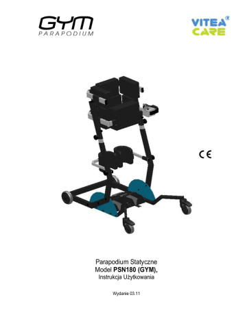 Parapodium Statyczne Model PSN180 (GYM), Instrukcja Użytkowania Wydanie 03.11 SPIS TREŚCI 1. INSTRUKCJA UŻYTKOWANIA ..................................................................................................................................... 3 1.1 OGÓLNE WARUNKI BEZPIECZEŃSTWA ................................................................................................................................ 3 1.2 INFORMACJE OGÓLNE ........................................................................................................................................................ 3 1.3 ZALETY PARAPODIUM STATYCZNEGO................................................................................................................................ 3 1.4 NAJCZĘSTSZE ZABURZENIA UKŁADOWE MOGĄCE WYSTĄPIĆ W TETRAPLEGII I PARAPLEGII ................................................ 3 1.5 PRZYGOTOWANIE PARAPODIUM DO UŻYTKOWANIA ............................................................................................................ 5 1.6 UŻYTKOWANIE PARAPODIUM.............................................................................................................................................. 7 1.7 PRZYKŁADOWY PROGRAM TRENINGOWY W OKRESIE ADAPTACJI ORGANIZMU DO URZĄDZENIA ......................................... 8 1.8 PRZENOSZENIE URZĄDZENIA ............................................................................................................................................. 9 1.9 PRZECHOWYWANIE, CZYSZCZENIE I KONSERWACJA PARAPODIUM..................................................................................... 9 1.10 ŚRODKI BEZPIECZEŃSTWA ...............................................................................................................................................10 1.11 OCHRONA ŚRODOWISKA ..................................................................................................................................................10 1.12 SERWIS OKRESOWY.........................................................................................................................................................10 1.13 WARUNKI GWARANCJI......................................................................................................................................................10 1.14 INSTRUKCJA GWARANCJI .................................................................................................................................................10 2 1. Instrukcja użytkowania 1.1 Ogólne warunki bezpieczeństwa Największą troską firmy mdh Sp. z o.o. jest zapewnienie bezpieczeństwa pacjentom użytkującym nasze urządzenia oraz wszystkim osobom wspomagającym naszych pacjentów i mającym kontakt z urządzeniem. Dla zapewnienia pełnego bezpieczeństwa użytkowników Parapodium Statycznego GYM model PSN180 należy bezwzględnie zastosować się do następujących zaleceń: 1. Przed przystąpieniem do jakichkolwiek prób użytkowania urządzenia dokładnie zapoznać się z treścią zawartą w instrukcji. 2. Upewnić się, że wszystkie informacje, zalecenia i ostrzeżenia są w pełni zrozumiałe. We wszystkich instrukcjach urządzeń produkowanych przez firmę mdh Sp. z o.o. znajdują się paragrafy oznaczone symbolami UWAGA, OSTRZEŻENIE i NIEBEZPIECZEŃSTWO, których zadaniem jest szczególne zwrócenie uwagi na treść, jaką zawierają. Znaczenie wyżej wymienionych symboli jest następujące: UWAGA. Symbol ten jest używany w celu wzmocnienia uwagi czytającego na treść oznaczoną tym symbolem. OSTRZEŻENIE. Symbol ten używany jest w przypadku opisu działania (wykonywania czynności), które jeśli nie zostanie wykonane prawidłowo, tj. zgodnie z zaleceniami instrukcji, może doprowadzić do zniszczenia urządzenia. NIEBEZPIECZEŃSTWO. Symbol ten używany jest w przypadku, gdy niezastosowanie się do zaleceń instrukcji dotyczących użytkowania urządzenia może spowodować bezpośrednie zagrożenie życia użytkownika lub poważne uszkodzenia ciała. 1.2 Informacje ogólne Instrukcja zawiera szczegółowe informacje o warunkach użytkowania Parapodium Statycznego GYM model PSN180. Parapodium Statyczne wydawane jest wyłącznie na podstawie opinii lekarskiej. Instrukcja przeznaczona jest dla użytkowników i osób sprawujących bezpośrednią opiekę nad użytkownikiem parapodium, terapeutów i lekarzy. Parapodium Statyczne model PSN180 jest urządzeniem mechanicznym przeznaczonym dla osób z porażeniem lub niedowładem kończyn dolnych. UWAGA. Jeżeli urządzenie użytkowane jest przez osoby pełnosprawne, producent nie ponosi odpowiedzialności za ewentualne fizyczne obrażenia lub zniszczenie urządzenia przez tego typu użytkowanie. 1.3 Zalety Parapodium Statycznego 1. 2. 3. 4. Możliwość pionizacji, czyli przyjmowanie pozycji wyprostowanej z korzystnym wymuszeniem pracy kończyn górnych, co powoduje: likwidację przykurczy stawowych i mięśniowych oraz spastyczności, prawidłowe odżywienie tkanki łącznej organizmu, zapobiega powstawaniu odleżyn, fizjologiczne obciążenie układu kostno-stawowego (narządu ruchu), fizjologiczną czynność (oraz rozmieszczenie w jamach ciała) narządów wewnętrznych (perystaltyka jelit – wypróżniane, normalizację mechanizmów mikcji – pęcherza neurogennego) i innych, normalizację pracy (czynności) układu sercowo-naczyniowego oraz oddechowego. Samodzielne, całkowicie bezpieczne i wygodne stanie bez użycia rąk (wolne ręce) przez wiele godzin (nawet podczas ewentualnego omdlenia pacjent pozostaje spionizowany). Stawianie wyzwań i wytyczanie nowych kolejnych celów wraz z ergoterapią (terapia pracą). Przygotowanie organizmu do użytkowania innych systemów ortezowych typu urządzeń lokomocyjnych służących do chodzenia w środowisku osób pełnosprawnych. Należy także pamiętać, że już samo przyjęcie pozycji wyprostowanej wiąże się z dodatkowym wys