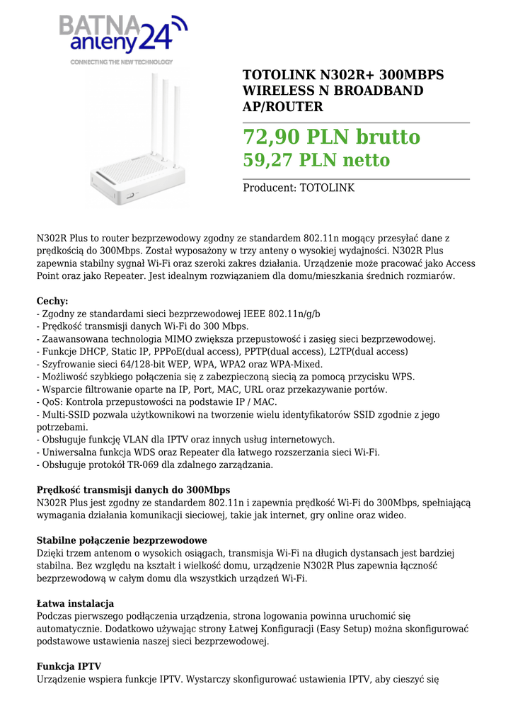 TOTOLINK N302R+ 300MBPS WIRELESS N BROADBAND AP/ROUTER 72,90 PLN brutto 59,27 PLN netto Producent: TOTOLINK N302R Plus to router bezprzewodowy zgodny ze standardem 802.11n mogący przesyłać dane z prędkością do 300Mbps. Został wyposażony w trzy anteny o wysokiej wydajności. N302R Plus zapewnia stabilny sygnał Wi-Fi oraz szeroki zakres działania. Urządzenie może pracować jako Access Point oraz jako Repeater. Jest idealnym rozwiązaniem dla domu/mieszkania średnich rozmiarów. Cechy: - Zgodny ze standardami sieci bezprzewodowej IEEE 802.11n/g/b - Prędkość transmisji danych Wi-Fi do 300 Mbps. - Zaawansowana technologia MIMO zwiększa przepustowość i zasięg sieci bezprzewodowej. - Funkcje DHCP, Static IP, PPPoE(dual access), PPTP(dual access), L2TP(dual access) - Szyfrowanie sieci 64/128-bit WEP, WPA, WPA2 oraz WPA-Mixed. - Możliwość szybkiego połączenia się z zabezpieczoną siecią za pomocą przycisku WPS. - Wsparcie filtrowanie oparte na IP, Port, MAC, URL oraz przekazywanie portów. - QoS: Kontrola przepustowości na podstawie IP / MAC. - Multi-SSID pozwala użytkownikowi na tworzenie wielu identyfikatorów SSID zgodnie z jego potrzebami. - Obsługuje funkcję VLAN dla IPTV oraz innych usług internetowych. - Uniwersalna funkcja WDS oraz Repeater dla łatwego rozszerzania sieci Wi-Fi. - Obsługuje protokół TR-069 dla zdalnego zarządzania. Prędkość transmisji danych do 300Mbps N302R Plus jest zgodny ze standardem 802.11n i zapewnia prędkość Wi-Fi do 300Mbps, spełniającą wymagania działania komunikacji sieciowej, takie jak internet, gry online oraz wideo. Stabilne połączenie bezprzewodowe Dzięki trzem antenom o wysokich osiągach, transmisja Wi-Fi na długich dystansach jest bardziej stabilna. Bez względu na kształt i wielkość domu, urządzenie N302R Plus zapewnia łączność bezprzewodową w całym domu dla wszystkich urządzeń Wi-Fi. Łatwa instalacja Podczas pierwszego podłączenia urządzenia, strona logowania powinna uruchomić się automatycznie. Dodatkowo używając strony Łatwej Konfiguracji (Easy Setup) można skonfigurować podstawowe ustawienia naszej sieci bezprzewodowej. Funkcja IPTV Urządzenie wspiera funkcje IPTV. Wystarczy skonfigurować ustawienia IPTV, aby cieszyć się telewizją IPTV oraz szybkim bezprzewodowym Internetem jednocześnie. Znakomita kontrola przepustowości z QoS QoS w oparciu o adres IP i MAC, skutecznie ułatwia zarządzanie wykorzystaniem pasma przez poszczególne urządzenia. Wiele sieci bezprzewodowych dla kontroli dostępu Poza domyślnym SSID sieci bezprzewodowej, można dodać dwie kolejne sieci Wi-Fi dla innych celów, np. dla gości z kontrolą dostępu. Zaawansowane zabezpieczenia sieci Wi-Fi N302R Plus obsługuje najbardziej zaawansowane szyfrowanie WPA / WPA2-PSK, aby zapewnić bezpieczeństwo połączenia bezprzewodowego, chroniąc sieć Wi-Fi przed nieautoryzowanym użyciem. Kontrola rodzicielska Harmonogram Wi-Fi pomaga rodzicom kontrolować czas korzystania z Internetu swoich dzieci. Dzięki harmonogramowi można ustalić w jakich dniach bądź godzinach dany komputer będzie miał dostęp do sieci bezprzewodowej. Cechy sprzętowe Interfejsy 4 porty 10/100Mbps LAN 1 port 10/100Mbps WAN Zasilanie 9V DC/0.5A Anteny 3 anteny o zysku 5dBi Przyciski 1 *RST/WPS Button Kontrolki LED 1 *Power, 1 *CPU, 1 *Wireless, 1 *WAN, 4 *LAN Wymiary (L x W x H) 144.0 x 95.4.0 x 25.0 mm Cechy sieci bezprzewodowej Standardy IEEE 802.11n, IEEE 802.11g, IEEE 802.11b Częstotliwość pracy 2.4~2.4835GHz 802.11n: do 300Mbps Prędkość transmisji danych 802.11g: do 54Mbps (dynamic) 802.11b: do 11Mbps (dynamic) EIRP < 20dBm Zabezpieczenia sieci 64/128-bit WEP, WPA/WPA2, WPA-PSK/WPA2-PSK (TKIP/AES) 270M: -61 dBm@10% PER 135M: -65 dBm@10% PER Czułość 54M: -68 dBm@10% PER 11M: -85 dBm@8% PER 6M: -88 dBm@10% PER 1M: -90 dBm@8% PER Oprogramowanie Bezprzewodowy klient ISP Router Bezprzewodowy klient Tryby pracy Repeater(Range Extender) Router Most z AP Klient Sieć VLAN, IPv6 Typ WAN DHCP/Static IP/PPPoE(dual access)/PPTP(dual access) /L2TP Funkcje sieci bezprzewodowej Multiple SSID, MAC Authentication, Universal Repeater, WDS, WPS Harmonogram Restartu urządzenia , Dostępu do sieci Wi-Fi Firewall MAC Filtering, IP Filtering, Port Filtering, URL Filtering, Port Forwarding, DMZ Zarządzanie Firmware Upgrade, QoS, TR-069 config, DDNS, Access Control N302R Plus *1 Opakowanie zawiera Zasilacz *1 Kabel sieciowy*1 Instrukcja obsługi *1 Operating Temperature: 0℃~40 ℃ Storage Temperature: -40℃~70 ℃ Environment Operating Humidity: 10%~90% non-condensing Storage Humidity: 5%~90% non-condensing