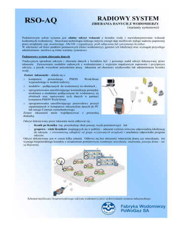 RSO-AQ RADIOWY SYSTEM ZBIERANIA DANYCH Z WODOMIERZY (warianty systemowe) Podstawowym celem systemu jest zdalny odczyt wskazań z licznika wody i zaewidencjonowanie wskazań konkretnych wodomierzy. Stosowana technologia niskiego zużycia energii daje możliwość stałego nadzoru poprawnej pracy urządzenia (np. monitoringu 24h/24h i sygnalizację prób odłączenia lub zatrzymania licznika). W zależności od ilości punktów pomiarowych (ilości wodomierzy), gęstości ich lokalizacji oraz wymagań przyszłego administratora możliwe są różne warianty systemowe. Podstawowy system zbierania danych Tradycyjnym sposobem odczytu i zbierania danych z liczników był i pozostaje nadal odczyt dokonywany przez inkasenta. Zastosowanie modułów radiowych z wodomierzami z wyjściem impulsowym usprawnia i przyśpiesza odczyty, a przede wszystkim uniezależnia pracę inkasenta od obecności użytkownika lub administratora licznika wody. Zestaw inkasencki – składa się z: o komputera przenośnego PSION WorkAbout wyposażonego w modem radiowy, o modułów – podłączanych do wodomierzy na obiektach , o oprogramowania umożliwiającego komunikację pomiędzy modemem a modułami podłączonymi do wodomierzy na obiektach oraz zapisywanie tych danych w pamięci komputera PSION WorkAbout, o oprogramowania umożliwiającego przewodowy przesył zapamiętanych w komputerze inkasenckim danych do PC lub innego Centrum rozrachunkowego. Zestaw inkasencki może współpracować z przenośną drukarką. Odczyt dokonywany przez inkasenta może odbywać się : - licznik po liczniku (np. przechodząc obok posesji, węzła pomiarowego) lub - grupowo - wiele liczników znajdujących się w pobliżu – inkasent wybiera wówczas odpowiednią lokalizację do odczytu ( równomierną odległość od grupy sczytywanych urządzeń) i uruchamia odpowiedni program odczytu. Odczyt dokonywany jest w czasie kilku sekund. Odbywa się bez obecności właściciela domu czy mieszkania, nie wymaga bezpośredniego kontaktu z urządzeniem pomiarowym (zamknięte mieszkanie, studzienka, posesja domu – nie są kłopotem). Schemat możliwości bezprzewodowego odczytu wodomierzy przy wykorzystaniu zestawu inkasenckiego. Stacjonarny system zbierania danych. W przypadku instalacji charakteryzujących się rozproszonymi po gminie, dzielnicy punktami pomiarowymi np. oddalone od siebie budynki mieszkalne, oddalone osiedla, dzielnice segmentów lub domków mieszkalnych, gdzie inkasent traci wiele czasu na przemieszczanie się pomiędzy punktami pomiarowymi proponowany jest Stacjonarny system zbierania danych z wykorzystaniem koncentratora. Koncentrator –spełnia rolę urządzenia zbierającego dane z jednostkowych punktów pomiarowych, gromadzącego, a następnie w formie „paczki danych” udostępniającego je do odczytu za pomocą zestawu inkasenckiego lub telefonu - w przypadku koncentratora z przystawką GSM ( odczyt mieszkań w bloku, w budynkach instytucji , firm itp). Opis procedury odczytu: Koncentrator umieszczany jest w miejscu zapewniającym komunikację ze wszystkimi współpracującymi z nim modułami. Łączność pomiędzy urządzeniami (odczyt zużycia) następuję w technologii LINK. Koncentrator w zależności od modelu zapewnia połączenie z zewnętrznym komputerem poprzez: - modem-bramkę GSM, - modem radiowy większej mocy, - zestaw inkasencki. Uwzględniając potrzeby i wymagania przyszłych użytkowników systemu nasza firma opracuje optymalny wariant systemu odczytu wodomierzy z administrowanego obszaru . Schemat możliwości bezprzewodowego odczytu wodomierzy przy wykorzystaniu koncentratora. ul. Klemensa Janickiego 23/25, 60-542 Poznań, tel. 061 8474401,fax 061 8472548 http://www.powogaz.com.pl e-mail:[email protected]