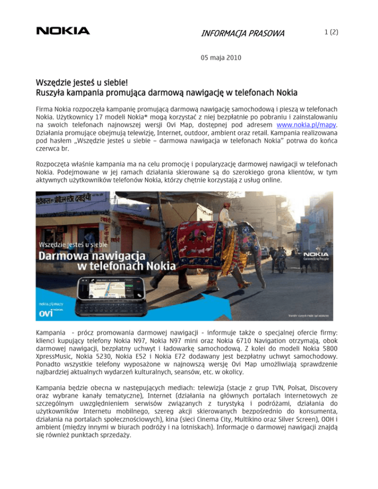INFORMACJA PRASOWA 1 (2) 05 maja 2010 Wszędzie jesteś u siebie! Ruszyła kampania promująca darmową nawigację w telefonach Nokia Firma Nokia rozpoczęła kampanię promującą darmową nawigację samochodową i pieszą w telefonach Nokia. Użytkownicy 17 modeli Nokia* mogą korzystać z niej bezpłatnie po pobraniu i zainstalowaniu na swoich telefonach najnowszej wersji Ovi Map, dostępnej pod adresem www.nokia.pl/mapy. Działania promujące obejmują telewizję, Internet, outdoor, ambient oraz retail. Kampania realizowana pod hasłem „Wszędzie jesteś u siebie – darmowa nawigacja w telefonach Nokia” potrwa do końca czerwca br. Rozpoczęta właśnie kampania ma na celu promocję i popularyzację darmowej nawigacji w telefonach Nokia. Podejmowane w jej ramach działania skierowane są do szerokiego grona klientów, w tym aktywnych użytkowników telefonów Nokia, którzy chętnie korzystają z usług online. Kampania - prócz promowania darmowej nawigacji - informuje także o specjalnej ofercie firmy: klienci kupujący telefony Nokia N97, Nokia N97 mini oraz Nokia 6710 Navigation otrzymają, obok darmowej nawigacji, bezpłatny uchwyt i ładowarkę samochodową. Z kolei do modeli Nokia 5800 XpressMusic, Nokia 5230, Nokia E52 i Nokia E72 dodawany jest bezpłatny uchwyt samochodowy. Ponadto wszystkie telefony wyposażone w najnowszą wersję Ovi Map umożliwiają sprawdzenie najbardziej aktualnych wydarzeń kulturalnych, seansów, etc. w okolicy. Kampania będzie obecna w następujących mediach: telewizja (stacje z grup TVN, Polsat, Discovery oraz wybrane kanały tematyczne), Internet (działania na głównych portalach internetowych ze szczególnym uwzględnieniem serwisów związanych z turystyką i podróżami, działania do użytkowników Internetu mobilnego, szereg akcji skierowanych bezpośrednio do konsumenta, działania na portalach społecznościowych), kina (sieci Cinema City, Multikino oraz Silver Screen), OOH i ambient (między innymi w biurach podróży i na lotniskach). Informacje o darmowej nawigacji znajdą się również punktach sprzedaży. INFORMACJA PRASOWA 2 (2) 05 maja 2010 Globalna kreacja kampanii została zaadaptowana na rynek polski przez JWT Warszawa. Kampanię internetową przygotowała agencja interaktywna Wunderman, a zakupem mediów zajął się dom mediowy Carat. O darmowej darmowej nawigacji w telefonach Nokia Nowa wersja Ovi Map zawiera wszystkie niezbędne funkcje nawigacji samochodowej i pieszej, takie jak wskazówki głosowe na każdym zakręcie w 74 krajach i 46 językach oraz informacje o ruchu drogowym w ponad 10 krajach, a także szczegółowe mapy ponad 180 państw. Począwszy od marca 2010 roku, wszystkie nowe smarftony Nokia z GPS zawierają nową wersję Ovi Map, z zainstalowanymi fabrycznie mapami krajów lokalnych, z wysokiej klasy funkcjami nawigacji pieszej i samochodowej oraz dostępem do przewodników Lonely Planet i Michelin bez żadnych dodatkowych kosztów. O popularności aplikacji Ovi Maps świadczy fakt, że w ciągu zaledwie 3 miesięcy została pobrana przez 10 milionów użytkowników Nokia na całym świecie. *) Aktualna lista kompatybilnych urządzeń Nokia: Nokia 97, Nokia N97 mini, Nokia N97 Gold Edition, Nokia 5800 XpressMusic, Nokia 5800 Navigation Edition, Nokia C5, Nokia E52, Nokia E55, Nokia E66, Nokia E71, Nokia E72, Nokia N86 8 MP, Nokia 5230, Nokia 6710 Navigator, Nokia 6720 classic, Nokia 6730 classic i Nokia X6. Najnowszą listę urządzeń można sprawdzić pod adresem www.nokia.pl/mapy. O firmie Nokia Firma Nokia stawia sobie na cel łączenie ludzi. Tworzymy zaawansowane technologie i spersonalizowane serwisy, które umożliwiają naszym użytkownikom dostęp do tego, co dla nich najważniejsze. Każdego dnia ponad 1,2 mld ludzi kontaktuje się ze sobą dzięki urządzeniom Nokia – korzystając z telefonów komórkowych, zaawansowanych smartfonów lub wyspecjalizowanych komputerów mobilnych. Obecnie firma Nokia oferuje szerokie portfolio produktów wzbogaconych o innowacyjne usługi dostępne poprzez platformę Ovi (www.ovi.com). Wśród nich wymienić można muzykę, mapy, aplikacje mobile, pocztę email i wiele innych. Ponadto należąca do Nokia firma NAVTEQ jest liderem wszechstronnych map cyfrowych i usług nawigacyjnych, a Nokia Siemens Networks dostarcza sprzęt, rozwiązania i usługi operatorom sieci telekomunikacyjnych. Kontakt dla mediów: Małgorzata Kuzia +48 (0) 605 045 309 +48 (22) 646 22 02 ext. 130 [email protected] www.nokia.pl