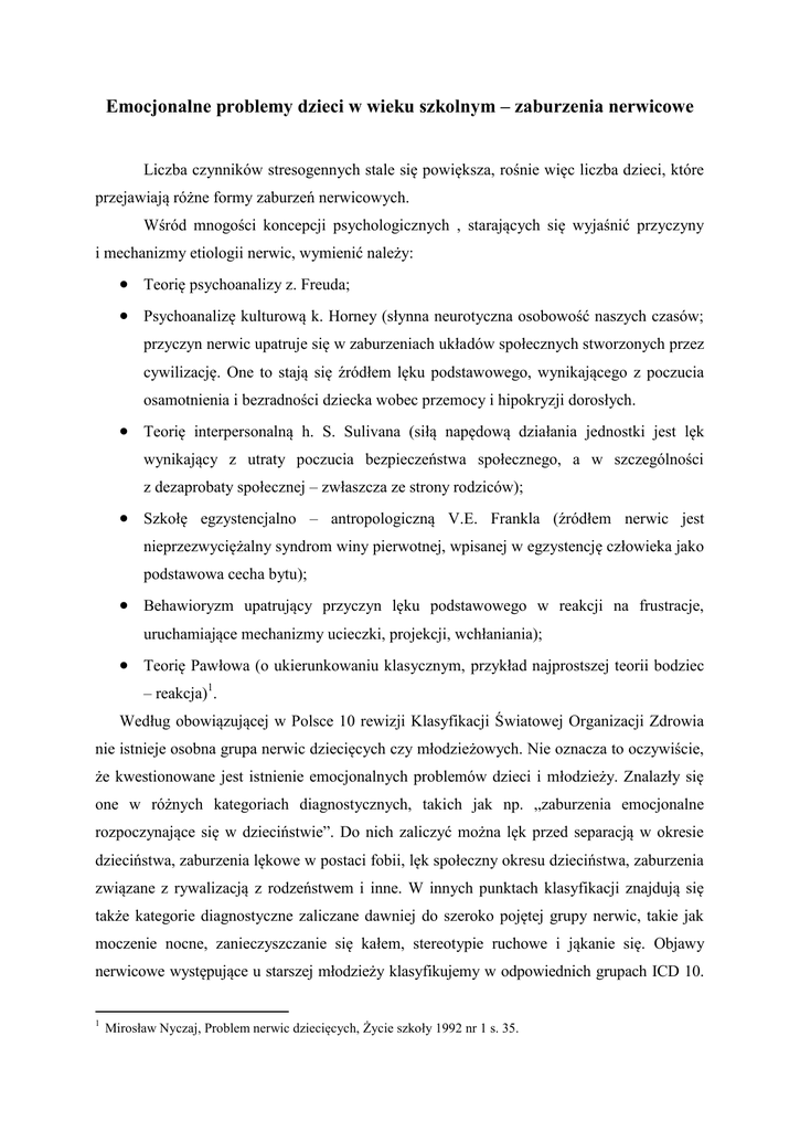 Emocjonalne problemy dzieci w wieku szkolnym – zaburzenia nerwicowe Liczba czynników stresogennych stale się powiększa, rośnie więc liczba dzieci, które przejawiają różne formy zaburzeń nerwicowych. Wśród mnogości koncepcji psychologicznych , starających się wyjaśnić przyczyny i mechanizmy etiologii nerwic, wymienić należy: Teorię psychoanalizy z. Freuda; Psychoanalizę kulturową k. Horney (słynna neurotyczna osobowość naszych czasów; przyczyn nerwic upatruje się w zaburzeniach układów społecznych stworzonych przez cywilizację. One to stają się źródłem lęku podstawowego, wynikającego z poczucia osamotnienia i bezradności dziecka wobec przemocy i hipokryzji dorosłych. Teorię interpersonalną h. S. Sulivana (siłą napędową działania jednostki jest lęk wynikający z utraty poczucia bezpieczeństwa społecznego, a w szczególności z dezaprobaty społecznej – zwłaszcza ze strony rodziców); Szkołę egzystencjalno – antropologiczną V.E. Frankla (źródłem nerwic jest nieprzezwyciężalny syndrom winy pierwotnej, wpisanej w egzystencję człowieka jako podstawowa cecha bytu); Behawioryzm upatrujący przyczyn lęku podstawowego w reakcji na frustracje, uruchamiające mechanizmy ucieczki, projekcji, wchłaniania); Teorię Pawłowa (o ukierunkowaniu klasycznym, przykład najprostszej teorii bodziec – reakcja)1. Według obowiązującej w Polsce 10 rewizji Klasyfikacji Światowej Organizacji Zdrowia nie istnieje osobna grupa nerwic dziecięcych czy młodzieżowych. Nie oznacza to oczywiście, że kwestionowane jest istnienie emocjonalnych problemów dzieci i młodzieży. Znalazły się one w różnych kategoriach diagnostycznych, takich jak np. „zaburzenia emocjonalne rozpoczynające się w dzieciństwie”. Do nich zaliczyć można lęk przed separacją w okresie dzieciństwa, zaburzenia lękowe w postaci fobii, lęk społeczny okresu dzieciństwa, zaburzenia związane z rywalizacją z rodzeństwem i inne. W innych punktach klasyfikacji znajdują się także kategorie diagnostyczne zaliczane dawniej do szeroko pojętej grupy nerwic, takie jak moczenie nocne, zanieczyszczanie się kałem, stereotypie ruchowe i jąkanie się. Objawy nerwicowe występujące u starszej młodzieży klasyfikujemy w odpowiednich grupach ICD 10. 1 Mirosław Nyczaj, Problem nerwic dziecięcych, Życie szkoły 1992 nr 1 s. 35. Są to najczęściej: zaburzenia lękowe, napady paniki, zaburzenia obsesyjno – kompulsywne (nerwica natręctw), zaburzenia konwersacyjne i dysocjacyjne (dawniej histeria).osobnym problemem jest sprawa relacji nerwic wieku rozwojowego i nerwic osób dorosłych. Istnieje zgodność, że brak jest ciągłości pomiędzy obiema grupami zaburzeń nerwicowych2. Wśród czynników powodujących różne rodzaje nerwic dziedziczność oraz cechy osobowości nikną wobec czynników środowiskowych. Przede wszystkim należy tu wymienić klimat emocjonalny rodziny, w której dziecko się wychowuje, a następnie sytuację szkolną dziecka. Te dwa środowiska odgrywają ogromną rolę w etiologii nerwic dziecięcych. Dziecko nie potrafi uciec ani od sytuacji konfliktowej w rodzinie, ani od trudności w szkole. Reakcja dziecka znerwicowanego na konflikt jest silniejsza niż dziecka zdrowego. Nadmiernie silna reakcja na sytuację konfliktową powoduje silne reakcje otoczenia, co prowadzi do powstania nowych konfliktów. W ten sposób u dziecka nerwicowego rozwija się reakcja łańcuchowa, która musi być w danym momencie przerwana, jeżeli dziecko ma się nauczyć reagować prawidłowo. Brak możliwości zaspokojenia w pełni potrzeb psychicznych w domu, poczucie zagrożenia, tłumienie uczuć powodują u dziecka omawiane zaburzenia emocjonalne. W momencie rozpoczęcia nauki szkolnej i wobec rozmaitych wymagań społecznych, jakie stawia środowisko szkolne, zapoczątkowane w domu rodzinnym cechy nerwicowe osobowości nasilają się i rozszerzają. Łatwo wówczas dochodzi do zwiększenia się uczucia lęku i niepokoju, to jest do rozwoju nerwic z ujawnieniem się objawów nerwicowych, za pomocą których dziecko usiłuje opanować narastający lęk3. Większość autorów zajmujących się opisem nerwic dziecięcych przyjmuje podział na: nerwice narządowe, lękowe, obsesyjne i histeryczne. Istnieją pewne objawy i ich zespoły typowe dla dzieci nerwicowych . Zaliczyć tu można: wzmożoną ruchliwość i nadpobudliwość przejawiającej się przede wszystkim w sferze motorycznej, tiki nerwowe, wymioty, moczenie nocne. Kolejnym zjawiskiem symptomatyczny w przypadku zaburzeń emocjonalnych u dzieci jest nerwica lękowa, która obejmuje całą osobowość. Stopień nasilenia lęku jest różny – od najczęściej występujących fobii aż do ostrych stanów lękowych. Istnieje rodzaj lęku, który jest biologicznie uzasadniony i który chroni organizm przed realnymi niebezpieczeństwami. W przypadku nerwic lękowych chodzi o nieadekwatne do obiektywnej sytuacji stany niepokoju4. 2 3 4 Irena Namysłowska, Nerwice szkolne, Problemy Opiekuńczo – Wychowawcze 1998 nr 5 s. 7. Magdalena Ligocka, Trudności w nauce dzieci znerwicowanych, Edukacja i Dialog 1999 nr 4 s. 33-34. Tamże s. 336-37. 2 Fobia szkolna jest klasycznym przykładem fobii sytuacyjnej, ponieważ dziecko odczuwa lęk nie przed szkołą rozumianą jako całość, ale przed konkretnymi sytuacjami, które mają miejsce w szkole. Fobię szkolną określa się jako nerwicę szkolną, która stanowi zróżnicowany pod względem etiologicznym zespół, będący często formą nerwicy lękowej, którego wiodącym objawem jest obawa przed uczęszczaniem do szkoły, przy czym przed każdym udaniem się do niej i w czasie pobytu w szkole pojawiają się u dziecka przejawy lęku. Na podkreślenie zasługuje fakt, że psychologiczne objawy lęku w tym zespole są często maskowane przez bogatą symptomatologię wegetatywną (bóle głowy, drżenie rąk, nudności, wymioty, bóle brzucha, biegunki, duszn