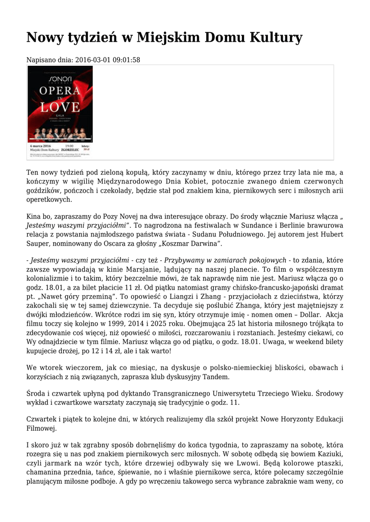 Nowy tydzień w Miejskim Domu Kultury Napisano dnia: 2016-03-01 09:01:58 Ten nowy tydzień pod zieloną kopułą, który zaczynamy w dniu, którego przez trzy lata nie ma, a kończymy w wigilię Międzynarodowego Dnia Kobiet, potocznie zwanego dniem czerwonych goździków, pończoch i czekolady, będzie stał pod znakiem kina, piernikowych serc i miłosnych arii operetkowych. Kina bo, zapraszamy do Pozy Novej na dwa interesujące obrazy. Do środy włącznie Mariusz włącza „ Jesteśmy waszymi przyjaciółmi”. To nagrodzona na festiwalach w Sundance i Berlinie brawurowa relacja z powstania najmłodszego państwa świata - Sudanu Południowego. Jej autorem jest Hubert Sauper, nominowany do Oscara za głośny „Koszmar Darwina”. - Jesteśmy waszymi przyjaciółmi - czy też - Przybywamy w zamiarach pokojowych - to zdania, które zawsze wypowiadają w kinie Marsjanie, lądujący na naszej planecie. To film o współczesnym kolonializmie i to takim, który bezczelnie mówi, że tak naprawdę nim nie jest. Mariusz włącza go o godz. 18.01, a za bilet płacicie 11 zł. Od piątku natomiast gramy chińsko-francusko-japoński dramat pt. „Nawet góry przeminą”. To opowieść o Liangzi i Zhang - przyjaciołach z dzieciństwa, którzy zakochali się w tej samej dziewczynie. Ta decyduje się poślubić Zhanga, który jest majętniejszy z dwójki młodzieńców. Wkrótce rodzi im się syn, który otrzymuje imię - nomen omen – Dollar. Akcja filmu toczy się kolejno w 1999, 2014 i 2025 roku. Obejmująca 25 lat historia miłosnego trójkąta to zdecydowanie coś więcej, niż opowieść o miłości, rozczarowaniu i rozstaniach. Jesteśmy ciekawi, co Wy odnajdziecie w tym filmie. Mariusz włącza go od piątku, o godz. 18.01. Uwaga, w weekend bilety kupujecie drożej, po 12 i 14 zł, ale i tak warto! We wtorek wieczorem, jak co miesiąc, na dyskusje o polsko-niemieckiej bliskości, obawach i korzyściach z nią związanych, zaprasza klub dyskusyjny Tandem. Środa i czwartek upłyną pod dyktando Transgranicznego Uniwersytetu Trzeciego Wieku. Środowy wykład i czwartkowe warsztaty zaczynają się tradycyjnie o godz. 11. Czwartek i piątek to kolejne dni, w których realizujemy dla szkół projekt Nowe Horyzonty Edukacji Filmowej. I skoro już w tak zgrabny sposób dobrnęliśmy do końca tygodnia, to zapraszamy na sobotę, która rozegra się u nas pod znakiem piernikowych serc miłosnych. W sobotę odbędą się bowiem Kaziuki, czyli jarmark na wzór tych, które drzewiej odbywały się we Lwowi. Będą kolorowe ptaszki, chamanina przednia, tańce, śpiewanie, no i właśnie piernikowe serca, które polecamy szczególnie planującym miłosne podboje. A gdy po wręczeniu takowego serca wybrance zabraknie wam weny, co dalej robić... Też mamy dla Was propozycję! Zaproście ją (jego) do MDK w niedzielę. Na godzinę 19 zaprasza międzynarodowa grupa operowa Sonori Ensemble, która gwarantuje niezapomniany wieczór z operą i operetką. Bilety po 30 zł, a w zamian można będzie usłyszeć przeboje operetkowe oraz barwne sceny operowe z dzieł najsłynniejszych kompozytorów m. in. Mozarta, Rossiniego, Verdiego, Pucciniego, Delibesa, Gounoda, Offenbacha, Straussa, Kalmana, Gershwina i innych. Słuchaczy z pewnością uwiedzie nastrojowy Duetu Kwiatów, żartobliwa Aria Lalki, uwodzicielska Carmen, zabawne postacie Zemsty Nietoperza, Barona Cygańskiego i wielu innych. Zaśpiewają: Agnieszka Drożdżewska (sopran, Wrocław), Barbara Spitzer (sopran, Wiedeń), Anna Wilczyńska (sopran, Wrocław), Izabela Strzelecka (mezzosopran, Wrocław), Tomasz Tracz (tenor, Wrocław), Ivo Michl (baryton, Praga), Witold Janusz (fortepian, Wrocław). Prowadzenie Martyna Witowska (Teatr Ad Spectatores, Wrocław). Źródło: MDK