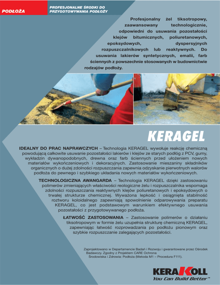 POD¸O˚A PROFESJONALNE ÂRODKI DO PRZYGOTOWYWANIA POD¸O˚Y Profesjonalny żel tiksotropowy, zaawansowany technologicznie, odpowiedni do usuwania pozostałości klejów bitumicznych, poliuretanowych, epoksydowych, dyspersyjnych rozpuszczalnikowych lub reaktywnych. Do usuwania lakierów syntetycznych, emalii, farb ściennych z powszechnie stosowanych w budownictwie rodzajów podłoży. KERAGEL IDEALNY DO PRAC NAPRAWCZYCH – Technologia KERAGEL wywołuje reakcję chemiczną powodującą całkowite usuwanie pozostałości lakierów i klejów ze starych podłóg z PCV, gumy, wykładzin dywanopodobnych, drewna oraz farb ściennych przed ułożeniem nowych materiałów wykończeniowych i dekoracyjnych. Zastosowanie mieszaniny składników organicznych o dużej zdolności rozpuszczania zapewnia odzyskanie pierwotnych walorów podłoża do pewnego i szybkiego układania nowych materiałów wykończeniowych. TECHNOLOGICZNA AWANGARDA – Technologia KERAGEL dzięki zastosowaniu polimerów zmieniających właściwości reologiczne żelu i rozpuszczalnika wspomaga zdolności rozpuszczania reaktywnych klejów poliuretanowych i epoksydowych o trwałej strukturze chemicznej. Wyważona lepkość i osiągnięta stabilność roztworu koloidalnego zapewniają spowolnienie odparowywania preparatu KERAGEL, co jest podstawowym warunkiem efektywnego usuwania pozostałości z przygotowywanego podłoża. ŁATWOŚĆ ZASTOSOWANIA – Zastosowanie polimerów o działaniu tiksotropowym w formie żelu uzupełnia strukturę chemiczną KERAGEL, zapewniając łatwość rozprowadzania po podłożu pionowym oraz szybkie rozpuszczanie zalegających pozostałości. Zaprojektowano w Departamencie Badań i Rozwoju i gwarantowane przez Ośrodek Badawczy. Zgodny z Projektem CARE Ochrona Środowiska i Zdrowia: Podłoża (Metoda M1 – Procedura F111). KERAGEL ZASTOSOWANIE Tiksotropowy żel zawierający rozpuszczalniki do usuwania pozostałości klejów bitumicznych, dwuskładnikowych klejów reaktywnych, dyspersyjnych i rozpuszczalnikowych. Usuwa lakiery syntetyczne, emalie i farby ścienne. Produkty usuwalne: - dwuskładnikowe kleje epoksydowe i poliuretanowe - dwuskładnikowe epoksydowe zaprawy do fugowania - uszczelniacze poliuretanowe - kleje na bazie żywic w dyspersji wodnej lub w roztworach rozpuszczalnikowych - kleje bitumiczne - lakiery syntetyczne, farby ścienne, emalie Przeznaczenie użytkowe Do wewnątrz i na zewnątrz, na podłoża nasiąkliwe i nienasiąkliwe. Nie używać Do usuwania pozostałości cementu lub wapna, czyszczenia powierzchni zaolejonych, zabrudzonych tłuszczem lub pochodnymi ropy naftowej, materiałów nieodpornych na oddziaływanie rozpuszczalników, do zmywania powierzchni gumowych, PCV i lakierowanego drewna. PRZYGOTOWANIE PODŁOŻA Podłoża powinny być odpylone, pozbawione części kruchych i oddzielających się. Należy dokładnie usunąć mechanicznie wszystkie powłoki malarskie i kleje nie przylegające do podłoża. Za pomocą specjalnych rozpuszczalników, kwasowych lub zasadowych, zmyć ewentualne pozostałości cementu i tłuszczu, których nie usunął preparat KERAGEL. SPOSÓB UŻYCIA Przygotowanie KERAGEL jest gotowy do użytku i nie powinien być rozcieńczany wodą, innymi cieczami bądź rozpuszczalnikami. Wymieszać KERAGEL w opakowaniu metalową szpachelką dla ujednorodnienia mieszaniny i rozproszenia rozpuszczalnika osadzającego się przy powierzchni. Zabezpieczyć wszystkie powierzchnie nieodporne na działanie rozpuszczalnika. Założyć gumowe rękawice, maskę zabezpieczającą drogi oddechowe oraz profesjonalne okulary. Podczas wykonywania prac oraz po ich zakończeniu należy zawsze przewietrzyć pomieszczenie. Nie palić. Nakładanie KERAGEL rozprowadza się równomiernie po podłożu przy pomocy metalowej pacy, całkowicie pokryć materiał przeznaczony do usunięcia. Zaleca się, aby wewnątrz pomieszczeń nie nakładać dużych ilości żelu, dla uniknięcia koncentracji rozpuszczalnika w powietrzu, lecz powtarzać zabieg kilkakrotnie. Czas oczekiwania na reakcję produktu przed mechanicznym usuwaniem pozostałości może się znacznie różnić w zależności od właściwości materiału. Należy wykonywać próby usuwania pozostałości co ≈ 10 – 15 minut. W przypadku klejów mocno przylegających powtórzyć nakładanie środka na najbardziej trudno usuwalne części. Po usunięciu wszystkich pozostałości zmyć podłoże ciepłą wodą z dodatkiem sody kaustycznej a następnie obficie spłukać. Czyszczenie Pozostałości KERAGEL zmywa się z narzędzi wodą przed całkowitym stwardnieniem produktu. INNE WSKAZÓWKI KERAGEL nie może być nakładany bezpośrednio na nasiąkliwe podłoża takie jak tynki, podłoża cementowe, podłoża na bazie gipsu, parkiet czy płyty wiórowe. W przypadku zastosowania na wyżej wymienionych podłożach należy usunąć mechanicznie warstwę spenetrowaną przez żel. KERAGEL zawiera substancje, które nie pozwalają na przyleganie żadnego innego kleju. WZÓR INFORMACJI TECHNICZNEJ DLA PROJEKTANTÓW Usuwanie pozostałości klejów organicznych i bitumicznych, lakierów, farb i emalii, winno być realizowane przy pomocy profesjonalnego, tiksotropowego żelu zawierającego rozpuszczalniki o wysokiej technologii na przykład KERAGEL, produktu Kerakoll. Nakładać jednorodnie na całą oczyszczaną powierzchnię, usunąć pozostałości mechanicznie i zmyć powierzchnię obfitą ilością wody. Średnia wydajność ≈ 0,2 – 0,3 kg/m 2. DANE CHARAKTERYSTYCZNE Wygląd Ciężar właściwy CARE Przechowywanie Uwagi Opakowanie Pasta o konsystencji żelu ≈ 1,19 kg/dm3 Metoda M3 – Procedura F111 ≈ 12 miesięcy w oryginalnym opakowaniu Chronić przed bezpośrednim nasłonecznieniem Przechowywać w temperaturze nie przekraczającej +30 °C Wiadra 5 kg DANE TECHNICZNE wg Normy Jakości Kerakoll Lepkość Temperatura użycia Oddziaływanie: - na kleje wodne i rozpuszczalnikowe - na reaktywne kleje dwuskładnikowe Wydajnoś