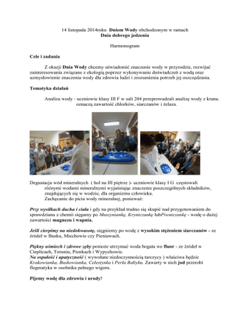 14 listopada 2014roku Dniem Wody obchodzonym w ramach Dnia dobrego jedzenia Harmonogram Cele i zadania Z okazji Dnia Wody chcemy uświadomić znaczenie wody w przyrodzie, rozwijać zainteresowania związane z ekologią poprzez wykonywanie doświadczeń z wodą oraz uzmysłowienie znaczenia wody dla zdrowia ludzi i zrozumienia potrzeb jej oszczędzania. Tematyka działań Analiza wody - uczniowie klasy III F w sali 204 przeprowadzali analizę wody z kranu. oznaczą zawartość chlorków, siarczanów i żelaza. Degustacja wód mineralnych ( hol na III piętrze )- uczniowie klasy I G częstowali różnymi wodami mineralnymi wyjaśniając znaczenie poszczególnych składników, znajdujących się w wodzie, dla organizmu człowieka. Zachęcanie do picia wody mineralnej, ponieważ: Przy wysiłkach ducha i ciała i gdy na przykład trudno się skupić nad przygotowaniem do sprawdzianu z chemii sięgamy po Muszyniankę, Kryniczankę lubPiwniczankę - wodę o dużej zawartości magnezu i wapnia. Jeśli cierpimy na niedokwasotę, sięgniemy po wodę z wysokim stężeniem siarczanów - ze źródeł w Busku, Miechowie czy Pieniawach. Piękny uśmiech i zdrowe zęby pomoże utrzymać woda bogata we fluor - ze źródeł w Cieplicach, Toruniu, Pionkach i Wypychowie. Na ospałość i apatyczność ( wywołane niedoczynnością tarczycy ) właściwa będzie Krakowianka, Buskowianka, Celestynka i Perła Bałtyku. Zawarty w nich jod przerobi flegmatyka w osobnika pełnego wigoru. Pijemy wodę dla zdrowia i urody! Plakaty