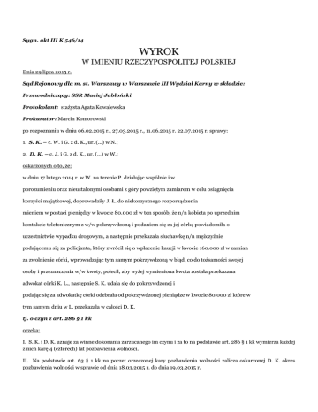 Sygn. akt III K 546/14 WYROK W IMIENIU RZECZYPOSPOLITEJ POLSKIEJ Dnia 29 lipca 2015 r. Sąd Rejonowy dla m. st. Warszawy w Warszawie III Wydział Karny w składzie: Przewodniczący: SSR Maciej Jabłoński Protokolant: stażysta Agata Kowalewska Prokurator: Marcin Komorowski po rozpoznaniu w dniu 06.02.2015 r., 27.03.2015 r., 11.06.2015 r. 22.07.2015 r. sprawy: 1. S. K. – c. W. i G. z d. K., ur. (...) w N.; 2. D. K. – c. J. i G. z d. K., ur. (...) w W.; oskarżonych o to, że: w dniu 17 lutego 2014 r. w W. na terenie P. działając wspólnie i w porozumieniu oraz nieustalonymi osobami z góry powziętym zamiarem w celu osiągnięcia korzyści majątkowej, doprowadziły J. Ł. do niekorzystnego rozporządzenia mieniem w postaci pieniędzy w kwocie 80.000 zł w ten sposób, że n/n kobieta po uprzednim kontakcie telefonicznym z w/w pokrzywdzoną i podaniem się za jej córkę powiadomiła o uczestnictwie wypadku drogowym, a następnie przekazała słuchawkę n/n mężczyźnie podającemu się za policjanta, który zwrócił się o wpłacenie kaucji w kwocie 160.000 zł w zamian za zwolnienie córki, wprowadzając tym samym pokrzywdzoną w błąd, co do tożsamości swojej osoby i przeznaczenia w/w kwoty, polecił, aby wyżej wymieniona kwota została przekazana adwokat córki K. L., następnie S. K. udała się do pokrzywdzonej i podając się za adwokatkę córki odebrała od pokrzywdzonej pieniądze w kwocie 80.000 zł które w tym samym dniu w L. przekazała w całości D. K. tj. o czyn z art. 286 § 1 kk orzeka: I. S. K. i D. K. uznaje za winne dokonania zarzucanego im czynu i za to na podstawie art. 286 § 1 kk wymierza każdej z nich karę 4 (czterech) lat pozbawienia wolności. II. Na podstawie art. 63 § 1 kk na poczet orzeczonej kary pozbawienia wolności zalicza oskarżonej D. K. okres pozbawienia wolności w sprawie od dnia 18.03.2015 r. do dnia 19.03.2015 r. III. Na podstawie art. 46 § 1 kk orzeka od oskarżonych S. K. i D. K. solidarnie obowiązek naprawienia szkody w całości na rzecz pokrzywdzonej J. Ł. poprzez zapłatę kwoty 80.000 zł. IV. Na podstawie art. 624 § 1 kpk zwalnia oskarżone od opłaty a koszty postępowania przejmuje na rachunek Skarbu Państwa. III K 546/14 UZASADNIENIE Na podstawie zebranego w sprawie materiału dowodowego Sąd ustalił następujący stan faktyczny: W dniu 17 lutego 2014r do J. Ł. zadzwoniła kobieta która podając się za jej córkę poinformowała, że zabiła 7 letnie dziecko w drodze wypadku samochodowego. Natychmiast później słuchawkę przejął nieznany pokrzywdzonej mężczyzna, który przedstawiając się jako policjant poprowadził rozmowę przekonując pokrzywdzoną, że jej córce grozi kara do 25 lat więzienia i ma być aresztowana na 3 miesiące, czego można uniknąć poprzez wpłacenie kaucji. Następnie po ustaleniu kwoty 80.000zł w drodze dalszych instrukcji przekazał jej gdzie ma udać się z podjętymi z banku pieniędzmi i poinformował kto jest rzekomym obrońcą córki i że to ta osoba ma odebrać pieniądze. We wskazanym miejscu w okolicach P. do pokrzywdzonej podeszła S. K. i przedstawiając się jako adwokat jej córki odebrała pieniądze i włożyła je za kurtkę, po czym upewniła pokrzywdzoną, że prześle faks do komendy Policji i za 15 minut córka będzie zwolniona. Na tym kontakt pokrzywdzonej ze sprawcami się urwał zaś S. K. udała się w okolice swojego miejsca zamieszkania, gdzie pieniądze przekazała D. K., która to wcześniej, na prośbę samej S. K. skontaktowała ją z osobami organizującymi tego rodzaju przestępcze operacje. Powyższy stan faktyczny Sąd ustalił na podstawie następujących dowodów: częściowo wyjaśnień oskarżonych D. K. (k- 78-82,116,298), S. K. (k- 47-52, 116, 298), zeznań świadków: J. Ł. (k- 2-3, 331-333), J. K. (k- 333), G. K. (334) oraz dokumentów zaliczonych do materiału dowodowego według wykazu z k- 383. Sąd jedynie częściowo dał wiarę wyjaśnieniom oskarżonych. Co do S. K. to nie negując jej wersji o odbiorze pieniędzy od pokrzywdzonej oraz roli D. K. i przekazaniu jej pieniędzy Sąd zauważa, że przedstawiając swój udział w zdarzeniu i świadomość okoliczności operacji w jakiej uczestniczy ogromnie go pomniejsza. Z wyjaśnień oskarżonej S. K. wynika jakoby była w praktyce niczego nieświadomym posłańcem całkowicie sterowanym przez inne osoby i wykonującym polecenia nawet niechętnie, wręcz opierającym się w pewnym momencie (po odebraniu pieniędzy). Jednakże zeznania pokrzywdzonej, całkowicie temu przeczą. Oskarżona wbrew swoim słowom nie odebrała w milczeniu pieniędzy ale najpierw przedstawiła się jako adwokat córki ( bez podawania personaliów), co doskonale pasowało do instrukcji otrzymanej przez pokrzywdzoną chwilę wcześniej od nieznanego sprawcy, że spotka się z nią adwokat jej córki, następnie powiedziała, że prześle faks na komendę i córka zostanie zwolniona, co także idealnie pasowało do historii jaką udało się wmówić pokrzywdzonej. Dlatego też Sąd uznał, że S. K. znacząco pomniejsza swoją rolę podczas gdy w rzeczywistości była członkiem grupy doskonale poinformowanym o szczegółach przestępczej operacji i wykazującym pełne zaangażowanie oraz inicjatywę. Sąd uznał, że oskarżona prawdziwie relacjonuje oddanie pieniędzy uzyskanych od pokrzywdzonej D. K.. Oprócz pewnej logiki w tym, że odbiera pieniądze osoba która pomogła znaleźć oskarżonej miejsce w strukturze grupy organizującej oszustwo na szkodę pokrzywdzonej przemawia za tym inny wzgląd. Rodziny obu oskarżonych weszły w konflikt dopiero w wyniku niniejszej sprawy. Dlaczego więc oskarżona S. K. miałaby bezpodstawnie pomawiać współoskarżoną. Jeżeli bowiem sama zabrałaby pieniądze i postanowiła oszukać swoich wspólników to mogła wymyślić dowolną historię na potrzeby zarówno współsprawców jak i organów ścigania np. o tym, że ktoś inny zabrał je pieniądze (prze