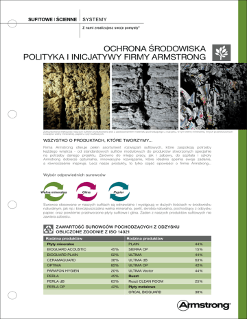 OCHRONA ŚRODOWISKA Polityka i inicjatywy firmy Armstrong Zdecydowana większość naszych sufitów produkowana jest z zastosowaniem materiału pochodzącego z odzysku, w tym wełny mineralnej, innych przetworzonych rodzajów wełny mineralnej, papieru i płyt sufitowych. WSZYSTKO O PRODUKTACH, KTÓRE TWORZYMY... Firma Armstrong oferuje pełen asortyment rozwiązań sufitowych, które zaspokoją potrzeby każdego wnętrza - od standardowych sufitów modułowych do produktów stworzonych specjalnie na potrzeby danego projektu. Zarówno do miejsc pracy, jak i zabawy, do szpitala i szkoły Armstrong dobierze optymalne, innowacyjne rozwiązanie, które idealnie spełnia swoje zadanie, a równocześnie inspiruje. Lecz nasze produkty, to tylko część opowieści o firmie Armstrong... Wybór odpowiednich surowców Wełna mineralna Glina Papier Surowce stosowane w naszych sufitach są odnawialne i występują w dużych ilościach w środowisku naturalnym, jak np.: biorozpuszczalna wełna mineralna, perlit, skrobia naturalna, pochodzący z odzysku papier, oraz powtórnie przetworzone płyty sufitowe i glina. Żaden z naszych produktów sufitowych nie zawiera azbestu. ZAWARTOŚĆ SUROWCÓW POCHODZĄCYCH Z ODZYSKU OBLICZONE ZGODNIE Z ISO 14021 Product Range Rodzina produktów Product Range Rodzina produktów Płyty mineralne BIOGUARD ACOUSTIC 45% PLAIN 44% SIERRA OP 15% BIOGUARD PLAIN 52% ULTIMA 44% CERAMAGUARD 38% ULTIMA dB 63% OPTIMA 82% ULTIMA OP 42% PARAFON HYGIEN 20% ULTIMA Vector 44% PERLA 45% Ruszt PERLA dB 63% Ruszt CLEAN ROOM PERLA OP 42% Płyty metalowe ORCAL BIOGUARD 25% 30% Produkty odpowiadające Państwa potrzebom Obecnie bardziej niż kiedykolwiek wcześniej dla poprawy standardu życia ludzie potrzebują wygodnego i zdrowego otoczenia - zaś właściwe warunki akustyczne i wizualne odgrywają tutaj kluczową rolę. Dlatego też rozwiązania oferowane przez firmę Armstrong koncentrują się na kluczowych elementach, takich jak rozumienie mowy, poufność rozmów, zachowanie koncentracji oraz jakość oświetlenia. Nasze kompleksowe portfolio innowacyjnych rozwiązań sufitowych pozwala na uzyskanie idealnej równowagi pomiędzy pochłanianiem dźwięku, jego izolacyjnością oraz odbiciem światła - umożliwiając stworzenie idealnego wnętrza zarówno do pracy jak i do odpoczynku czy zabawy. ...ORAZ TO, JAK JE TWORZYMY Opracowując każdy z naszych nowych produktów bądź wzorów, zadajemy sobie ciągle to samo podstawowe pytanie: czy w danym przypadku ekologiczność produktu jest na takim samym wysokim poziomie jak jego jakość i wygoda dla użytkowników? Odpowiedź brzmi: zdecydowanie tak! Poczynając od jakości powietrza oraz efektywności energetycznej aż do ochrony pracowników oraz opakowania przyjaznego dla środowiska, produkty firmy Armstrong nieustannie spełniają najwyższe standardy ekologiczne. Uzyskanie znaczących oszczędności energii Od 1998 roku Armstrong prowadzi inicjatywy, takie jak na przykład projekt redukcji emisji gazów, skłaniające nasze zakłady w Europie Zachodniej do optymalizacji wykorzystanych kanałów dystrybucji. Dzięki dywersyfikacji zakładów produkcyjnych oraz centrów dystrybucji, udało się nam obniżyć poziom działań związanych z transportem, co oznacza istotną redukcję zużycia energii. Ponadto, nasz zakład w Team Valley produkujący płyty sufitowe uzyskuje znaczące oszczędności energii dzięki przyjaznemu dla środowiska przetwarzaniu kaolinu, skutkującemu mniejszym zużyciem energii, niższym poziomem odpadów papierowych oraz mniejszą liczbą użytych palet, a także minimalizacją przewozów. Komfort wizualny Światło dzienne oraz oświetlenie elektryczne stanowią główne źródła światła. Jednakże sufity, podłogi oraz powierzchnie ścian także odgrywają kluczową rolę, wpływając na wydajność środowiska pracy oraz umożliwiając zastosowanie energooszczędnego oświetlenia. Sufity cechujące się wysokim współczynnikiem odbicia światła odbijają do 90% padającego na nie światła, w porównaniu z jedynie 75% dla sufitów standardowych. Co więcej, współczynnik odbicia światła na poziomie 90% zapewnia oszczędność kosztów oświetlenia pośredniego na poziomie 20%, a dodatkowo oszczędność całkowitego zużycia energii w budynku na poziomie 11%. Montaż płyt Canopy nad stanowiskami pracy może także zwiększyć odbicia światła we wnętrzu oraz zapewnić większy komfort jego użytkownikom. Komfort akustyczny ul. Domaniewska 37 02-672 Warszawa Polska tel.: +48 22 337 86 10/ 86 11 faks: +48 22 337 86 12 [email protected] www.armstrong.pl/sufity Agency: Armstrong Building Products B.V. Sp.z o.o. Oddział w Polsce - 02/2011 – PX1106 – Copyright: Simon Miles - Printed on free chlorine paper. Klientów cechują trzy podstawowe potrzeby związane z akustyką: rozumienie mowy, poufność rozmów, oraz zachowanie koncentracji. Firma Armstrong oferuje rozwiązania cechujące się najwyższymi parametrami w odniesieniu do wszystkich tych trzech czynników. Oferujemy największy asortyment rozwiązań akustycznych, w tym produkty cechujące się wysokimi współczynnikami odbicia dźwięku, jego pochłaniania, a także rozwiązania zwiększające dźwiękoizolacyjność pomiędzy pomieszczeniami. Ponadto, w przypadku gdy wymagane jest uzyskanie indywidualnie określonych poziomów poufności rozmów, oferujemy rozwiązania aktywne akustycznie.