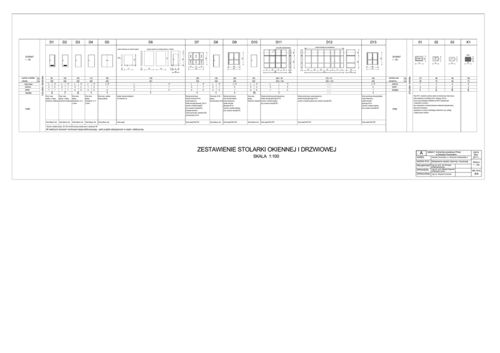 D2 D3 D4 D5 D6 D7 D8 D9 D10 D11 D12 So Ho 90 205 100 205 P 0 1 L 3 1 5 100 205 P 1 1 L 4 1 7 110 205 P 2 0 L 4 0 6 Drzwi wew., Drzwi wew., Drzwi wew., płaskie, płaskie, z kratką, płaskie, z kratką, ościeżnice metalowe ościeżnice metalowe antywłaman. kl. C, 2 zamki P 0 0 L 1 0 1 Drzwi wew., płaskie, antywłaman. kl. C, 2 zamki 190 205 L/P 1 0 1 uwagi: Kolor,faktura: buk Kolor,faktura: buk Kolor,faktura: buk Kolor,faktura: buk Kolor,faktura: buk P 1 0 L 0 0 System ścianek działowych do zabudowy wc Kolor popiel 03 K1 100 205 EI-30 EI-60 EI-30 EI-60 P 1 0 L 0 0 krata SCHEMAT 1 : 100 252 205 105 251 1 Drzwi wew., płaskie, dwuskrzydłowe EI-60 4 szt. STOLARKA DRZWIOWA wymiar w świetle ościeży ilość sztuk piwnica parter RAZEM 02 system zabudowy wc (toaleta damska + natryski) EI-60 SCHEMAT 1 : 100 01 ścianka istniejąca do przestawienia linia sufitu podwieszanego system zabudowy wc (natryski męskie) D13 1 P 1 0 L 0 0 1 202 205 L/P 0 1 1 100 205 383 + 35 205 + 103 P 0 6 L 0 9 P 0 0 L 0 1 15 1 Ścianka aluminiowa, skrzydło drzwiowe EI-30, szyba bezpieczna światło skrzydła głównego 100 cm (wymiar w świetle przejścia przy rozwarciu skrzydła 90 ), pozostałe elementy ścianki aluminiowo- szklanej EI-60, samozamykacz EI-30 Drzwi wew.,EI-30 Ścianka aluminiowa, drzwi dwuskrzydłowe, płaskie, samozamykacz EI-30 szyba bezpieczna, światło skrzydła głównego 90 cm (wymiar w świetle przejścia przy rozwarciu skrzydła 90 ) Drzwi wew., Ścianka aluminiowa,szyba bezpieczna, światło skrzydła głównego 90 cm płaskie, ościeżnice metalowe (wymiar w świetle przejścia przy rozwarciu skrzydła 90 ) Kolor popiel RAL7047 Kolor,faktura: buk Kolor,faktura: buk Kolor popiel RAL7047 153 + 31 205 + 103 Kolor popiel RAL7047 194 205 L/P 0 1 wymiary zew. ościeżnicy piwnica parter RAZEM 1 Ścianka aluminiowa, szyba bezpieczna, światło skrzydła głównego 90 cm (wymiar w świetle przejścia przy rozwarciu skrzydła 90 ), Kolor popiel RAL7047 Drzwi aluminiowe dwuskrzydłowe, szyba bezpieczna, światło skrzydła głównego 90 cm (wymiar w świetle przejścia przy rozwarciu skrzydła 90 ) uwagi: Sz Hz STOLARKA OKIENNA D1 131 85 1 0 96 75 2 0 96 69 8 0 102 75 5 0 1 2 8 5 Okno PCV, rozwierno-uchylne, drewno w kolorze lazur stara sosna, szkło bezbarwne, termofloat 4/16/4, ramiaki gr. 68 mm, okucia rozszczelniające SIGIENIA lub ROTO obwiedniowe z okapnikiem rynnowym, okno wyposażone w dwustrumieniowe nawiewniki higrosterowane, fabrycznie montowane, wyposażone w uchwyt umożliwiający otwieranie z poz. podłogi z siatką przeciw owadom Kolor popiel RAL7047 Wymiar w świetle ościeży So=100, Ho=205 oznacza montaż drzwi z ościeżnicą ''90''. W niektórych drzwiach montowane będą elektrozaczepy - patrz projekt zabezpieczeń w części elektrycznej. ZESTAWIENIE STOLARKI OKIENNEJ I DRZWIOWEJ SKALA 1:100 A OBIEKT: Komenda powiatowa Policji w Drawsku Pomorskim ADRES: Drawsko Pomorskie, ul. Obrońców Westerplatte 3 NAZWA RYS.: Zestawienie stolarki okiennej i drzwiowej PROJEKTANT: SPRAWDZIŁ: mgr inż. arch. Jan Drzazga A/PB/8300/240/83 mgr inż. arch. Mikołaj Krajewski A/PB/8300/153/83 OPRACOWAŁ: mgr inż. Wojciech Guzinski DATA MAJ 2011 r. SKALA 1 : 100 NR. RYS. 4/4