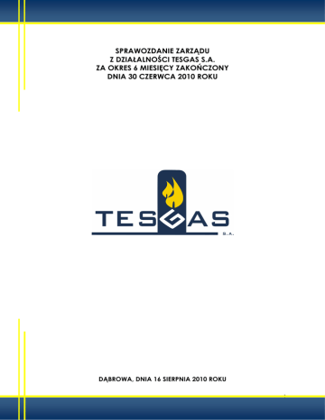 Sprawozdanie Zarządu z działalności TESGAS S.A. za okres 6 miesięcy zakończony 30 czerwca 2010 roku SPRAWOZDANIE ZARZĄDU Z DZIAŁALNOŚCI TESGAS S.A. ZA OKRES 6 MIESIĘCY ZAKOŃCZONY DNIA 30 CZERWCA 2010 ROKU DĄBROWA, DNIA 16 SIERPNIA 2010 ROKU 1 Sprawozdanie Zarządu z działalności TESGAS S.A. za okres 6 miesięcy zakończony 30 czerwca 2010 roku SPIS TREŚCI 1. INFORMACJE O SPÓŁCE.......................................................................................................................................... 3 2. INFORMACJE O POWIĄZANIACH KAPITAŁOWYCH SPÓŁKI ............................................................................ 3 3. OSOBY ZARZĄDZAJĄCE I NADZORUJĄCE ........................................................................................................... 3 4. UMOWY ZAWARTE MIEDZY SPÓŁKĄ, A OSOBAMI ZARZADZAJĄCYMI, PRZEWIDUJĄCE REKOMPENSATĘ W PRZYPADKU ICH REZYGNACJI LUB ZWOLNIENIA ............................................................ 4 5. STRUKTURA AKCJONARIATU .................................................................................................................................... 4 6. INFORMACJA O UMOWACH, W WYNIKU KTÓRYCH MOGĄ WYSTĄPIĆ ZMIANY W PROPORCJACH POSIADANYCH AKCJI............................................................................................................................................... 8 7. INFORMACJE O NABYCIU AKCJI WŁASNYCH .................................................................................................... 8 8. OGRANICZENIA DOTYCZĄCE PRZENOSZENIA PRAWA WŁASNOŚCI PAPIERÓW WARTOŚCIOWYCH SPÓŁKI TESGAS S.A. ORAZ OGRANICZENIA W ZAKRESIE WYKONYWANIA Z NICH PRAWA GŁOSU ...... 8 9. INFORMACJA O EMISJI, WYKUPIE ORAZ SPŁACIE DŁUśNYCH I KAPITAŁOWYCH PAPIERÓW WARTOŚCIOWYCH .................................................................................................................................................... 9 10. INFORMACJA DOTYCZĄCA WYPŁACONEJ LUB ZDEKLAROWANEJ DYWIDENDY ................................... 10 11. ANALIZA SYTUACJI MAJĄTKOWEJ, FINANSOWEJ ORAZ WYNIKU FINANSOWEGO SPÓŁKI W OKRESIE 6 MIESIĘCY ZAKOŃCZONYM 30 CZERWCA 2010 ROKU (DANE W TYS. ZŁ).................................................... 10 12. ANALIZA WSKAŹNIKOWA WYNIKÓW FINANSOWYCH SPOŁKI ...................................................................... 14 13. OCENA ZARZĄDZANIA ZASOBAMI FINANSOWYMI I ZDOLNOŚCI WYWIĄZYWANIA SIĘ ZE ZOBOWIĄZAŃ ........................................................................................................................................................... 16 14. KOMENTARZ ZARZĄDU DO WYNIKÓW FINANSOWYCH.................................................................................. 17 15. WAśNIEJSZE OSIĄGNIĘCIA Z DZIEDZINY BADAŃ I ROZWOJU ........................................................................ 18 16. INFORMACJA O PODSTAWOWYCH USŁUGACH SPÓŁKI............................................................................... 18 17. INFORMACJA O RYNKACH ZBYTU ....................................................................................................................... 18 18. INFORMACJA O UMOWACH ZNACZĄCYCH ................................................................................................... 19 19. OBJAŚNIENIA DOTYCZĄCE SEZONOWOŚCI I CYKLICZNOŚCI ...................................................................... 22 20. POSTĘPOWANIA TOCZĄCE SIĘ PRZED SĄDEM, ORGANEM WŁAŚCIWYM DLA POSTĘPOWANIA ARBITRAśOWEGO LUB ORGANEM ADMINISTRACJI PUBLICZNEJ ................................................................. 22 21. TRANSAKCJE Z PODMIOTAMI POWIĄZANYMI .................................................................................................. 22 22. INFORMACJE O ZACIĄGNIĘTYCH KREDYTACH, UMOWACH POśYCZEK................................................... 23 23. INFORMACJE O UDZIELONYCH POśYCZKACH ................................................................................................ 23 24. INFORMACJE O PORĘCZENIACH, GWARANCJACH ORAZ ZOBOWIĄZANIACH POZABILANSOWYCH 24 25. OCENA MOśLIWOŚCI ZREALIZOWANIA OPUBLIKOWANYCH PRZEZ ZARZĄD PROGNOZ WYNIKÓW NA 2010 ROK.................................................................................................................................................................... 24 26. REALIZACJA CELÓW EMISYJNYCH ...................................................................................................................... 24 27. GŁÓWNE INWESTYCJE RZECZOWE I KAPITAŁOWE ORAZ OCENA MOśLIWOŚCI ZAMIERZEŃ INWESTYCYJNYCH ................................................................................................................................................... 29 28. OPIS CZYNNIKÓW I ZDARZEŃ, W SZCZEGÓLNOŚCI O NIETYPOWYM CHARAKTERZE, MAJĄCYCH ZNACZĄCY WPŁYW NA OSIĄGNIĘTE WYNIKI FINANSOWE ............................................................................ 30 29. INSTRUMENTY FINANSOWE STOSOWANE PRZEZ SPÓŁKĘ ................................................................................ 30 30. POCHODNE INSTRUMENTY FINANSOWE STOSOWANE PRZEZ SPÓŁKĘ ........................................................ 31 31. WARTOŚĆ WYNAGRODZEŃ, NAGRÓD I KORZYŚCI WYPŁACONYCH OSOBOM ZARZĄDZAJĄCYM I NADZORUJĄCYM..................................................................................................................................................... 32 32. INFORMACJE O SYSTEMIE KONTROLI AKCJI PRACOWNICZYCH ................................................................. 33 33. UMOWY Z PODMIOTEM UPRAWNIONYM DO BADANIA SPRAWOZDAŃ FINANSOWYCH ..................... 34 2 Sprawozdanie Zarządu z działalności TESGAS S.A. za okres 6 miesięcy zakończony 30 czerwca 2010 roku 1. INFORMACJE O SPÓŁCE Poprzednik prawny Spółki został zawiązany jako TESGAS Spółka z ogra