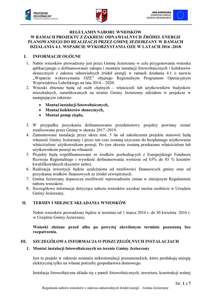 REGULAMIN NABORU WNIOSKÓW W RAMACH PROJEKTU Z ZAKRESU ODNAWIALNYCH ŹRÓDEŁ ENERGII PLANOWANEGO DO REALIZACJI PRZEZ GMINĘ JEZIORZANY W RAMACH DZIAŁANIA 4.1. WSPARCIE WYKORZYSTANIA OZE W LATACH 2016 -2018 I. INFORMACJE OGÓLNE 1. Nabór wniosków prowadzony jest przez Gminę Jeziorzany w celu przygotowania wniosku aplikacyjnego o dofinansowanie zakupu i montażu instalacji fotowoltaicznych i kolektorów słonecznych z zakresu odnawialnych źródeł energii w ramach działania 4.1 o nazwie ,,Wsparcie wykorzystania OZE” objętego Regionalnym Programem Operacyjnym Województwa Lubelskiego na lata 2014 – 2020. 2. Wnioski zbierane będą od osób chętnych - właścicieli lub użytkowników budynków mieszkalnych, zameldowanych na terenie Gminy Jeziorzany udziałem w projekcie w następującym zakresie: Montaż instalacji fotowoltaicznych, Montaż kolektorów słonecznych, Montaż pomp ciepła, 3. W przypadku pozyskania dofinansowania przedmiotowy projekty powinny zostać zrealizowane przez Gminę w okresie 2017 -2019. 4. Zamontowane instalacje przez okres min. 5 lat od zakończenia projektu stanowić będą własność Gminy Jeziorzany i przez ten czas zostaną użyczone do bezpłatnego użytkowania właścicielom/ użytkownikom posesji. Po tym okresie zostaną przekazane właścicielom lub użytkownikom posesji na własność. 5. Projekty będą współfinansowane ze środków pochodzących z Europejskiego Funduszu Rozwoju Regionalnego i wysokość dofinansowania wyniesie od 65% do 85 % kosztów kwalifikowalnych (kosztów netto). 6. Realizacja inwestycji będzie uzależniona od możliwości finansowych gminy oraz od pozyskania środków finansowych ze źródeł zewnętrznych. 7. Gmina Jeziorzany dopuszcza możliwość wprowadzenia zmian w niniejszym Regulaminie naboru wniosków. 8. Szczegółowe informacje dotyczące naboru wniosków uzyskać można osobiście w Urzędzie Gminy Jeziorzany. II. TERMIN I MIEJSCE SKŁADANIA WNIOSKÓW Nabór wniosków prowadzony będzie w terminie od 1 marca 2016 r. do 30 kwietnia 2016 r. w Urzędzie Gminy Jeziorzany. Wnioski złożone przed albo po powyżej określonym terminie pozostaną bez rozpatrzenia. III. SZCZEGÓŁOWA INFORMACJA O POSZCZEGÓLNYCH INSTALACJACH 1. Montaż instalacji fotowoltaicznych na terenie Gminy Jeziorzany Jest to projekt w zakresie montażu mikroinstalacji prosumenckich, które produkują energię elektryczną tylko na własne potrzeby gospodarstwa domowego. Instalacja fotowoltaiczna składa się z paneli fotowoltaicznych, inwertera, konstrukcji nośnej Str. 1 z 7 Regulamin naboru wniosków z zakresu odnawialnych źródeł energii – Gmina Jeziorzany do montażu urządzenia na dachu budynku, okablowania, osprzętu instalacyjnego. Co to jest fotowoltaiczna mikroinstalacja prosumencka montowana w ramach przedmiotowego projektu? Fotowoltaiczna mikroinstalacja prosumencka zamienia energię promieniowania słonecznego na energię prądu elektrycznego i jej łączna moc elektryczna nie może przekroczyć 40 kW. Służy ona do zasilania wewnętrznej instalacji elektrycznej budynku mieszkalnego o napięciu 230 V i wytworzona energia może być przeznaczona tylko i wyłącznie na potrzeby własne gospodarstwa domowego (nie mylić z potrzebami gospodarstwa rolnego), czyli do zasilania urządzeń codziennego użytku np. pralka, lodówka, zamrażarka, telewizor, terma itp. Koszt netto instalacji oraz koszt partycypacji uczestnika projektu będzie uzależniony od rodzaju i mocy zamontowanej instalacji fotowoltaicznej oraz miejsca lokalizacji. Udział uczestnika projektu wyniesie minimum: 35% wartości netto zakupu i i montażu instalacji, całkowity koszt podatku VAT koszt wykonania projektu, w tym koszt wydania opinii o możliwości wykonania instalacji na wskazanym przez mieszkańca budynku Ze względu na wymagania stawiane przez Instytucję Zarządzającą Programem jaką jest Urząd Marszałkowski Województwa Lubelskiego w Lublinie każda gmina aplikująca o środki unijne przed złożeniem wniosku o dofinansowanie projektu zobowiązana jest do posiadania dokumentacji technicznej podłączenia instalacji fotowoltaicznej na wskazanym przez mieszkańca budynku. W związku z powyższym mieszkaniec zobowiązuje się do dobrowolnego pokrycia kosztów wykonania projektu instalacji fotowoltaicznej przez projektanta wyznaczonego przez Gminę Jeziorzany. Koszt wykonania projektu, w tym koszt wydania opinii o możliwości wykonania instalacji na wskazanym przez mieszkańca budynku zostanie ustalony po wyłonieniu przez gminę projektanta. Gmina Jeziorzany zastrzega, że koszt wykonania projektu jest kosztem kwalifikowanym i traktowany będzie, jako wkład własny mieszkańca podlegający rozliczeniu podczas realizacji przedsięwzięcia. Informuje się także, że w przypadku nie otrzymania dofinansowania na realizację projektu koszt wykonania projektu nie będzie podlegał zwrotowi. W przypadku braku możliwości wykonania montażu instalacji fotowoltaicznej i tym samym projektu technicznego instalacji na wskazanym przez mieszkańca budynku, mieszkaniec zostanie obciążony kosztem wydania opinii natomiast koszt wykonania projektu podlegać będzie zwrotowi na rachunek bankowy podany przez mieszkańca. Dokumentacja zostanie wykonana tylko dla tych lokalizacji, których właściciele dokonają stosownych wpłat w określonym terminie. W przypadku rezygnacji właściciela posesji z udziału w projekcie już po wykonaniu Str. 2 z 7 Regulamin naboru wniosków z zakresu odnawialnych źródeł energii – Gmina Jeziorzany dokumentacji projektowej poniesie on całkowite koszty jej wykonania. Warunki udziału w projekcie: 1) połać dachu na budynku mieszkalnym (lub gospodarczym położonym w niewielkiej odległości od domu mieszkalnego) musi być skierowana na południe, a jej nachylenie do poziomu nie powinno być mniejsze niż 30° (optymalne 45°) oraz posiadać wolną powierzchnię niezbędną do zamontowania paneli fotowoltaicznych 2) uczestni