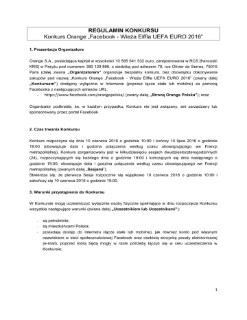 REGULAMIN KONKURSU Konkurs Orange „Facebook - Wieża Eiffla UEFA EURO 2016” 1. Prezentacja Organizatora Orange S.A., posiadająca kapitał w wysokości 10 595 541 532 euro, zarejestrowana w RCS [francuski KRS] w Paryżu pod numerem 380 129 866, z siedzibą pod adresem 78, rue Olivier de Serres, 75015 Paris (dalej zwana „Organizatorem” organizuje bezpłatny konkurs, bez obowiązku dokonywania zakupów pod nazwą „Konkurs Orange „Facebook - Wieża Eiffla UEFA EURO 2016” (zwany dalej „Konkursem”) dostępny wyłącznie w Internecie (poprzez łącze stałe lub mobilne) za pomocą Facebooka z następujących adresów URL: - https://www.facebook.com/orangepolska/ (zwany‐dalej „Stroną Orange Polska”); oraz Organizator podkreśla, że, w każdym przypadku, Konkurs nie jest związany, ani zarządzany lub sponsorowany przez portal Facebook. 2. Czas trwania Konkursu Konkurs rozpoczyna się dnia 10 czerwca 2016 o godzinie 10:00 i kończy 10 lipca 2016 o godzinie 19:00 (obowiązuje data i godzina połączenia według czasu obowiązującego we Francji metropolitalnej). Konkurs zorganizowany jest w kilkudziesięciu sesjach dwudziestoczterogodzinnych (24), rozpoczynających się każdego dnia o godzinie 19:00 i kończących się dnia następnego o godzinie 19:00; obowiązuje data i godzina połączenia według czasu obowiązującego we Francji metropolitalnej (zwanych dalej „Sesjami”). Stwierdza się, że pierwsza Sesja rozpocznie się wyjątkowo 10 czerwca 2016 o godzinie 10:00 i zakończy się 10 czerwca 2016 o godzinie 19:00. 3. Warunki przystąpienia do Konkursu W Konkursie mogą uczestniczyć wyłącznie osoby fizyczne spełniające w dniu rozpoczęcia Konkursu wszystkie następujące warunki (zwane dalej „Uczestnikiem lub Uczestnikami”): – są pełnoletnie; – są mieszkańcami Polska; – posiadają dostęp do Internetu (łącze stałe lub mobilne), jak również konto pod własnym nazwiskiem w sieci społecznościowej Facebook oraz osobistą skrzynkę poczty elektronicznej (e-mail), poprzez którą będą mogły w razie potrzeby łączyć się w celu uczestniczenia w Konkursie; 1 W Konkursie nie mogą uczestniczyć osoby niepełnoletnie, jak również osoby, które bezpośrednio lub pośrednio lub z jakiegokolwiek tytułu uczestniczyły w przygotowaniu niniejszego Konkursu (w szczególności osoby wykonujące pracę dla Organizatora lub na jego rzecz lub dla spółek doradczych Organizatora lub dla Kancelarii notarialnej SCP Darricau-Pecastaing z siedzibą w Paryżu, będącego depozytariuszem niniejszego regulaminu), jak również członkowie ich rodzin (o takim samym nazwisku i takim samym adresie pocztowym). W konkursie mogą wziąć udział wyłącznie osoby w pełni spełniające wymagania wyszczególnione w niniejszym regulaminie (zwanym dalej „Regulaminem”). Z tego względu Organizator zastrzega sobie prawo do przeprowadzenia wszelkich weryfikacji, które uzna za stosowne w zakresie identyfikacji, wieku i danych każdego Uczestnika. Wszelkie informacje podane przez Uczestnika w ramach rejestracji w Konkursie zgodnie z punktem 4 poniżej, które okażą się niekompletne, błędne, niezgodne z prawdą lub uniemożliwią zidentyfikowanie lub zlokalizowanie danego Uczestnika, spowodują wykluczenie go z uczestnictwa w Konkursie. Uczestnictwo w Konkursie wiąże się z bezwarunkową akceptacją Regulaminu oraz jego zasad. Wszelkie działania niezgodne z Regulaminem lub próba podjęcia takich działań polegająca na rozpoczęciu wykonywania lub wykonaniem określonej czynności w celu zdobycia nienależnej nagrody, nieprzestrzeganie Regulaminu lub jakakolwiek inna zamierzona czynność mająca na celu utrudnienie prawidłowego przebiegu Konkursu dokonana przez danego Uczestnika uprawnia Organizatora do wytoczenia powództwa. Podobnie, jeśli stwierdzi się, że przebieg Konkursu został zakłócony przez osoby trzecie, ale Uczestnik ponosi winę za swoje działania niezgodne z Regulaminem, wówczas jego uczestnictwo zostaje uznane za nieważne, a Organizator może wytoczyć powództwo za jego nielegalne działania. 4. Warunki uczestnictwa i rejestracji uczestnictwa w Konkursie Uczestnictwo w Konkursie możliwe jest wyłącznie przez Internet (łącze stałe lub mobilne) zgodnie z warunkami opisanymi poniżej (zwane dalej „Uczestnictwem”). Wyklucza się uczestnictwo w Konkursie w jakiejkolwiek innej formie lub za pomocą innych środków, w szczególności z wykorzystaniem poczty głosowej. W celu rozpoczęcia gry każdy Uczestnik będzie musiał między godziną 10:00 10 czerwca 2016 r. a godziną 19:00 10 lipca 2016 r. ( obowiązuje data i godzina połączenia według czasu obowiązującego we Francji metropolitalnej): 1) połączyć się ze swoim kontem na Facebooku, a następnie przejść na jedną ze Stron wymienionych w punkcie 1 niniejszego Regulaminu; 2) gdy znajdzie się na jednej ze Stron wymienionych w punkcie 1, w celu uzyskania dostępu do aplikacji konkursowej z poziomu tej strony, kliknąć na pole wyboru dedykowane dla Konkursu, 2 które wyświetli się wówczas pod napisem „Tour Eiffel UEFA EURO 2016” [„Wieża Eiffla UEFA EURO 2016”]. 3) kliknąć przycisk „Jouer” [„Graj”], a następnie przycisk „J’accepte” [„Akceptuję”], aby aplikacja konkursowa uzyskała dostęp do danych osobowych z Facebooka (imię, nazwisko, telefon, adres email); 4) w wyświetlonym formularzu uczestnictwa w Konkursie wypełnić następujące pola obowiązkowe: nazwisko; oraz imię; oraz e-mail. 5) na końcu formularza zaznaczyć następujące pole: « J’accepte le règlement» [„Akceptuję Regulamin”]; 6) kliknąć przycisk potwierdzający uczestnictwo „Valider” [„Zatwierdź”] znajdujący się na końcu formularza: - jeśli Uczestnik nie wypełnił prawidłowo formularza uczestnictwa, zostanie o tym poinformowany za pomocą jednego z następujących komunikatów: „Le champ XXXX est obligatoire” [„Pole XXXX jest obo