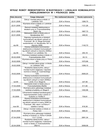 Załącznik nr 9 WYKAZ ROBÓT REMONTOWYCH W BUDYNKACH I LOKALACH KOMUNALNYCH ZREALIZOWANYCH W I PÓŁROCZU 2009r. Data zlecenia 22.01.2009 22.01.2009 22.01.2009 22.01.2009 sty-09 sty-09 05.02.2009 18.02.2009 19.02.2009 19.02.2009 lut-09 17.03.2009 17.03.2009 Czego dotyczyło Zakup i montaŜ pieca w lokalu ul. Lotników 13/3 Wymiana drzwi w lokalu ul. Lotników 13/2 Remont instalacji elektrycznej w lokalach przy ul. Franciszkańskiej 26a/6 i 6a Malowanie ścian w lokalu przy ul. Senatorskiej 16/1 Naprawy hydrauliczne w lokalach komunalnych wg zleceń ustnych ul. Franciszk. 26, ul. Długa 5(montaŜ wodomierza) i ul. Senatorska 16/1 w styczniu 2009. Roboty budowlano-kominiarskoelektryczne w lokalach komunalnych wg zleceń ustnych w styczniu 2009(ul. Polna 4 i ul. Lotników 13). Wymiana instalacji wodnej w lokalu ul. Franciszkańska 26/6 Wymiana drzwi w lokalu przy ul. Polna 8/3 Zakup i montaŜ pieca grzew. w lokalu ul. Lotników 13/5 Rozbiórka starej kuchni, zakup i montaŜ kuchni węglowej i naprawa komina w lokalu pl. Czarnieckiego 13/5. Roboty budowlano-kominiarskoelektryczne w lokalach komunalnych wg zleceń ustnych w lutym 2009(ul. Lotnik.13 ul. Długa 6). Malowanie ścian w lokalu przy ul. Franciszkańskiej 26a/6a Wymiana pionu głównego instalacji wodnej w budynku ul. Długa 6 Kto realizował zlecenie Kwota wykonania ZUK w Warce 1266,75 ZUK w Warce 1121,26 ZUK w Warce 1667,72 ZUK w Warce 446,53 ZUK w Warce 1142,72 ZUK w Warce 293,18 ZUK w Warce 63,13 ZUK w Warce 1072,66 ZUK w Warce 1208,10 ZUK w Warce 2826,20 ZUK w Warce 227,56 ZUK w Warce 511,90 ZUK w Warce 1452,96 ZUK w Warce 739,81 mar-09 UdroŜnienie instalacji kanalizacyjnej z wypompowaniem wody z piwnic w budynku ul. Krótka 4. Roboty budowlano-kominiarskoelektryczne w lokalach komunalnych wg zleceń ustnych w marcu 2009 (ul. Franciszk. 26a -dach i ul.Polna 4 opaska z rynną) ZUK w Warce 818,38 06.04.2009 Zakup i montaŜ sedesu w lokalu ul. Polna 12/2 ZUK w Warce 688,04 ZUK w Warce 2691,34 ZUK w Warce 3008,06 03.2009 07.04.2009 22.04.2009 Wymiana pionu głównego instalacji wodnej w budynku ul. Polna 4 (lokale 1,4,7 i 2,5,8). Rozbiórka starej kuchni, zakup i montaŜ kuchni węglowej i malowanie ścian w lokalu ul. Franciszkańska 26a/13. Załącznik nr 9 WYKAZ ROBÓT REMONTOWYCH W BUDYNKACH I LOKALACH KOMUNALNYCH ZREALIZOWANYCH W I PÓŁROCZU 2009r. maj-09 Roboty budowlano-kominiarskoelektryczne w lokalach komunalnych wg zleceń ustnych w kwietniu 2009(ul. Lotn.13,ul. Polna 4 i ul. Senat.16kuchnia, ul. Wójtow.1 -pomalow. ściany z napisów). ZUK w Warce Wymiana instalacji elektrycznej w Instalatorstwo Elektryczne lokalu pl. Czarnieckiego 10/10 Niedziałek Bogusław, Warka Wymiana instalacji wodnej w lokalu ul. Polna 14/3 ZUK w Warce Wymiana 2 szt okien w lokalu ul. Lotników 30/1 ZUK w Warce Naprawy hydrauliczne w lokalach komunalnych wg zleceń ustnych w maju 2009(os. Wysock.1i pl. Czarnieck. 10). ZUK w Warce Roboty budowlano-kominiarskoelektryczne w lokalach komunalnych wg zleceń ustnych w maju 2009(ul. Obwodowa 2-naprawa drzwi, ul. Polna 4-rynna spustow z wylewką i ul. Lotników 13/1-naprawa drzwi). ZUK w Warce 09.06.2009 MontaŜ przedłuŜki kominowej do lokalu "KOMINIARZ" sp. z o. o. w ul. Długa 6/5. Grójcu 1000,00 cze-09 Roboty budowlano-kominiarskoelektryczne w lokalach komunalnych wg zleceń ustnych w czerwcu 2009(ul. Polna 12-rynna i ul. Polna 4-trzepak, rura spustowa) . ZUK w Warce 412,75 cze-09 Szklenie okien w bud. Byłej szkoły w Gośniewicach ZUK w Warce 165,70 kwi-09 07.05.2009 07.05.2009 27.05.2009 maj-09 RAZEM ZLECENIA: półrocze 2009 półrocze 2009 półrocze 2009 półrocze 2009 półrocze 2009 półrocze 2009 Wydatki na fundusz remontowy Wydatki na fundusz remontowy Wydatki na fundusz remontowy Wydatki na fundusz remontowy Wydatki na fundusz remontowy Wydatki na fundusz remontowy Wspólnota "DŁUGA 5" Wspólnota "DŁUGA 10" Wspólnota "WYSOCKIEGO 1" Wspólnota "FABRYCZNA" Wspólnota "ŁAMANIEC" Wspólnota "POLNA 19A" RAZEM FUNDUSZ REMONTOWY: ŁĄCZNIE REMONTY: 606,81 2000,00 149,72 1367,27 191,47 774,26 27748,58 2035,00 2850,64 2636,63 5659,92 1551,00 2403,46 17136,65 44885,23