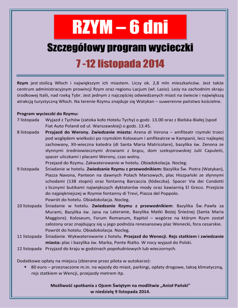RZYM – 6 dni Szczegółowy program wycieczki 7 -12 listopada 2014 Rzym jest stolicą Włoch i największym ich miastem. Liczy ok. 2,8 mln mieszkańców. Jest także centrum administracyjnym prowincji Rzym oraz regionu Lacjum (wł. Lazio). Leży na zachodnim skraju środkowej Italii, nad rzeką Tybr. Jest jednym z najczęściej odwiedzanych miast na świecie i największą atrakcją turystyczną Włoch. Na terenie Rzymu znajduje się Watykan – suwerenne państwo kościelne. Program wycieczki do Rzymu: 7 listopada Wyjazd z Tychów (zatoka koło Hotelu Tychy) o godz. 13.00 oraz z Bielska‐Białej (spod Fiat Auto Poland od ul. Warszawskiej) o godz. 13.45. 8 listopada Przyjazd do Werony. Zwiedzanie miasta: Arena di Verona – amfiteatr rzymski trzeci pod względem wielkości po rzymskim Koloseum i amfiteatrze w Kampanii, lecz najlepiej zachowany, XII‐wieczna katedra (di Santa Maria Matricolare), bazylika św. Zenona ze słynnymi średniowiecznymi drzwiami z brązu, dom szekspirowskiej Julii Capuletii, spacer uliczkami i placami Werony, czas wolny. Przejazd do Rzymu. Zakwaterowanie w hotelu. Obiadokolacja. Nocleg. 9 listopada Śniadanie w hotelu. Zwiedzanie Rzymu z przewodnikiem: Bazylika Św. Piotra (Watykan), Piazza Navona, Panteon na dawnych Polach Marsowych, plac Hiszpański ze słynnymi schodami (138 stopni) oraz fontanną Barcaccia (łódeczka). Spacer Via dei Condotti z licznymi butikami największych dyktatorów mody oraz kawiarnią El Greco. Przejście do najpiękniejszej w Rzymie fontanny di Trevi, Piazza del Poppolo. Powrót do hotelu. Obiadokolacja. Nocleg. 10 listopada Śniadanie w hotelu. Zwiedzanie Rzymu z przewodnikiem: Bazylika Św. Pawła za Murami, Bazylika św. Jana na Lateranie, Bazylika Matki Bożej Śnieżnej (Santa Maria Maggiore). Koloseum, Forum Romanum, Kapitol – wzgórze na którym Rzym został założony oraz znajdujący się u jego podnóża renesansowy plac Wenecki, fora cesarskie. Powrót do hotelu. Obiadokolacja. Nocleg. 11 listopada Śniadanie. Wykwaterowanie z hotelu. Przejazd do Wenecji. Rejs statkiem i zwiedzanie miasta: plac i bazylika św. Marka, Ponte Rialto. W nocy wyjazd do Polski. 12 listopada Przyjazd do kraju w godzinach popołudniowych lub wieczornych. Dodatkowe opłaty na miejscu (zbierane przez pilota w autokarze): 80 euro – przeznaczone m.in. na wjazdy do miast, parkingi, opłaty drogowe, taksę klimatyczną, rejs statkiem w Wencji, przejazdy metrem itp. Możliwość spotkania z Ojcem Świętym na modlitwie „Anioł Pański” w niedzielę 9 listopada 2014.