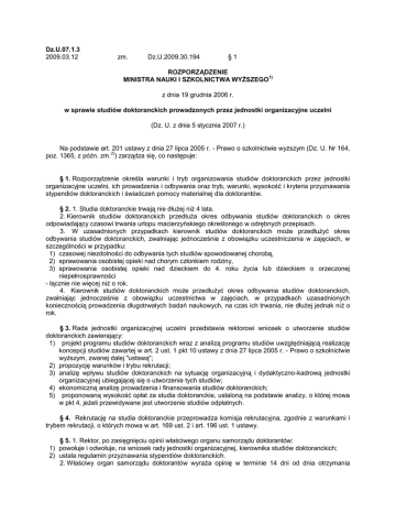 Dz.U.07.1.3 2009.03.12 zm. Dz.U.2009.30.194 §1 ROZPORZĄDZENIE 1) MINISTRA NAUKI I SZKOLNICTWA WYŻSZEGO z dnia 19 grudnia 2006 r. w sprawie studiów doktoranckich prowadzonych przez jednostki organizacyjne uczelni (Dz. U. z dnia 5 stycznia 2007 r.) Na podstawie art. 201 ustawy z dnia 27 lipca 2005 r. - Prawo o szkolnictwie wyższym (Dz. U. Nr 164, 2) poz. 1365, z późn. zm. ) zarządza się, co następuje: § 1. Rozporządzenie określa warunki i tryb organizowania studiów doktoranckich przez jednostki organizacyjne uczelni, ich prowadzenia i odbywania oraz tryb, warunki, wysokość i kryteria przyznawania stypendiów doktoranckich i świadczeń pomocy materialnej dla doktorantów. § 2. 1. Studia doktoranckie trwają nie dłużej niż 4 lata. 2. Kierownik studiów doktoranckich przedłuża okres odbywania studiów doktoranckich o okres odpowiadający czasowi trwania urlopu macierzyńskiego określonego w odrębnych przepisach. 3. W uzasadnionych przypadkach kierownik studiów doktoranckich może przedłużyć okres odbywania studiów doktoranckich, zwalniając jednocześnie z obowiązku uczestniczenia w zajęciach, w szczególności w przypadku: 1) czasowej niezdolności do odbywania tych studiów spowodowanej chorobą, 2) sprawowania osobistej opieki nad chorym członkiem rodziny, 3) sprawowania osobistej opieki nad dzieckiem do 4. roku życia lub dzieckiem o orzeczonej niepełnosprawności - łącznie nie więcej niż o rok. 4. Kierownik studiów doktoranckich może przedłużyć okres odbywania studiów doktoranckich, zwalniając jednocześnie z obowiązku uczestnictwa w zajęciach, w przypadkach uzasadnionych koniecznością prowadzenia długotrwałych badań naukowych, na czas ich trwania, nie dłużej jednak niż o rok. § 3. Rada jednostki organizacyjnej uczelni przedstawia rektorowi wniosek o utworzenie studiów doktoranckich zawierający: 1) projekt programu studiów doktoranckich wraz z analizą programu studiów uwzględniającą realizację koncepcji studiów zawartej w art. 2 ust. 1 pkt 10 ustawy z dnia 27 lipca 2005 r. - Prawo o szkolnictwie wyższym, zwanej dalej "ustawą"; 2) propozycję warunków i trybu rekrutacji; 3) analizę wpływu studiów doktoranckich na sytuację organizacyjną i dydaktyczno-kadrową jednostki organizacyjnej ubiegającej się o utworzenie tych studiów; 4) ekonomiczną analizę prowadzenia i finansowania studiów doktoranckich; 5) proponowaną wysokość opłat za studia doktoranckie, ustaloną na podstawie analizy, o której mowa w pkt 4, jeżeli przewidywane jest utworzenie studiów odpłatnych. § 4. Rekrutację na studia doktoranckie przeprowadza komisja rekrutacyjna, zgodnie z warunkami i trybem rekrutacji, o których mowa w art. 169 ust. 2 i art. 196 ust. 1 ustawy. § 5. 1. Rektor, po zasięgnięciu opinii właściwego organu samorządu doktorantów: 1) powołuje i odwołuje, na wniosek rady jednostki organizacyjnej, kierownika studiów doktoranckich; 2) ustala regulamin przyznawania stypendiów doktoranckich. 2. Właściwy organ samorządu doktorantów wyraża opinię w terminie 14 dni od dnia otrzymania wniosku o jej wydanie. § 6. Rada jednostki organizacyjnej prowadzącej studia doktoranckie: 1) określa sposób dokonywania oceny realizacji programu studiów doktoranckich oraz prowadzenia badań naukowych przez doktorantów; 2) określa sposób organizacji zajęć prowadzonych na studiach doktoranckich; 3) rozpatruje zastrzeżenia doktorantów do ocen, o których mowa w § 7 pkt 2: 4) rozpatruje odwołania doktorantów od decyzji, o których mowa w § 7 pkt 3. § 7. Kierownik studiów doktoranckich: 1) organizuje realizację programu studiów doktoranckich; 2) dokonuje oceny realizacji programu studiów doktoranckich oraz prowadzenia badań naukowych przez doktorantów; 3) podejmuje decyzje w sprawie zaliczenia kolejnych lat studiów doktoranckich; 4) wyraża zgodę na przedłużenie okresu odbywania studiów doktoranckich. § 8. 1. Świadczenia pomocy materialnej, o których mowa w art. 199 ust. 1 ustawy, przyznaje się na wniosek doktoranta. 2. Do wniosku o przyznanie stypendium socjalnego, stypendium na wyżywienie albo stypendium mieszkaniowego doktorant dołącza: 1) zaświadczenia urzędu skarbowego o wysokości dochodów uzyskanych przez doktoranta lub doktoranta i członków jego rodziny, w przypadku dochodów podlegających opodatkowaniu podatkiem dochodowym od osób fizycznych; 2) oświadczenia doktoranta lub doktoranta i członków jego rodziny o wysokości uzyskanego dochodu, w przypadku dochodów podlegających opodatkowaniu zryczałtowanym podatkiem dochodowym od niektórych przychodów osiąganych przez osoby fizyczne; 3) zaświadczenie właściwego organu gminy lub nakaz płatniczy określający wielkość gospodarstwa rolnego wyrażoną w hektarach przeliczeniowych ogólnej powierzchni, w przypadku dochodu uzyskiwanego przez doktoranta lub doktoranta i członków jego rodziny z prowadzenia gospodarstwa rolnego; 4) oświadczenia doktoranta lub doktoranta i członków jego rodziny o wysokości uzyskiwanych innych dochodów. 3. Stypendium za wyniki w nauce może być także przyznane bez konieczności składania wniosku. § 9. 1. Wniosek o przyznanie świadczenia pomocy materialnej doktorant składa do kierownika studiów doktoranckich. 2. Kierownik studiów doktoranckich, w terminie 14 dni od dnia otrzymania wniosku, dokonuje sprawdzenia kompletności złożonego wniosku i przekazuje go organowi przyznającemu świadczenia pomocy materialnej. § 10. 1. Pomoc materialną w formie: 1) stypendium socjalnego, 2) stypendium na wyżywienie, 3) stypendium mieszkaniowego może otrzymać doktorant znajdujący się w trudnej sytuacji materialnej, określonej zgodnie z art. 179 ustawy. Pomoc ta jest przyznawana na okres semestru lub roku akademickiego i wypłacana co miesiąc. 2. Stypendium mieszkaniowe może otrzymać doktorant odbywający stacjonarne studia doktoranckie. 3. Zapomogę może otrzymać doktorant, który z przycz