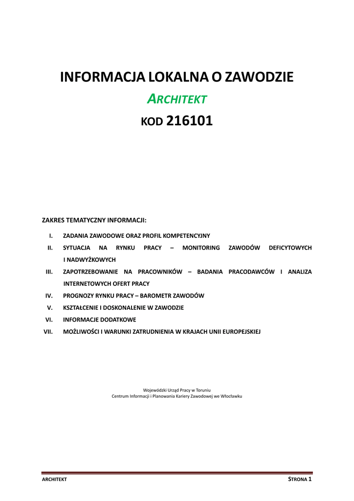 INFORMACJA LOKALNA O ZAWODZIE ARCHITEKT KOD 216101 ZAKRES TEMATYCZNY INFORMACJI: I. ZADANIA ZAWODOWE ORAZ PROFIL KOMPETENCYJNY II. SYTUACJA NA RYNKU PRACY – MONITORING ZAWODÓW DEFICYTOWYCH I NADWYŻKOWYCH III. ZAPOTRZEBOWANIE NA PRACOWNIKÓW – BADANIA PRACODAWCÓW I ANALIZA INTERNETOWYCH OFERT PRACY IV. PROGNOZY RYNKU PRACY – BAROMETR ZAWODÓW V. KSZTAŁCENIE I DOSKONALENIE W ZAWODZIE VI. INFORMACJE DODATKOWE VII. MOŻLIWOŚCI I WARUNKI ZATRUDNIENIA W KRAJACH UNII EUROPEJSKIEJ Wojewódzki Urząd Pracy w Toruniu Centrum Informacji i Planowania Kariery Zawodowej we Włocławku ARCHITEKT STRONA 1 I. ZADANIA ZAWODOWE ORAZ PROFIL KOMPETENCYJNY ARCHITEKT (216101) to jeden z 2443 zawodów ujętych w obowiązującej od 1 stycznia 2015 r. klasyfikacji zawodów i specjalności na potrzeby rynku pracy (DZ.U. z 2014 r. poz. 1145). Architekt opracowuje programy funkcjonalno-przestrzenne i projekty planów budowy, rozbudowy i modernizacji obiektów budowlanych lub ich części wraz z przyległym terenem; pełni kontrolę nad realizacją projektowanych obiektów w ramach nadzoru autorskiego i budowlanego; prowadzi studia i badania nad praktycznym wykorzystaniem w budownictwie wyników prac z innych dziedzin: inżynierii budowlanej, materiałowej i sanitarnej, ergonomii, socjologii, psychologii, ekonomiki budownictwa itp. Zadania zawodowe: • prowadzenie analizy stanu istniejącego, inwentaryzacja obiektów i projektowanych działek, określanie stanu prawnego, uwarunkowań zewnętrznych i urbanistycznych; • opracowywanie programu funkcjonalno-jakościowego i funkcjonalno-przestrzennego projektowanych obiektów; • podejmowanie decyzji projektowych, dotyczących rozwiązań konstrukcyjnych i materiałowych; • opracowywanie założeń do projektów branżowych (konstrukcje, instalacje sanitarne, elektryczne, technologia, ochrona ppoż., akustyka), a po uzyskaniu powyższych zapewnienie możliwości ich realizacji w projektowanym obiekcie; • prowadzenie i koordynowanie pracy przy projektach wielobranżowych; • nadzór nad procesem legislacji poszczególnych faz projektu; • opracowywanie projektów od strony plastyczno-przestrzennej; • projektowanie bezpośredniego otoczenia obiektu i zagospodarowania jego działki; • zapewnianie związków funkcjonalnych, przestrzennych i krajobrazowych projektowanego obiektu z otoczeniem; • prowadzenie nadzoru autorskiego nad realizacją projektu; • wykonywanie zadań związanych z podanymi wyżej; • nadzorowanie innych pracowników. 1. 1 Wortal Publicznych Służb Zatrudnienia http://psz.praca.gov.pl/rynek-pracy/bazy-danych/klasyfikacja-zawodow-i-specjalnosci/wyszukiwarka-opisow-zawodow ARCHITEKT STRONA 2 Profil kompetencyjny2 dla grupy specjaliści do spraw ekonomicznych i zarządzania - kod 243 Kompetencje to cechy osoby, które przejawiają się w działaniach prowadzących do wykonywania zadań zawodowych na wymaganym poziomie oraz w zachowaniach przekładających się na konkretne efekty, dzięki czemu są obserwowalne, podlegają rozwojowi poprzez szkolenia oraz nabyte doświadczenia w realizacji określonych zadań. Dla grupy specjaliści nauk fizycznych, matematycznych i technicznych wyróżniono cztery kluczowe kompetencje: 1. Zdolności analityczne i podejmowanie decyzji - Rozumienie złożonych sytuacji i relacji zachodzących pomiędzy różnymi elementami. Analizowanie informacji i danych, dostrzeganie zależności, wyciąganie na ich podstawie wniosków i podejmowanie trafnych decyzji. 2. Sumienność w dążeniu do rezultatów - Wysoka efektywność realizacji zadań w ściśle określonym terminie i z należytą starannością, uwzględniającą własne kompetencje i możliwości. Determinacja w działaniu i osiąganie zakładanych rezultatów przez utrzymywanie odpowiedniego tempa oraz jakości pracy, nawet w obliczu trudności. 3. Gotowość- do podnoszenia kwalifikacji - Otwartość na wiedzę i na zadania umożliwiające jej zdobycie. Wykorzystywanie napotkanych problemów jako okazji do rozwoju. Chęć eksperymentowania i podejmowania nowych zadań. Staranna analiza sukcesów i porażek oraz traktowanie tych drugich jako cennej lekcji. 4. Obsługa komputera i wykorzystanie Internetu - Korzystanie z dostępnych urządzeń technicznych (np. komputerów, drukarek, skanerów) i aplikacji komputerowych do usprawnienia realizacji zadań. Swobodne przeglądanie stron internetowych w celu szybkiego dotarcia do informacji przydatnych ze względu na wykonywane obowiązki. Skuteczne wyszukiwanie w sieci potrzebnych wiadomości, formułowanie poleceń wyszukiwania w taki sposób, aby zapewniały szybkie dotarcie do źródeł na odpowiednim poziomie merytorycznym, bez konieczności sprawdzania przypadkowych rezultatów wyszukiwania. II. ANALIZA SYTUACJI NA RYNKU PRACY Prezentowana analiza dotyczy okresu od 1 stycznia 2010 r. do 3O czerwca 2016 r. W I półroczu 2016 r. do powiatowych urzędów pracy w województwie kujawskopomorskim zgłosiło się 37 bezrobotnych legitymujących się zawodem architekt, w tym 11 osób w okresie do 12 miesięcy od dnia ukończenia nauki. W końcu czerwca 2016r. w ewidencji pozostawało 26 osób z tym zawodem. W I półroczu 2016 roku do powiatowych urzędów pracy zgłoszono 6 wolnych miejsc pracy lub aktywizacji zawodowej w zawodzie architekt. 2 3 NBK Narzędzie do badania kompetencji. Podręcznik dla doradców zawodowych Warszawa, 2014 Rozporządzenie Ministra Pracy i Polityki Społecznej z dnia 7.08.2014r. w sprawie klasyfikacji zawodów i specjalności na potrzeby rynku pracy oraz zakresu jej stosowania (Dz .U. 2014 poz. 1145). ARCHITEKT STRONA 3 BEZROBOTNI I ZGŁOSZONE WOLNE MIEJSCA PRACY LUB AKTYWIZACJI ZAWODOWEJ W ZAWODZIE ARCHITEKTA Wyszczególnienie Bezrobotni zarejestrow ani w okresie ogółem Bezrobotni według stanu na koniec okresu Osoby do 12 miesięcy od dnia ukończenia nauki ogółem Osoby do 12 miesięcy od dnia ukończenia nauki na koniec okresu Wolne miejsca pracy i miejsca aktywiz