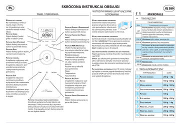 SKRÓCONA INSTRUKCJA OBSŁUGI PL WSTRZYMYWANIE LUB WYŁĄCZANIE GOTOWANIA PANEL STEROWANIA WYŚWIETLACZ CYFROWY Na wyświetlaczu widoczny jest zegar w formacie 24-godzinnym oraz symbole różnych wskaźników. PRZYCISK COMBI Wybór funkcji Combi/ grilla w trybie Combi. PRZYCISK DEFROST (ROZMRAŻANIE) Wybór funkcji rozmrażania w trybie ręcznym/6th Sense. PRZYCISK FORCED AIR (TERMO OBIEG) PRZYCISK CRISP (PIECZENIE) Wybór funkcji pieczenia w trybie ręcznym/6th Sense. PRZYCISK GRILL Wybór funkcji grilla w trybie ręcznym/automatyczny. PRZYCISK POKRĘTŁA Urządzenie wyłączone: uaktywnienie funkcji Jet Start. Urządzenie włączone: potwierdzenie parametrów i uaktywnienie procesu gotowania. PRZYCISK STOP Urządzenie włączone: naciśnięcie umożliwia wyłączenie lub zresetowanie dowolnej funkcji kuchenki mikrofalowej. Urządzenie wyłączone: przytrzymanie naciśniętego przycisku umożliwia ustawienie zegara. PRZYCISK WYŁĄCZENIA TALERZA OBROTOWEGO Umożliwia wyłączenie funkcji talerza obrotowego. Funkcja ta może być używana tylko podczas korzystania z funkcji mikrofal i Combi. W przypadku innych funkcji przycisk ten nie będzie działał. JQ 280 Wybór funkcji termoobiegu w trybie ręcznym/automatyczny. PRZYCISK MW (MIKROFALE) Wybór funkcji gotowania przy użyciu mikrofal w trybie ręcznym/automatyczny. POKRĘTŁO REGULACJI W zależności od funkcji pokrętło to należy przekręcić, aby wybrać poniższe pozycje: Poziom mocy mikrofal Czas gotowania Waga Temperatura Typ produktu PRZYCISK JET START Urządzenie wyłączone: uaktywnienie funkcji Jet Start. Urządzenie włączone: potwierdzenie parametrów i uaktywnienie procesu gotowania. PRZYCISK STEAM (GOTOWANIE NA PARZE) Wybór funkcji gotowania na parze 6th Sense. W CELU WSTRZYMANIA GOTOWANIA: Gotowanie można wstrzymać poprzez otwarcie drzwiczek w celu sprawdzenia, odwrócenia lub zamieszania potrawy. Ustawienie zostanie zachowane na 10 minut. W CELU KONTYNUOWANIA GOTOWANIA: Zamknij drzwiczki i naciśnij przycisk pokrętła lub Jet Start JEDEN RAZ. Proces gotowania zostanie wznowiony od momentu jego wstrzymania. Naciśnięcie przycisku pokrętła lub Jet Start DWA RAZY zwiększy czas o 30 sekund. JEŚLI KONTYNUOWANIE GOTOWANIA NIE JEST WYMAGANE: Wyjmij potrawę, zamknij drzwiczki i naciśnij przycisk STOP. UWAGA: po zakończeniu gotowania wentylator, talerz obrotowy i lampka w komorze pozostają uaktywnione do momentu naciśnięcia przycisku STOP. PO ZAKOŃCZENIU GOTOWANIA przez 10 minut rozlegać się będzie co minutę sygnał dźwiękowy. Naciśnij przycisk STOP lub otwórz drzwiczki, aby anulować sygnał dźwiękowy. MIKROFALE TRYB RĘCZNY TYLKO MIKROFALE SUGEROWANE ZASTOSOWANIE: PODGRZEWANIE napojów, wody, wywarów, kawy, herbaty lub innych produktów o JET dużej zawartości wody. Jeśli potrawa (950 W) zawiera jajka lub śmietanę, należy wybrać niższą moc. 750 W GOTOWANIE ryb, mięsa, warzyw itp. MOC 650 W GOTOWANIE potraw, bez mieszania. GOTOWANIE WYMAGAJĄCE WIĘKSZEJ DOKŁADNOŚCI, np. sosów z dużą zawartością białka, 500 W potraw z sera i jajek, a także dogotowywanie potraw duszonych na wolnym ogniu. GOTOWANIE NA WOLNYM OGNIU potraw du350 W szonych, roztapianie masła. 160 W ROZMRAŻANIE. 90 W ZMIĘKCZANIE masła, serów i lodów. TRYB AUTOMATYCZNY TYP PRODUKTU q1 2 ILOŚĆ PIECZONE ZIEMNIAKI 200 g - 1 kg NAPOJE 150 g - 600 g 3 MIĘSO, MROŻONE 200 g - 500 g 4 CIASTO MAKARONOWE, MROŻONE 250 g - 550 g 5 POPCORN 100 g 6 RYŻ, MROŻONY 300 g - 650 g 7 ZUPA, MROŻONA 250 g - 1 kg 8 WARZYWA, Z PUSZKI 200 g - 600 g 9 WARZYWA, ŚWIEŻE 200 g - 800 g WARZYWA, MROŻONE 150 g - 600 g 10 SKRÓCONA INSTRUKCJA OBSŁUGI PL ROZMRAŻANIE COMBI TRYB RĘCZNY FUNKCJA TA SŁUŻY DO rozmrażania w trybie ręcznym produktów, takich jak mięso, drób, ryby, warzywa i chleb. TRYB 6TH SENSE FUNKCJA TA SŁUŻY DO automatycznego rozmrażania produktów, takich jak mięso, drób, ryby, warzywa i chleb. TYP PRODUKTU 1 ILOŚĆ RYBY 100 g - 1,5 kg 2 MIĘSO 100 g - 2 kg 3 DRÓB 100 g - 2,5 kg 4 WARZYWA 100 g - 1,5 kg NACIŚNIJ PRZYCISK COMBI, aby wybrać funkcję grilla w trybie Combi lub funkcję Combi. GRILL W TRYBIE COMBI FUNKCJA TA SŁUŻY DO przygotowywania potraw w wyższych naczyniach o większych objętościach, które wymagają przyrumienienia górnej warstwy, takich jak zapiekanki, lasagne, potrawy z drobiu lub pieczone ziemniaki. WYBÓR POZIOMU MOCY MOC SUGEROWANE ZASTOSOWANIE: 650 W GOTOWANIE warzyw i zapiekanek GOTOWANIE potraw z drobiu i 350–500 W lasagne GOTOWANIE zapiekanek rybnych i 160–350 W mrożonych 160 W GOTOWANIE mięsa 90 W ZAPIEKANE owoce PRZYRUMIENIANIE, tylko podczas go0 W towania TERMOOBIEG FUNKCJA TA SŁUŻY DO przygotowywania następujących potraw: Tosty z serem i kanapki na ciepło Kiełbaski Szaszłyki Pommes duchesse Zapiekane owoce TRYB RĘCZNY TRYB AUTOMATYCZNY FUNKCJA TA SŁUŻY DO zapiekania tostów, kanapek croque monsieur i kiełbasek. TYP PRODUKTU q1 CROQUE MONSIEUR ILOŚĆ 60–120 g WYBÓR POZIOMU MOCY MOC SUGEROWANE ZASTOSOWANIE: PRZYGOTOWYWANIE potraw z drobiu, 350 W ziemniaków w mundurkach, lasagne i ryb PRZYGOTOWYWANIE pieczeni i ciast 160 W owocowych 90 W PRZYGOTOWYWANIE ciast i ciastek TRYB RĘCZNY FUNKCJA TA SŁUŻY DO odgrzewania i pieczenia pizzy oraz innych potraw na bazie ciasta. Można jej także używać do smażenia jajek na bekonie, kiełbasek, hamburgerów itp. GORĄCY TALERZ DO PIECZENIA NALEŻY WYJMOWAĆ Z KUCHENKI przy użyciu rękawic kuchennych lub dostarczonego specjalnego uchwytu talerza do pieczenia. TRYB 6TH SENSE TRYB AUTOMATYCZNY FUNKCJA TA SŁUŻY do pieczenia ciast w proszku, ciasteczek, muffinów i bułek. POTRAWĘ NALEŻY ZAWSZE UMIESZCZAĆ na niskim ruszcie z drutu. TYP PRODUKTU q1 FUNKCJA COMBI FUNKCJA TA SŁUŻY DO przygotowywania potraw w wyższych naczyniach o większych objętościach, które wymagają przyrumienienia górnej warstwy, takich jak pieczenie, potrawy z drobiu, ziemniaki w mundurkach, mrożone dania gotowe, ciasta, ciastka, ry