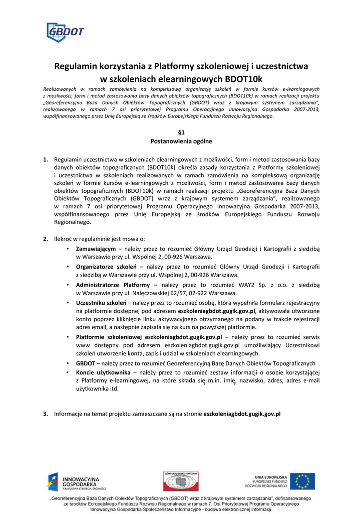 Regulamin korzystania z Platformy szkoleniowej i uczestnictwa w szkoleniach elearningowych BDOT10k Realizowanych w ramach zamówienia na kompleksową organizację szkoleń w formie kursów e-learningowych z możliwości, form i metod zastosowania bazy danych obiektów topograficznych (BDOT10k) w ramach realizacji projektu „Georeferencyjna Baza Danych Obiektów Topograficznych (GBDOT) wraz z krajowym systemem zarządzania”, realizowanego w ramach 7 osi priorytetowej Programu Operacyjnego Innowacyjna Gospodarka 2007-2013, współfinansowanego przez Unię Europejską ze środków Europejskiego Funduszu Rozwoju Regionalnego. §1 Postanowienia ogólne 1. Regulamin uczestnictwa w szkoleniach elearningowych z możliwości, form i metod zastosowania bazy danych obiektów topograficznych (BDOT10k) określa zasady korzystania z Platformy szkoleniowej i uczestnictwa w szkoleniach realizowanych w ramach zamówienia na kompleksową organizację szkoleń w formie kursów e-learningowych z możliwości, form i metod zastosowania bazy danych obiektów topograficznych (BDOT10k) w ramach realizacji projektu „Georeferencyjna Baza Danych Obiektów Topograficznych (GBDOT) wraz z krajowym systemem zarządzania”, realizowanego w ramach 7 osi priorytetowej Programu Operacyjnego Innowacyjna Gospodarka 2007-2013, współfinansowanego przez Unię Europejską ze środków Europejskiego Funduszu Rozwoju Regionalnego. 2. Ilekroć w regulaminie jest mowa o: ▪ Zamawiającym – należy przez to rozumieć Główny Urząd Geodezji i Kartografii z siedzibą w Warszawie przy ul. Wspólnej 2, 00-926 Warszawa. ▪ Organizatorze szkoleń – należy przez to rozumieć Główny Urząd Geodezji i Kartografii z siedzibą w Warszawie przy ul. Wspólnej 2, 00-926 Warszawa. ▪ Administratorze Platformy – należy przez to rozumieć WAY2 Sp. z o.o. z siedzibą w Warszawie przy ul. Nałęczowskiej 62/57, 02-922 Warszawa. ▪ Uczestniku szkoleń – należy przez to rozumieć osobę, która wypełniła formularz rejestracyjny na platformie dostępnej pod adresem eszkoleniagbdot.gugik.gov.pl, aktywowała utworzone konto poprzez kliknięcie linku aktywacyjnego otrzymanego na podany w trakcie rejestracji adres email, a następnie zapisała się na kurs na powyższej platformie. ▪ Platformie szkoleniowej eszkoleniagbdot.gugik.gov.pl – należy przez to rozumieć serwis www dostępny pod adresem eszkoleniagbdot.gugik.gov.pl umożliwiający Uczestnikowi szkoleń utworzenie konta, zapis i udział w szkoleniach elearningowych. ▪ GBDOT – należy przez to rozumieć Georeferencyjną Bazę Danych Obiektów Topograficznych ▪ Koncie użytkownika – należy przez to rozumieć zestaw informacji o osobie korzystającej z Platformy e-learningowej, na które składa się ̨ m.in. imię,̨ nazwisko, adres, adres e-mail użytkownika itd. 3. Informacje na temat projektu zamieszczane są na stronie eszkoleniagbdot.gugik.gov.pl §2 Rekrutacja na szkolenia 1. Warunkiem uczestnictwa w szkoleniu jest utworzenie konta na platformie szkoleniowej poprzez wypełnienie formularza rejestracyjnego dostępnego na stronie eszkoleniagbdot.gugik.gov.pl w zakładce Zaloguj >> Zacznij teraz od utworzenia konta. Po wypełnieniu formularza wymagane jest potwierdzenie adresu email podanego w formularzu szkoleniowym poprzez kliknięcie linku aktywacyjnego otrzymanego w wiadomości zwrotnej wysłanej z Platformy. 2. Po utworzeniu konta każdy Uczestnik uzyskuje dostęp do szkoleń umieszczonych na platformie szkoleniowej. W celu zapisania się na kurs wymagane jest wybranie kursu z listy dostępnych na platformie szkoleniowej oraz kliknięcie przycisku Zapisz mnie na kurs. 3. Udział w szkoleniach jest bezpłatny. 4. Terminy udostępnienia szkoleń na platformie oraz termin rejestracji zostały przekazane w mailingu zachęcającym do uczestnictwa w szkoleniach oraz są dostępne na stronie Platformy szkoleniowej w sekcji Aktualności. 5. Organizator zastrzega sobie prawo do zmiany terminu udostępnienia szkoleń. Poinformuje o tym Uczestników szkolenia najpóźniej 4 dni robocze przed rozpoczęciem możliwości zapisu na szkolenia. §3 Organizacja szkoleń 1. Szkolenia odbywają się w terminach podanych w Terminarzu szkoleń dostępnym na stronie eszkoleniagbdot.gugik.gov.pl w sekcji Aktualności. Termin będzie podany także w dostarczanej do Uczestnika drogą mailową wiadomości i w zakresie podanym w opisie szkoleń znajdujących się na stronie eszkoleniagbdot.gugik.gov.pl. 2. Szkolenia udostępnione będą w postaci kursów elearningowych na platformie szkoleniowej eszkoleniagbdot.gugik.gov.pl. 3. Platforma szkoleniowa jest dostępna tylko i wyłącznie poprzez Internet i działa 7 dni w tygodniu 24 godziny na dobę ̨ z wyłączeniem okresów niezbędnych na przeprowadzenie prac modernizacyjnych lub z wyłączeniem okresów awarii. 4. Korzystanie z Platformy e-learningowej wymaga od użytkownika dostępu do sieci internetowej, komputera z zainstalowaną przeglądarką ̨ internetową IE 9 (min. Internet explorer wersja 9) i ewentualnie dodatkowym oprogramowaniem (ADOBE READER, FLASH PLAYER), niezbędnym do udziału w kursach e-learningowych zamieszczonych na platformie. W celu możliwości dostępu do Platformy, Użytkownik powinien posiadać ́ aktywny adres e-mail. 5. Korzystając z Platformy, Użytkownik wyraża zgodę ̨ na przetwarzanie danych osobowych znajdujących się ̨ na jego koncie, oraz otrzymywanie materiałów/informacji dotyczących szkoleń́. 6. Platforma wykorzystuje pliki cookie, czyli małe pliki tekstowe wysyłane do komputera Użytkownika, w których znajdują się informacje konieczne do właściwego funkcjonowania Platformy, w szczególności procesu autoryzacji, uproszczenia operacji związanych z lepszym dopasowaniem Platformy do potrzeb Użytkownika, tworzenia statystyk oglądalności. 7. Warunkiem działania cookie jest ich akceptacja w przeglądarce oraz ich nieusuwanie. W przypadku braku akceptacji cookie lub ich usu