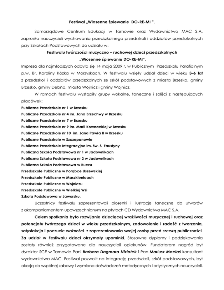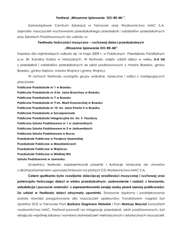 Festiwal „Wiosenne śpiewanie DO-RE-MI ”. Samorządowe Centrum Edukacji w Tarnowie oraz Wydawnictwo MAC S.A. zaprosiło nauczycieli wychowania przedszkolnego przedszkoli i oddziałów przedszkolnych przy Szkołach Podstawowych do udziału w: Festiwalu twórczości muzyczno – ruchowej dzieci przedszkolnych „Wiosenne śpiewanie DO-RE-MI”. Impreza dla najmłodszych odbyła się 14 maja 2009 r. w Publicznym Przedszkolu Parafialnym p.w. Bł. Karoliny Kózka w Morzyskach. W festiwalu wzięły udział dzieci w wieku 3–6 lat z przedszkoli i oddziałów przedszkolnych ze szkół podstawowych z miasta Brzeska, gminy Brzesko, gminy Dębno, miasta Wojnicz i gminy Wojnicz. W ramach festiwalu wystąpiły grupy wokalne, taneczne i soliści z następujących placówek: Publiczne Przedszkole nr 1 w Brzesku Publiczne Przedszkole nr 4 im. Jana Brzechwy w Brzesku Publiczne Przedszkole nr 7 w Brzesku Publiczne Przedszkole nr 9 im. Marii Kownackiej w Brzesku Publiczne Przedszkole nr 10 im. Jana Pawła II w Brzesku Publiczne Przedszkole w Szczepanowie Publiczne Przedszkole Integracyjne im. św. S Faustyny Publiczna Szkoła Podstawowa nr 1 w Jadownikach Publiczna Szkoła Podstawowa nr 2 w Jadownikach Publiczna Szkoła Podstawowa w Buczu Przedszkole Publiczne w Porąbce Uszewskiej Przedszkole Publiczne w Maszkienicach Przedszkole Publiczne w Wojniczu Przedszkole Publiczne w Wielkiej Wsi Szkoła Podstawowa w Jaworsku. Uczestnicy festiwalu zaprezentowali piosenki i ilustracje taneczne do utworów z akompaniamentem upowszechnianym na płytach CD Wydawnictwa MAC S.A. Celem spotkania było rozwijanie dziecięcej wraŜliwości muzycznej i ruchowej oraz potencjału twórczego dzieci w wieku przedszkolnym, zadowolenie i radość z tworzenia, satysfakcja i poczucie waŜności z zaprezentowania swojej osoby przed szerszą publiczności. Za udział w Festiwalu dzieci otrzymały upominki. Stosowne dyplomy i podziękowania zostały równieŜ przygotowane dla nauczycieli opiekunów. Fundatorem nagród był dyrektor SCE w Tarnowie Pani Barbara Dagmara Niziołek i Pan Mariusz Maciaś konsultant wydawnictwa MAC. Festiwal pozwolił na integrację przedszkoli, szkół podstawowych, był okazją do wspólnej zabawy i wymiana doświadczeń metodycznych i artystycznych nauczycieli. Uroczystego podsumowania Festiwalu i oceny prezentowanych piosenek i tańca dokonały pani Barbara Dagmara Niziołek dyrektor SCE w Tarnowie i pani Jolanta Hołubińska–Kalinowska wizytator Kuratorium Oświaty w Krakowie – Delegatura w Tarnowie. Naczelnik Wydziału Edukacji Kultury i Sportu UM w Brzesku pan Józef Cierniak podziękował dyrektorowi przedszkola Pani Ewie Tomanie za współpracę. Gościem festiwalu był równieŜ pan Tomasz Pajor redaktor Przeglądu Brzeskiego. O tym dziecięcym widowisku promującym talenty artystyczne przedszkolaków będziemy mogli przeczytać w Miesięczniku Brzeskim. Zamieszczone w galerii zdjęcia odzwierciedlają atmosferę podczas trwania Festiwalu. Do udziału w Festiwalu Piosenki Przedszkolnej „Mikrofon dla przedszkolaka” organizowanym w przyszłym roku szkolnym juŜ dziś serdecznie zapraszam. GraŜyna Skrzekucka koordynator Aby zobaczyć jak było pięknie na Festiwalu zapraszamy do obejrzenia zdjęć w Galerii http://www.sce.pl/?strona=00680&galeria=00028