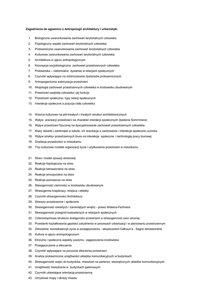 Zagadnienia do egzaminu z Antropologii architektury i urbanistyki 1. Biologiczne uwarunkowania zachowań terytorialnych człowieka 2. Fizjologiczny aspekt zachowań terytorialnych człowieka 3. Proksemiczne uwarunkowania zachowań terytorialnych człowieka 4. Kulturowe uwarunkowania zachowań terytorialnych człowieka 5. Architektura w ujęciu antropologicznym 6. Koncepcja socjobiologiczna zachowań przestrzennych człowieka 7. Proksemika – nieformalne dystanse w relacjach społecznych 8. Czynniki wpływające na zróżnicowanie dystansów proksemicznych 9. Antropogeniczna waloryzacja przestrzeni 10. Aksjologia zachowań przestrzennych człowieka w środowisku zbudowanym 11. Przestrzeń osobista człowieka i jej funkcje 12. Przestrzeń społeczna i typy relacji społecznych 13. Interakcje społeczne a pozycja ciała człowieka 14. Wzorce kulturowe na pół-trwałych i trwałych struktur architektonicznych 15. Wpływ aranżacji przestrzeni na charakter interakcji społecznych (badania Sommmera) 16. Wpływ przestrzeni fizycznej na dyscyplinowanie zachowań przestrzennych człowieka 17. Klasy otwarte i zamknięte w szkole, ich aranżacja a zachowania i interakcje społeczne uczniów 18. Wpływ struktur przestrzennych biura na interakcje społeczne i technologię pracy biurowej 19. Gradacja prywatności w mieszkaniu 20. Trzy kulturowe modele organizacji życia i użytkowania przestrzeni w mieszkaniu 21. Stres i model sytuacji stresowej 22. Reakcje fizjologiczne na stres 23. Reakcje behawioralne na stres 24. Reakcje emocjonalne na stres 25. Reakcje poznawcze na stres 26. Stesogenność ciemności w środowisku zbudowanym 27. Stresogenne krajobrazy, miejsca i obiekty 28. Czynniki stresogenności Architektury 29. Stresory przestrzenne i społeczne 30. Stresogenność otwartych i zamkniętych wnętrz - prawo Webera-Fechnera 31. Stresogenność przegród budowlanych w relacjach społecznych 32. Czterostopniowa struktura dostępności przestrzeni a stresogenność sieci ulicznej 33. Przesłanki kształtowania gęstości zaludnienia w procesach urbanizacji i w planowaniu przestrzennym 34. Zdrowotne konsekwencje życia w przegęszczeniu - eksperyment Calhoun’a - bagno behawioralne 35. Kultura w ujęciu antropologicznym 36. Etniczne i społeczne aspekty poziomu zagęszczenia środowiska 37. Przegęszczenie a stłoczenie 38. Czynniki wpływające na poczucie stłoczenia przestrzeni 39. Analiza proksemiczna uciążliwości układów komunikacyjnych w budynkach 40. Stresogenność wejść do budynków, mieszkań na parterze, wewnętrznych układów komunikacyjnych 41. Uciążliwość mieszkania w budynkach galeriowych 42. Czynniki ułatwiające orientację przestrzenną 43. Umysłowe mapy i obrazy miasta 44. Trudności z identyfikacją adresu w przestrzeniach osiedlowych 45. Systemy nazewnictwa i numeracji – różnice kulturowe 46. Przestrzenie ucieczkowe - analiza ergonomiczna 47. Przestrzenie ucieczkowe - interpretacja proksemiczna 48. Uwarunkowania architektoniczne ucieczkowości przestrzeni 49. Przestrzenie opresyjne 50. Przyczyny patologii społecznych w środowisku zbudowanym 51. Trójkąt kryminalny i czynniki obronne 52. Bierne i czynne zachowania obronne w środowisku zbudowanym 53. Czynniki zwiększające skuteczność kontroli mieszkańców nad przestrzenią 54. Przyczyny i konsekwencje ekspansji elektronicznych systemów monitorowania i jego konsekwencje 55. Sposoby oswajania stresorów przestrzennych i społecznych 56. Formy ochrony prywatnego terytorium w zabudowie jednorodzinnej i wielorodzinnej 57. Zawłaszczanie przestrzeni wspólnie użytkowanych i niczyich 58. Prywatyzacja miasta – geneza gated communities 59. Koncepcja Defensible Space 60. CPTED - Crime prevention through environmental design 61. Europejskie standardy w zakresie zapobiegania przestępczości przez planowanie i projektowanie architektoniczne 62. Standardy bezpieczeństwa aktywnego i pasywnego 63. Dwie równoważne strategie kształtowania środowiska 64. Czynniki wzmacniające identyfikację terytorialną 65. Rola własności przestrzeni i jej rozgraniczenia 66. Kształtowanie struktury dostępności z punktu widzenia zasad pasywnego bezpiecznego 67. Segregacja ruchów pieszych i kołowych a poczucie bezpieczeństwa w relacjach społecznych 68. Bezpieczeństwo na otwartych terenach publicznych 69. Układy zabudowy, orientacja budynków a bezpieczeństwo pasywne 70. Bezpieczne behawioralnie budynki mieszkalne