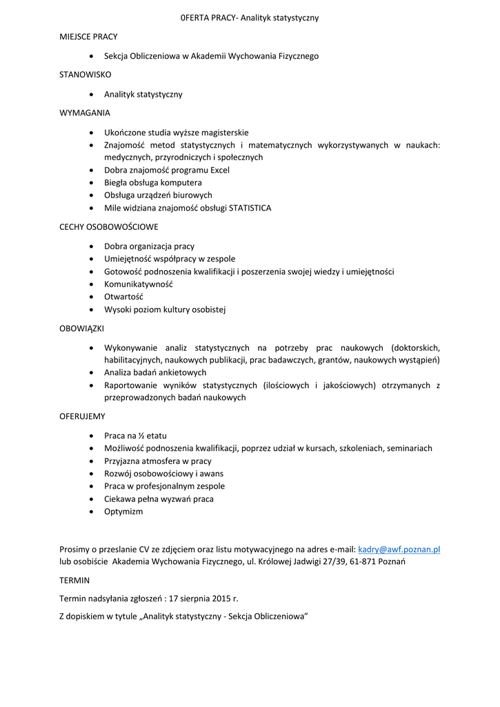 0FERTA PRACY- Analityk statystyczny MIEJSCE PRACY Sekcja Obliczeniowa w Akademii Wychowania Fizycznego STANOWISKO Analityk statystyczny WYMAGANIA Ukończone studia wyższe magisterskie Znajomość metod statystycznych i matematycznych wykorzystywanych w naukach: medycznych, przyrodniczych i społecznych Dobra znajomość programu Excel Biegła obsługa komputera Obsługa urządzeń biurowych Mile widziana znajomość obsługi STATISTICA CECHY OSOBOWOŚCIOWE Dobra organizacja pracy Umiejętność współpracy w zespole Gotowość podnoszenia kwalifikacji i poszerzenia swojej wiedzy i umiejętności Komunikatywność Otwartość Wysoki poziom kultury osobistej OBOWIĄZKI Wykonywanie analiz statystycznych na potrzeby prac naukowych (doktorskich, habilitacyjnych, naukowych publikacji, prac badawczych, grantów, naukowych wystąpień) Analiza badań ankietowych Raportowanie wyników statystycznych (ilościowych i jakościowych) otrzymanych z przeprowadzonych badań naukowych OFERUJEMY Praca na ½ etatu Możliwość podnoszenia kwalifikacji, poprzez udział w kursach, szkoleniach, seminariach Przyjazna atmosfera w pracy Rozwój osobowościowy i awans Praca w profesjonalnym zespole Ciekawa pełna wyzwań praca Optymizm Prosimy o przeslanie CV ze zdjęciem oraz listu motywacyjnego na adres e-mail: [email protected] lub osobiście Akademia Wychowania Fizycznego, ul. Królowej Jadwigi 27/39, 61-871 Poznań TERMIN Termin nadsyłania zgłoszeń : 17 sierpnia 2015 r. Z dopiskiem w tytule „Analityk statystyczny - Sekcja Obliczeniowa”