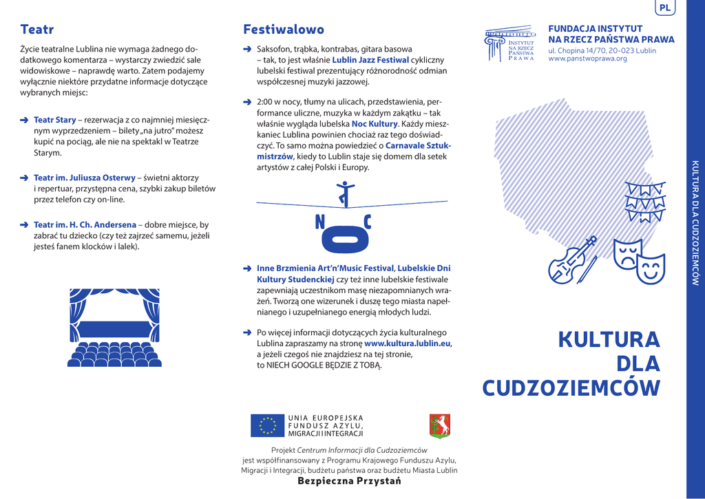 PL Teatr Życie teatralne Lublina nie wymaga żadnego dodatkowego komentarza – wystarczy zwiedzić sale widowiskowe – naprawdę warto. Zatem podajemy wyłącznie niektóre przydatne informacje dotyczące wybranych miejsc: eatr Stary – rezerwacja z co najmniej miesięczT nym wyprzedzeniem – bilety „na jutro” możesz kupić na pociąg, ale nie na spektakl w Teatrze Starym. S aksofon, trąbka, kontrabas, gitara basowa – tak, to jest właśnie Lublin Jazz Festiwal cykliczny lubelski festiwal prezentujący różnorodność odmian współczesnej muzyki jazzowej. Fundacja Instytut na rzecz Państwa Prawa ul. Chopina 14/70, 20-023 Lublin www.panstwoprawa.org :00 w nocy, tłumy na ulicach, przedstawienia, per2 formance uliczne, muzyka w każdym zakątku – tak właśnie wygląda lubelska Noc Kultury. Każdy mieszkaniec Lublina powinien chociaż raz tego doświadczyć. To samo można powiedzieć o Carnavale Sztukmistrzów, kiedy to Lublin staje się domem dla setek artystów z całej Polski i Europy. KULTURA DLA CUDZOZIEMCów eatr im. Juliusza Osterwy – świetni aktorzy T i repertuar, przystępna cena, szybki zakup biletów przez telefon czy on-line. Festiwalowo eatr im. H. Ch. Andersena – dobre miejsce, by T zabrać tu dziecko (czy też zajrzeć samemu, jeżeli jesteś fanem klocków i lalek). I nne Brzmienia Art’n’Music Festival, Lubelskie Dni Kultury Studenckiej czy też inne lubelskie festiwale zapewniają uczestnikom masę niezapomnianych wrażeń. Tworzą one wizerunek i duszę tego miasta napełnianego i uzupełnianego energią młodych ludzi. o więcej informacji dotyczących życia kulturalnego P Lublina zapraszamy na stronę www.kultura.lublin.eu, a jeżeli czegoś nie znajdziesz na tej stronie, to NIECH GOOGLE BĘDZIE Z TOBĄ. Projekt Centrum Informacji dla Cudzoziemców jest współfinansowany z Programu Krajowego Funduszu Azylu, Migracji i Integracji, budżetu państwa oraz budżetu Miasta Lublin Bezpieczna Przystań KULTURA DLA CUDZOZIEMCów Lublin od zawsze był miastem wielokulturowym – znajduje się przecież na pograniczu wielu kultur, wierzeń i tradycji. Fascynacja mieszkańców „koziego grodu” sztuką, muzyką, teatrem oraz innymi formami szeroko pojętej kultury zaowocowała rozwojem infrastruktury kulturalnej miasta. Zapewne każdy poszukiwacz kulturalnych doznań znajdzie tu coś dla siebie. Muzyka eatr Muzyczny jak i Filharmonia Lubelska T są wspaniałymi miejscami dla osób kochających muzykę. Opera, musical, balet, koncert, komedia muzyczna - wszystko to znajdziesz w potężnym repertuarze tych miejsc. Sport Osobom poszukującym aktywnego wypoczynku Lublin oferuje cały szereg sportowych atrakcji. rena Lublin – nowoczesny stadion miejski A przyjmujący największe wydarzenia sportowe na Lubelszczyźnie, jak np. mecze piłki nożnej, futbolu amerykańskiego, rugby i inne. qua Lublin – największy w regionie oraz najnoA wocześniejszy w Polsce kompleks basenowy. Za bilet nie zapłacisz dużo, a frajda niesamowita. Doznania wizualne aleria Biała w CK; Galeria Labirynt G – warto czasami pobłądzić, poszukać drogi w krętych zakamarkach sztuki współczesnej. ala Globus – zapraszamy na trybuny najwiękH szego w regionie obiektu sportowego stworzonego do sportów halowych. Obejrzysz tutaj mecze piłki ręcznej, siatkówki czy koszykówki. ielbicieli bardziej tradycyjnego malarstwa zaW chęcamy do odwiedzania Muzeum Lubelskiego oraz klimatycznych galerii sztuki porozrzucanych po Starym Mieście. łoneczny Wrotków – kompleks basenów na S świeżym powietrzu znajdujący się nad Zalewem Zemborzyckim – fantastyczne miejsce na upalne letnie dni. Nad Zalewem możesz też popływać na kajaku, nartach wodnych, czy nawet spróbować windsurfingu. jeżeli wolisz posłuchać muzyki na świeżym A powietrzu, to warto śledzić wydarzenia w Muszli Koncertowej znajdującej się w Ogrodzie Saskim czy też przespacerować się czasami na Most Kultury. Pozytywne emocje gwarantowane (a na dodatek za free). ubelski Rower Miejski – wystarczy tylko się L zalogować do systemu i zasilić swoje konto. TYLE! – od teraz masz dostęp do około 900 rowerów dostępnych na 90 stacjach rowerowych. Dodatkowo pierwsze 20 minut wypożyczenia masz za darmo, a jeżeli „dobijesz do godziny”, to zapłacisz tylko 1 zł. la miłośników „sowiego życia” otwarte są drzwi D dziesiątków klubów i pubów. Warto też śledzić ofertę różnorodnych festiwali odbywających się na terenie miasta – zdziwisz się, jak dużo ich jest. entralny Plac Zabaw – fantastyczna inicjatywa C CK w Lublinie, która pozwala codziennie doświadczać i uczyć się czegoś nowego. Możesz tu spróbować parkuru, poeksperymentować ze street workout, poskakać na deskorolce czy BMX – jeżeli pogoda dopisuje, to adrenalina gwarantowana.