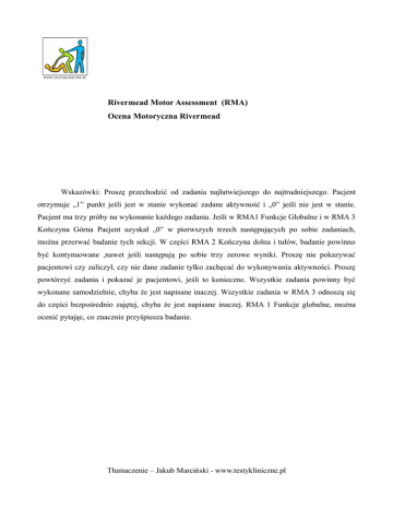 Rivermead Motor Assessment (RMA) Ocena Motoryczna Rivermead Wskazówki: Proszę przechodzić od zadania najłatwiejszego do najtrudniejszego. Pacjent otrzymuje „1” punkt jeśli jest w stanie wykonać zadane aktywność i „0” jeśli nie jest w stanie. Pacjent ma trzy próby na wykonanie każdego zadania. Jeśli w RMA1 Funkcje Globalne i w RMA 3 Kończyna Górna Pacjent uzyskał „0” w pierwszych trzech następujących po sobie zadaniach, można przerwać badanie tych sekcji. W części RMA 2 Kończyna dolna i tułów, badanie powinno być kontynuowane ,nawet jeśli następują po sobie trzy zerowe wyniki. Proszę nie pokazywać pacjentowi czy zaliczył, czy nie dane zadanie tylko zachęcać do wykonywania aktywności. Proszę powtórzyć zadania i pokazać je pacjentowi, jeśli to konieczne. Wszystkie zadania powinny być wykonane samodzielnie, chyba że jest napisane inaczej. Wszystkie zadania w RMA 3 odnoszą się do części bezpośrednio zajętej, chyba że jest napisane inaczej. RMA 1 Funkcje globalne, można ocenić pytając, co znacznie przyśpiesza badanie. Tłumaczenie – Jakub Marciński - www.testykliniczne.pl RMA1. Funkcje Globalne 0 / 1 1. SIAD BEZ PODPARCIA 0 / 1 Bez trzymania, na brzegu leżanki, stopy bez podporu 2. PRZEJŚCIE Z LEŻENIA DO SIADU NA BRZEGU LEŻANKI 0 / 1 Sposób dowolny 3. PRZEJŚCIE Z SIADU DO STANIA 0 / 1 Można pomóc sobie rękami, wstawanie nie może trwać dłużej niż 15 sekund i stanie powinno trwać minimum 15 sekund z pomocą jeśli jest potrzebna 4. TRANSFER Z WÓZKA NA KRZESŁO PRZEZ POŚREDNIO ZAJĘTĄ STRONĘ 0 / 1 Można pomagać sobie rekami 5. TRANSFER Z WÓZKA NA KRZESŁO PRZEZ BEZPOŚREDNIO ZAJĘTĄ STRONĘ 0 / 1 Można pomagać sobie rękami, nogi zgięte w kolanach 6. CHÓD 10 METRÓW WEWNĄTRZ Z POMOCĄ 0 / 1 Chodzenie bez zatrzymania 7. SAMODZIELNE WEJŚCIE NA SCHODY 0 / 1 Sposób dowolny, można używać poręczy 8. CHÓD 10 METRÓW WEWNĄTRZ BEZ POMOCY 0 / 1 Bez zatrzymania, bez łuski, ani żadnej innej pomocy 9. CHÓD 10 METRÓW, PODNIESIENIE WORECZKA Z GROCHEM Z PODŁOGI, 0 / 1 OBRÓT I Z POWROTEM Można się schylić w dowolny sposób, można używać pomocy do chodzenia, bez zatrzymania, można użyć dowolnej ręki do podniesienia woreczka 10. CHÓD NA ZEWNĄTRZ 40 METRÓW 0 / 1 Można używać pomocy do chodzenia, bez zatrzymania 11. WEJŚCIE I ZEJŚCIE Z 4 SCHODKÓW 0 / 1 Pacjent może korzystać z pomocy jeśli ją potrzebuje, ale nie może trzymać sie poręczy. Ukazuje to sposób radzenia sobie z krawężnikami oraz przy braku poręczy. 12. BIEG 10 METRÓW 0 / 1 Musi być symetryczny 13. PODSKOKI NA BEZPOŚREDNIO ZAJĘTEJ NODZE 5 RAZY W MIEJSCU Bez pomocy kkg, bez przerw na złapanie równowagi, bez supinacji przodostopia Tłumaczenie – Jakub Marciński - www.testykliniczne.pl 0 / 1 RMA2. Kończyna dolna i tułów 1. OBRÓT NA BEZPOŚREDNIO ZAJĘTĄ STRONĘ 0 / 1 Pozycja wyjściowa: Leżenie na plecach 2. OBRÓT NA POŚREDNIO ZAJĘTĄ STRONĘ 0 / 1 Pozycja wyjściowa: Leżenie na plecach 3. POZYCJA MOSTKA 0 / 1 Pozycja początkowa: Leżenie na plecach, dociśnięcie pleców do leżanki ( ruch tyło pochylenia miednicy), w połowie zakresu ruchu . Pacjent musi obciążyć częściowo zajętą kończynę dolną. Terapeuta może ustawić nogę, ale pacjent musi sam ją utrzymać 4. PRZEJŚCIE Z SIADU DO STANIA 0 / 1 Bez użycia kończyn górnych, obie stopy równo na podłodze, Ciężar ciała na obu nogach 5. PODNIEŚ ZAJĘTĄ NOGE NAD BRZEG ŁÓŻKA I WRÓĆ 0 / 1 Leżenie na plecach. Noga zajęta zgięta w kolanie, bez rotacji zewnętrznej, po opuszczeniu na podłogę, podest. Biodro w pozycji neutralnej a kolano zgięte 6. STANIE: POSTAW NOGE POŚREDNIO ZAJĘTA NA PODWYŻSZENIU I WRÓĆ 0 / 1 Bez retrakcji miednicy, i przeprostu w kolanie .W ten sposób badamy możliwości biodra i kolana w trakcie transferu ciężaru ciała 7. STANIE – TUPNIJ NOGĄ POŚREDIO ZAJĘTA W PODŁOŻE 5 RAZY 0 / 1 Bez retrakcji miednicy, i przeprostu w kolanie .W ten sposób badamy możliwości biodra i kolana w trakcie transferu ciężaru ciała, tak jak w punkcie 6, ale jest to trudniejsze zadanie 8. LEŻENIE NA PLECACH, ZGIĘCIE GRZBIETOWE STOPY PRZY ZGIĘTYM 0 / 1 KOLANIE Fizjoterapeuta może trzymać nogę w pozycji, bez inwersji stopy. Połowa możliwego zakresu ruchu stopy zalicza zadanie 9. LEŻENIE NA PLECACH, ZGIĘCIE GRZBIETOWE STOPY PRZY PROSTYM 0 / 1 KOLANIE Fizjoterapeuta może trzymać nogę w pozycji, bez inwersji stopy, bez zgięcia w kolanie. Połowa możliwego zakresu ruchu stopy zalicza zadanie 10. STANIE, BIODRO NOGI BEZPOŚREDNIO ZAJĘTEJ W POZYCJI NEUTRALNEJ, ZGIĘCIE ZAJĘTEGO KOLANA Terapeucie nie wolno ustawić nogi pacjenta, jest to niezwykle trudne dla większości pacjentów z hemiparezą, ale pozwala wychwycić minimalne dysfunkcje pacjenta. Tłumaczenie – Jakub Marciński - www.testykliniczne.pl 0 / 1 RMA3. Kończyna górna 1. LEŻENIE NA PLECACH, PROTRAKCJA OBRĘCZY BARKOWEJ Z UNIESIONYM 0 / 1 RAMIENIEM Ramię może być podtrzymane 2. LEŻENIE, UTRZYMAJ UNIESIONĄ, WYPROSTOWANĄ RĘKĘ PRZEZ 2 SEKUNDY 0 / 1 (ZAZNACZONA ROTACJA ZEW) Terapeuta układa rękę w pozycji a pacjent musi utrzymać (nie w rotacji wewnętrznej)łokieć wyprostowany przynajmniej w 150 stopniach 3. ZGIĘCIE WYPROST ŁOKCIA TAK JAK W PKT 2. 0 / 1 Część dłoniowa ręki nie powinna wystawać na zewnątrz w czasie ruchu 4. PACJENT SIEDZI. ŁOKIEĆ PRZYWIEDZIONY DO CIAŁA. PRONACJA I SUPINACJA 0 / 1 PRZEDRAMIENIA ¾ prawidłowego ruchu jest akceptowalne, łokieć nie podparty 5. PACJENT SIEDZI. SIĘGNIJ DO PRZODU, ZŁAP DUŻĄ PIŁKĘ OBIEMA REKAMI I ODSTAW Z 0 / 1 POWROTEM Piłka powinna być przed pacjentem na stole tak daleko, żeby musiał wyprostować ręce. Ramiona w protrakcji, łokcie proste, palce prostują się w trakcie ruchu, cały czas kontakt cz. dłoniowej z piłką 6. PACJENT SIEDZI. WYPROSTUJ RAMIE, SIĘGNIJ DO PRZODU ZŁAP PIŁECZKĘ TENISOWĄ, 0 / 1 WRÓĆ Z NIĄ DO STRONY ZAJĘTEJ, ROZLUŹNIJ RĘKE, Z
