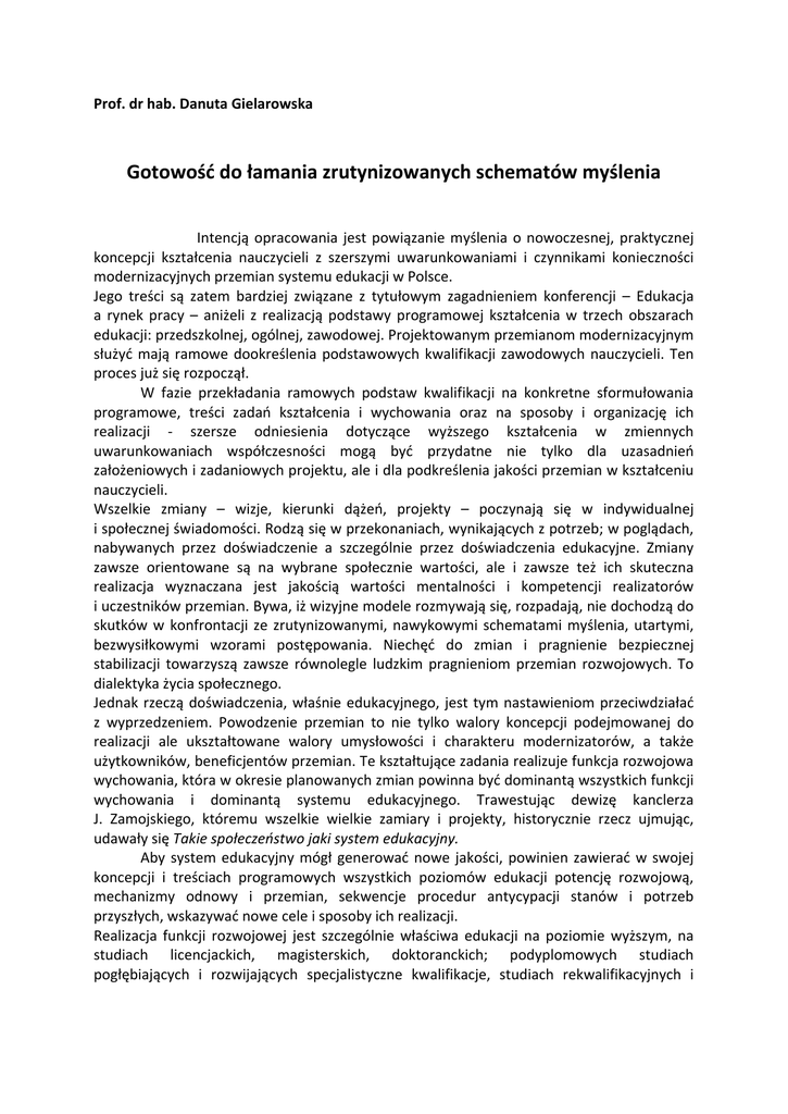 Prof. dr hab. Danuta Gielarowska Gotowość do łamania zrutynizowanych schematów myślenia Intencją opracowania jest powiązanie myślenia o nowoczesnej, praktycznej koncepcji kształcenia nauczycieli z szerszymi uwarunkowaniami i czynnikami konieczności modernizacyjnych przemian systemu edukacji w Polsce. Jego treści są zatem bardziej związane z tytułowym zagadnieniem konferencji – Edukacja a rynek pracy – aniżeli z realizacją podstawy programowej kształcenia w trzech obszarach edukacji: przedszkolnej, ogólnej, zawodowej. Projektowanym przemianom modernizacyjnym służyć mają ramowe dookreślenia podstawowych kwalifikacji zawodowych nauczycieli. Ten proces już się rozpoczął. W fazie przekładania ramowych podstaw kwalifikacji na konkretne sformułowania programowe, treści zadań kształcenia i wychowania oraz na sposoby i organizację ich realizacji - szersze odniesienia dotyczące wyższego kształcenia w zmiennych uwarunkowaniach współczesności mogą być przydatne nie tylko dla uzasadnień założeniowych i zadaniowych projektu, ale i dla podkreślenia jakości przemian w kształceniu nauczycieli. Wszelkie zmiany – wizje, kierunki dążeń, projekty – poczynają się w indywidualnej i społecznej świadomości. Rodzą się w przekonaniach, wynikających z potrzeb; w poglądach, nabywanych przez doświadczenie a szczególnie przez doświadczenia edukacyjne. Zmiany zawsze orientowane są na wybrane społecznie wartości, ale i zawsze też ich skuteczna realizacja wyznaczana jest jakością wartości mentalności i kompetencji realizatorów i uczestników przemian. Bywa, iż wizyjne modele rozmywają się, rozpadają, nie dochodzą do skutków w konfrontacji ze zrutynizowanymi, nawykowymi schematami myślenia, utartymi, bezwysiłkowymi wzorami postępowania. Niechęć do zmian i pragnienie bezpiecznej stabilizacji towarzyszą zawsze równolegle ludzkim pragnieniom przemian rozwojowych. To dialektyka życia społecznego. Jednak rzeczą doświadczenia, właśnie edukacyjnego, jest tym nastawieniom przeciwdziałać z wyprzedzeniem. Powodzenie przemian to nie tylko walory koncepcji podejmowanej do realizacji ale ukształtowane walory umysłowości i charakteru modernizatorów, a także użytkowników, beneficjentów przemian. Te kształtujące zadania realizuje funkcja rozwojowa wychowania, która w okresie planowanych zmian powinna być dominantą wszystkich funkcji wychowania i dominantą systemu edukacyjnego. Trawestując dewizę kanclerza J. Zamojskiego, któremu wszelkie wielkie zamiary i projekty, historycznie rzecz ujmując, udawały się Takie społeczeństwo jaki system edukacyjny. Aby system edukacyjny mógł generować nowe jakości, powinien zawierać w swojej koncepcji i treściach programowych wszystkich poziomów edukacji potencję rozwojową, mechanizmy odnowy i przemian, sekwencje procedur antycypacji stanów i potrzeb przyszłych, wskazywać nowe cele i sposoby ich realizacji. Realizacja funkcji rozwojowej jest szczególnie właściwa edukacji na poziomie wyższym, na studiach licencjackich, magisterskich, doktoranckich; podyplomowych studiach pogłębiających i rozwijających specjalistyczne kwalifikacje, studiach rekwalifikacyjnych i przede wszystkim zapewniających odnowę wiedzy oraz sposobów myślenia zawodowego i społecznego. Aktualnie w odniesieniu do koncepcji kształcenia nauczycieli funkcjonują nadal dwa modele tej koncepcji: -łączenie kształcenia z badaniami naukowymi, zatem dominacja gromadzenia, wytwarzania i przekazu wiedzy, gdzie wytwarzanie wiedzy wymaga postępowania studialnego, biegłości metodologicznej; uzdolnień badawczych, poszukiwań twórczych, transgresyjności intelektualnej w postepowaniu poznawczym, -łączenie teorii z kształceniem praktycznym, zatem selektywne w odniesieniu do celów praxis gromadzenie i przekazywanie wiedzy oraz jej upraktycznianie. W ustabilizowanej już w Polsce masowości i powszechnej dostępności wyższego kształcenia elitarna wersja kształcenia akademickiego, t.j. uprawiania badań i wytwarzania wiedzy pozostaje domeną ośrodków akademickich, prowadzących naukowe studia doktoranckie lub ośrodków naukowo-badawczych, gdzie wytwarzany jest naukowy lub technologiczny i kulturowy produkt. Perspektywiczne i aktualne warunki wymagają rozwijania koncepcji praxis, tj. teoretycznego pogłębienia kształcenia praktycznego, tu kształcenia nauczycieli dla dobrej praktyki. Dobra praktyka według literatury przedmiotu zakłada: wysoki profesjonalizm, oparty na aktualnej wiedzy teoretycznej, która jest tworzywem myślenia twórczego i działalności; • nowoczesnych ustaleń z badań dokonanych i towarzyszących działaniom; • stosowanie naukowych metod myślenia i opracowywania projektów; • innowacyjność oraz praktyczną mobilność kwalifikacji, których efekty zawarte są w procedurach i standardach Upraktycznienia koncepcji kształcenia nauczycieli nie należy utożsamiać z uzawodowieniem wyksztalcenia, zaniechaniem jego akademickiej jakości. Tradycyjna akademickość kształcenia zawiera w swojej istocie walory szczególnie przydatne w nowych, zmiennych, zintensyfikowanych i przyspieszonych w stawaniu się warunkach. Jest to pogłębiona, ustrukturalizowana i sproblematyzowana wiedza przedmiotowa jako podstawowe tworzywo wszelkiej dalszej twórczości. Wiedza osadzona i powiązana z subdyscyplinarnym i interdyscyplinarnym kontekstem oraz doświadczenie intelektualne i otwartość na różne sposoby uprawiania wiedzy, różne postrzeganie i interpretowanie rzeczywistości. Akademickość to poszukiwanie prawdy czyli stała gotowość porzucania zastanych, narzuconych bądź zrutynizowanych sposobów myślenia. Dobra praktyka to umiejętność spostrzegania problemów, dookreślanie ich, definiowanie, a przede wszystkim zaprojektowanie programu i procedury rozwiązań i ich ewaluacji. Jest to także umiejętność facylitacji projektu z wyobrażeniem rzeczowych i społec