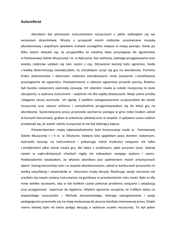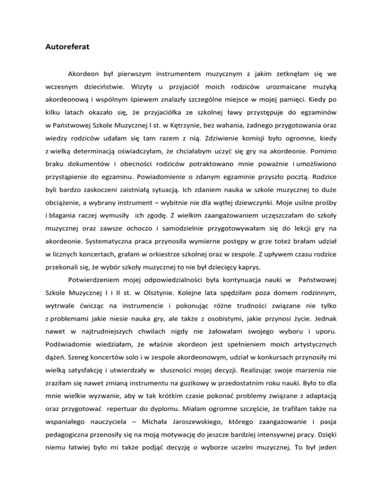Autoreferat Akordeon był pierwszym instrumentem muzycznym z jakim zetknęłam się we wczesnym dzieciństwie. Wizyty u przyjaciół moich rodziców urozmaicane muzyką akordeonową i wspólnym śpiewem znalazły szczególne miejsce w mojej pamięci. Kiedy po kilku latach okazało się, że przyjaciółka ze szkolnej ławy przystępuje do egzaminów w Państwowej Szkole Muzycznej I st. w Kętrzynie, bez wahania, żadnego przygotowania oraz wiedzy rodziców udałam się tam razem z nią. Zdziwienie komisji było ogromne, kiedy z wielką determinacją oświadczyłam, że chciałabym uczyć się gry na akordeonie. Pomimo braku dokumentów i obecności rodziców potraktowano mnie poważnie i umożliwiono przystąpienie do egzaminu. Powiadomienie o zdanym egzaminie przyszło pocztą. Rodzice byli bardzo zaskoczeni zaistniałą sytuacją. Ich zdaniem nauka w szkole muzycznej to duże obciążenie, a wybrany instrument – wybitnie nie dla wątłej dziewczynki. Moje usilne prośby i błagania raczej wymusiły ich zgodę. Z wielkim zaangażowaniem uczęszczałam do szkoły muzycznej oraz zawsze ochoczo i samodzielnie przygotowywałam się do lekcji gry na akordeonie. Systematyczna praca przynosiła wymierne postępy w grze toteż brałam udział w licznych koncertach, grałam w orkiestrze szkolnej oraz w zespole. Z upływem czasu rodzice przekonali się, że wybór szkoły muzycznej to nie był dziecięcy kaprys. Potwierdzeniem mojej odpowiedzialności była kontynuacja nauki w Państwowej Szkole Muzycznej I i II st. w Olsztynie. Kolejne lata spędziłam poza domem rodzinnym, wytrwale ćwicząc na instrumencie i pokonując różne trudności związane nie tylko z problemami jakie niesie nauka gry, ale także z osobistymi, jakie przynosi życie. Jednak nawet w najtrudniejszych chwilach nigdy nie żałowałam swojego wyboru i uporu. Podświadomie wiedziałam, że właśnie akordeon jest spełnieniem moich artystycznych dążeń. Szereg koncertów solo i w zespole akordeonowym, udział w konkursach przynosiły mi wielką satysfakcję i utwierdzały w słuszności mojej decyzji. Realizując swoje marzenia nie zraziłam się nawet zmianą instrumentu na guzikowy w przedostatnim roku nauki. Było to dla mnie wielkie wyzwanie, aby w tak krótkim czasie pokonać problemy związane z adaptacją oraz przygotować repertuar do dyplomu. Miałam ogromne szczęście, że trafiłam także na wspaniałego nauczyciela – Michała Jaroszewskiego, którego zaangażowanie i pasja pedagogiczna przenosiły się na moją motywację do jeszcze bardziej intensywnej pracy. Dzięki niemu łatwiej było mi także podjąć decyzję o wyborze uczelni muzycznej. To był jeden 2 z trudniejszych momentów w moim życiu. Z jednej strony wiedziałam, że studia to kolejny, niezbędny etap mojej edukacji, z drugiej zaś będąc już matką „skazywałam” siebie i dziecko na długą rozłąkę. Mimo wielu wątpliwości i osobistych rozterek uznałam, że kontynuacja nauki to dla mnie wielka szansa zarówno na dalszy rozwój artystyczny jak i na zdobycie dobrego wykształcenia. Zawiłe ścieżki życiowe skierowały więc kolejny etap mojej edukacji artystycznej do Akademii Muzycznej w Katowicach. Dzień 1 października 1990 roku był wyjątkowy nie tylko ze względu na moją immatrykulację ale przede wszystkim z uwagi na fakt śmierci Andrzeja Krzanowskiego. Widząc wypełniony po brzegi autokar wyruszający na pogrzeb w dniu 5 października nie miałam najmniejszej świadomości jak wielką osobowością twórczą był przedwcześnie zmarły kompozytor. Setki kilometrów dzielące Śląsk od moich rodzinnych stron stanowiły w tamtych czasach istotną przeszkodę w dostępie do informacji. Brak materiałów nutowych oraz fachowej literatury uniemożliwił zdobycie wiedzy na temat działalności śląskich kompozytorów i ich ogromnego wkładu w rozwój kultury muzycznej i oryginalnej literatury akordeonowej. Z twórczością Andrzeja Krzanowskiego zetknęłam się po raz pierwszy dzięki festiwalowi Alkagran, który odbył się w 1991 r. w Czechowicach – Dziedzicach, w rocznicę jego śmierci. Była to dla mnie możliwość usłyszenia nieznanej mi dotąd muzyki, tak bardzo odmiennej od stylistyki w jakiej byłam wychowana. Moje dotychczasowe wykształcenie muzyczne opierało się bowiem na tradycyjnym repertuarze. Na polskiej, rosyjskiej i niemieckiej literaturze akordeonowej o neostylistycznym charakterze, toteż zrozumienie kompozycji twórcy Audycji wymagało czasu. Studia znacząco wpłynęły na zmianę mojego podejścia do problemów wykonawstwa instrumentalnego. Poznałam nieznane mi dotąd możliwości brzmieniowe akordeonu i nauczyłam się nimi operować, a wcześniej stosowane techniki bardziej świadomie wykorzystywać. Poszerzenie mojej wiedzy i zdobywanie nowych umiejętności było możliwe dzięki pracy z pedagogami: prof. Joachimem Pichurą oraz ad. Markiem Andryskiem. Pod ich kierunkiem stopniowo wkraczałam także w świat nieznanych mi współczesnych kompozycji akordeonowych. Okazało się, że praca nad utworami m.in. Andrzeja Krzanowskiego czy Edwarda Bogusławskiego daje ogromne możliwości rozwoju nie tylko w sferze umiejętności technicznych ale również w obszarze poszukiwań własnych rozwiązań interpretacyjnych. W dalszym ciągu jednak chętnie sięgałam 3 do repertuaru opierającego się zarówno na transkrypcjach jak i oryginalnych kompozycjach utrzymanych w klasycznym stylu. Momentem przełomowym moich artystycznych działań był IV rok studiów. W tym czasie pracowałam pod kierunkiem prof. Joachima Pichury, który zaproponował mi przygotowanie do Międzynarodowego Konkursu Akordeonowego w Reinach w Szwajcarii. Zdobycie II nagrody znaczyło dla mnie bardzo wiele. Sukces nie był tylko zwieńczeniem wytężonej pracy. Dzięki niemu podbudowałam poczucie własnej wartości oraz tak naprawdę uwierzyłam w swoje możliwości. Wymiernym efektem był udział w Festiwalu Laureatów Konku