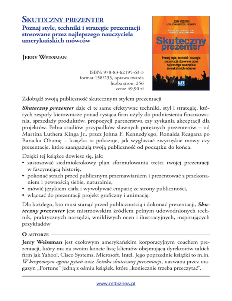 Skuteczny prezenter Poznaj style, techniki i strategie prezentacji stosowane przez najlepszego nauczyciela amerykańskich mówców Jerry Weissman ISBN: 978-83-62195-63-3 format 158/233, oprawa twarda liczba stron: 256 cena: 49,90 zł Zdobądź swoją publiczność skutecznym stylem prezentacji Skuteczny prezenter daje ci te same efektywne techniki, styl i strategię, których zespoły kierownicze ponad tysiąca firm użyły do podniesienia finansowania, sprzedaży produktów, propozycji partnerstwa czy zyskania akceptacji dla projektów. Pełna studiów przypadków sławnych potężnych prezenterów – od Martina Luthera Kinga Jr., przez Johna F. Kennedy’ego, Ronalda Reagana po Baracka Obamę – książka ta pokazuje, jak wygłaszać zwycięskie mowy czy prezentacje, które zaangażują twoją publiczność od początku do końca. Dzięki tej książce dowiesz się, jak: • zastosować siedmiokrokowy plan sformułowania treści twojej prezentacji w fascynującą historię, • pokonać strach przed publicznym przemawianiem i prezentować z przekonaniem i pewnością siebie, naturalnie, • mówić językiem ciała i wywoływać empatię ze strony publiczności, • włączać do prezentacji projekt graficzny i animację. Dla każdego, kto musi stanąć przed publicznością i dokonać prezentacji, Skuteczny prezenter jest mistrzowskim źródłem pełnym udowodnionych technik, praktycznych narzędzi, wnikliwych ocen i ilustracyjnych, inspirujących przykładów O autorze Jerry Weissman jest czołowym amerykańskim korporacyjnym coachem prezentacji, który ma na swoim koncie listę klientów obejmującą dyrektorów takich firm jak Yahoo!, Cisco Systems, Microsoft, Intel. Jego poprzednie książki to m.in. W krzyżowym ogniu pytań oraz Sztuka skutecznej prezentacji, nazwana przez magazyn „Fortune” jedną z ośmiu książek, które „koniecznie trzeba przeczytać”. www.mtbiznes.pl Skuteczny prezenter Spis treści PRZEDMOWA. Zły i dobry sposób trenowania prezentacji ........... 11 Studium przypadku: Dizzy Gillespie WPROWADZENIE. Jak styl przemawiania i umiejętność wygłaszania mogą podnieść wartość IPO .................................... Studia przypadków: Cisco Systems; Isilon Systems; Dwa tygodnie prezentacji IPO; RetailRoadshow.com 13 ROZDZIAŁ 1. Twoje czyny mówią głośniej niż twoje słowa .......... 21 Studia przypadków: Ronald Reagan; Pacjenci z afazją dr. Sachsa; Nikita Chruszczow; Marcel Marceau ROZDZIAŁ 2. Kluczowe zadanie: wywołanie empatii publiczności 33 Studia przypadków: Jeleń w światłach reflektorów; Szokujące brytyjskie pary; Włoskie małpy laboratoryjne; Robert Krulwich; Bob Dole; Gray Davis versus Arnold Schwarzenegger; Barack Obama ROZDZIAŁ 3. Motylki w brzuchu ............................................... 45 Studium przypadku: Wrześniowy poranek ROZDZIAŁ 4. Jak przygotować treść. Siedem kroków opracowywania historii .......................................................... Studia przypadków: Will Poole i Jeff Raikes, Microsoft; Patrick McGovern, IDG 51 ROZDZIAŁ 5. Możesz być skutecznym prezenterem – charyzma nie jest konieczna ........................................................................ Studia przypadków: Przemiany George’a W. Busha i Billa Clintona www.mtbiznes.pl 7 61 Skuteczny prezenter SKUTECZNY PREZENTER ROZDZIAŁ 6. Umysłowa Metoda Prezentowania. Spraw, aby motylki latały w szyku .................................................... 73 Studia przypadków: Studio Aktorskie; Barack Obama versus Hillary Rodham Clinton; Libby Dole; Carly Simon; Marya McCabe, Microsoft; Lawrence Steinman; Kobieta, która mrużyła oczy ROZDZIAŁ 7. Naucz się mówić językiem ciała ............................ 97 Studia przypadków: Joe Moglia, TD Ameritrade; Marshall Klaus, sir Isaac Newton; Generałowie Richard Neal i H. Norman Schwarzkopf; Debata Kennedy–Nixon ROZDZIAŁ 8. Kontroluj swoją intonację ..................................... 129 Studia przypadków: Francuz, który pauzował; Artyści jazzowi Frank Sinatra, Ella Fitzgerald, Amanda Carr i Dizzy Gillespie; Generał Israel Putnam; Ludwig van Beethoven; Dr Krzysztof Izdebski i Claude Steinberg, Pacific Voice and Speech Foundation; Leonard Bernstein; Lorin Maazel; Dalsza przemiana George’a W. Busha ROZDZIAŁ 9. Mistrzowie gry ..................................................... 157 Studia przypadków: Sir Winston Churchill; John F. Kennedy; Wielebny Martin Luther King Jr.; Wielebny Billy Graham; Ronald Reagan; Barack Obama ROZDZIAŁ 10. Czego każdy mówca może nauczyć się od Baracka Obamy .................................................................... 173 Studia przypadków: Abraham Lincoln; John F. Kennedy; Sir Winston Churchill; Wielebny Martin Luther King Jr.; Ronald Reagan; John McCain ROZDZIAŁ 11. Synchronizacja Grafiki ........................................ 189 Studia przypadków: Federico Fellini; Olivier Fontana, Microsoft; Bill Jasper, Dolby Laboratories; Goldman Sachs ROZDZIAŁ 12. Grafika i narracja ............................................... 209 Studia przypadków: Leslie Culbertson, Intel; Katherine Crothall, Animas; Eric Tardif, Piper Jaffray; Abraham Lincoln www.mtbiznes.pl 8 Skuteczny prezenter SPIS TREŚCI ROZDZIAŁ 13. Piramida Power Presentations ............................ 221 Studium przypadku: Debata na temat NAFTA: Al Gore versus Ross Perot ROZDZIAŁ 14. Koda – zakończenie z początkiem ...................... 235 Studia przypadków: Ponownie Ronald Reagan i Joe Moglia; Cindy Burgdorf, SanDisk Podziękowania ........................................................................... 239 Przypisy ..................................................................................... 243 Indeks ....................................................................................... 249 www.mtbiznes.pl 9 Skuteczny prezenter 1 Twoje czyny mówiÈ gïoĂniej niĝ twoje sïowa Mówić (czasownik) 5a. Przekazywać wi