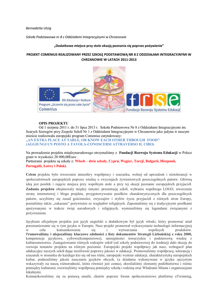 Bernadetta Utzig Szkoła Podstawowa nr 8 z Oddziałami Integracyjnymi w Chrzanowie „Dodatkowe miejsce przy stole okazją poznania się poprzez pożywienie” PROJEKT COMENIUS REALIZOWANY PRZEZ SZKOŁĘ PODSTAWOWĄ NR 8 Z ODDZIAŁAMI INTEGRACYJNYMI W CHRZANOWIE W LATACH 2011-2013 OPIS PROJEKTU Od 1 sierpnia 2011 r. do 31 lipca 2013 r. Szkoła Podstawowa Nr 8 z Oddziałami Integracyjnymi im. Szarych Szeregów przy Zespole Szkół Nr 1 z Oddziałami Integracyjnymi w Chrzanowie jako jedyna w naszym mieście realizowała europejski program Comenius zatytułowany: „AN EXTRA PLACE AT TABLE, OR KNOW EACH OTHER THROUGH FOOD” (AGGIUNGI UN POSTO A TAVOLA-CONOSCERSI ATTRAVERSO IL CIBO) Na prowadzenie projektu międzynarodowego otrzymaliśmy z Fundacji Rozwoju Systemu Edukacji w Polsce grant w wysokości 20 000,00Euro . Partnerami projektu są szkoły z: Włoch – dwie szkoły, Cypru, Węgier, Turcji, Bułgarii, Hiszpanii, Portugalii, Łotwy i Polski. Celem projektu było stworzenie atmosfery współpracy i szacunku, wolnej od uprzedzeń i nietolerancji w społeczeństwach europejskich poprzez wiedzę o zwyczajach żywieniowych poszczególnych państw. Główną ideą jest posiłek i zajęcie miejsca przy wspólnym stole a przy tej okazji poznanie europejskich przyjaciół. Zadania projektu obejmowały między innymi: prezentację szkół, wybranie wspólnego LOGO, stworzenie strony internetowej i blogu projektu, przygotowywanie posiłków charakterystycznych dla poszczególnych państw, uczyliśmy się zasad gościnności, zwyczajów i stylów życia przyjaciół z różnych stron Europy, poznaliśmy także „zakazane” pożywienie ze względów religijnych. Zapoznaliśmy się z tradycyjnymi posiłkami spożywanymi w trakcie świąt narodowych i religijnych, wymieniliśmy się legendami związanymi z pożywieniem. Językiem oficjalnym projektu jest język angielski a dodatkowym był język włoski, który promować miał porozumiewanie się w tym języku w Europie. Nasz projekt promował wykorzystanie technologii informacyjnej w celu komunikowania się i wytwarzania wspólnych produktów. Promowaliśmy i ulepszaliśmy kluczowe zdolności z listy dokumentów Strategii Lizbońskiej z roku 2000, kompetencje językowe, cyfrowe(komputerowe), umiejętności towarzyskie i podstawową wiedzę z kulturoznawstwa. Zaangażowanie różnych rodzajów szkół (od szkoły podstawowej do średniej) dało okazję do rozwoju tematów projektu na różnym poziomie. Europejski projekt współpracy jak nasz, wzbogacił plan edukacyjny naszych szkół dając możliwość poprawy jakości w edukacji. Promowaliśmy współpracę, tolerancję i szacunek w stosunku do każdego kto się od nas różni, europejski wymiar edukacji, charakterystykę europejskich kultur, podnosiliśmy jakość nauczania języków obcych, (a działania wykonywane w języku ojczystym wskazywały na naszą różnorodność, która również jest cenna), określaliśmy elementy podobieństwa i różnic pomiędzy kulturami, rozwinęliśmy współpracę pomiędzy szkołą i rodziną oraz Władzami Miasta i organizacjami lokalnymi. Komunikowaliśmy się za pomocą emalii, chatów poprzez forum społecznościowe platformy eTwinning, korespondecji tradycyjnej i telefonicznej. Nasz projekt zamieściliśmy także na portal eTwinning, który za wysokie walory edukacyjne uzyskał Certyfikat eTwinning Label. W roku szkolnym 2011/2012 pracę rozpoczęliśmy od przygotowania i przeprowadzenia pierwszego spotkania szkół partnerskich w Chrzanowie. Na Spotkanie przybyło 77 Gości - koordynatorzy, nauczyciele, rodzice i uczniowie z 8 szkół podstawowych i jednego liceum ogólnokształcącego. W przygotowaniu wizyty serdeczną współpracę okazali nam pan Burmistrz Miasta Chrzanowa Ryszard Kosowski, pan Wiceburmistrz Robert Maciaszek. Małopolski Kurator Oświaty, pan Aleksander Palczewski objął nasz Projekt Honorowym Patronatem Kuratorium Oświaty w Krakowie. Pokazowe lekcje poprzedziły uroczystość Inauguracji Projektu, która odbyła się w Sali Teatralnej MOKSiR- u. Każda ze szkół miała okazję zaprezentowania swojego kraju, miasta, szkoły oraz wystąpienia z krótkim programem artystycznym. Nasza szkoła dziękowała delegacjom partnerskich szkół profesjonalną piosenką i tańcem. Swoją obecnością zaszczyciły nas Władze Miasta, władze oświatowe, dyrektorzy szkół, przyjaciele naszej szkoły i rodzice. Uroczystość Inauguracji była świętem przyjaźni i współpracy międzynarodowej szkół partnerskich. Po Inauguracji odbyło się Spotkanie Uczestników Projektu z panem Wice-Burmistrzem Miasta Chrzanowa Robertem Maciaszkiem w Sali Marmurowej Pałacu Ślubów. Szkolni koordynatorzy projektu odebrali pamiątki i życzenia owocnej współpracy dla dyrektorów poszczególnych szkół. Posadziliśmy 10 pamiątkowych drzewek przed budynkiem Szkoły Podstawowej nr 8. Zorganizowaliśmy wycieczki do Nadwiślańskiego Parku Etnograficznego w Wygiełzowie, do Radzionkowa do Muzeum Chleba, gdzie lekcja historii połączona została z własnoręcznym wypiekiem bułek. Wycieczka do Zakopanego była okazją poznania regionalnej kuchni, a Kraków i Kopalnia Soli w Wieliczce stały się dla Gości ucztą kulturową i poznawczą. Dzięki życzliwej współpracy z Urzędem Miasta stworzyliśmy stronę internetową projektu i blog, gdzie Partnerzy, uczniowie, rodziny i szkolna kadra ma dostęp, żeby przeglądać treści i dodawać nowe produkty naszych działań. W naszej szkole odbył się konkurs na wspólne Logo projektu. Uczniowie opracowali temat śniadania w postaci lekcji pokazowych, prezentacji, filmów i ankiety. Rezultaty zawieżliśmy na Cypr, gdzie w Szkole Podstawowej w Apsiou, liczącej jedynie 33 uczniów odbyło się drugie spotkanie szkół. Tu fascynacje kulinarne sprawdzaliśmy z umiejętnościami podczas gotowania europejskiego lunchu. Wycieczki do starożytnych miejsc wzbogaciły nasząwiedzę na temat tego uroczego kraju. 