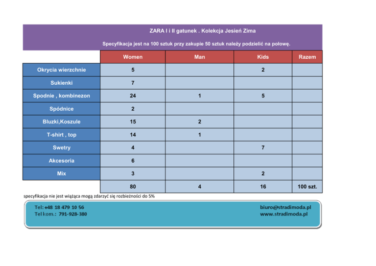 ZARA I i II gatunek . Kolekcja Jesień Zima Specyfikacja jest na 100 sztuk przy zakupie 50 sztuk należy podzielić na połowę. Women Man Okrycia wierzchnie 5 Sukienki 7 Spodnie , kombinezon 24 Spódnice 2 Bluzki,Koszule 15 2 T-shirt , top 14 1 Swetry 4 Akcesoria 6 Mix 3 80 specyfikacja nie jest wiążąca mogą zdarzyć się rozbieżności do 5% Kids Razem 2 1 5 7 2 4 16 100 szt.