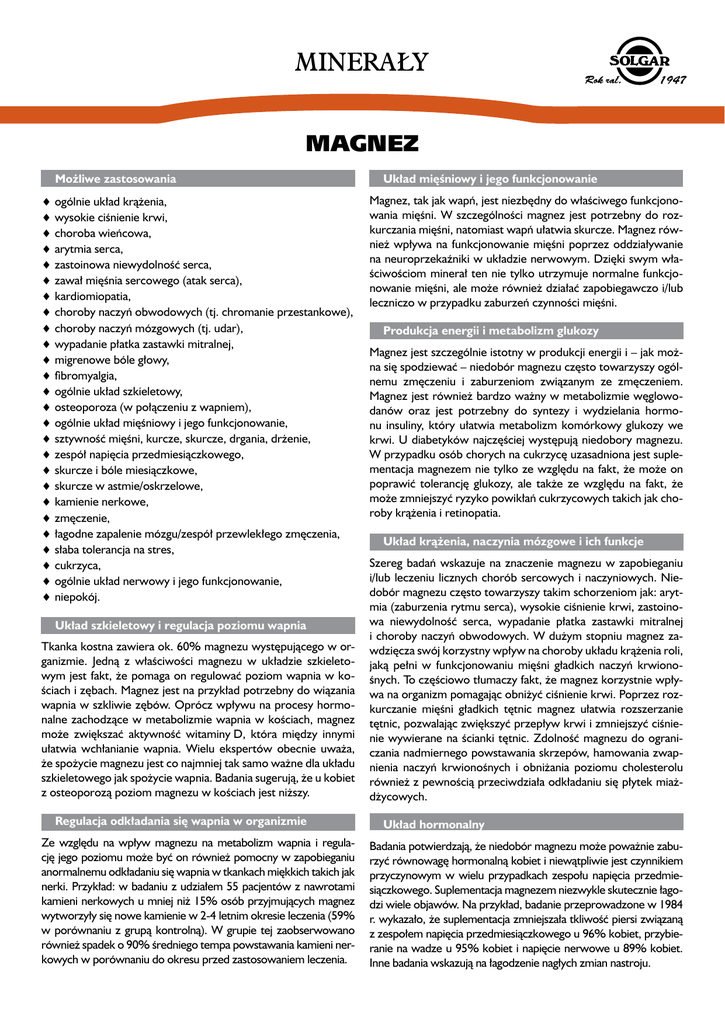 MINERAŁY Magnez Możliwe zastosowania ♦ ogólnie układ krążenia, ♦ wysokie ciśnienie krwi, ♦ choroba wieńcowa, ♦ arytmia serca, ♦ zastoinowa niewydolność serca, ♦ zawał mięśnia sercowego (atak serca), ♦ kardiomiopatia, ♦ choroby naczyń obwodowych (tj. chromanie przestankowe), ♦ choroby naczyń mózgowych (tj. udar), ♦ wypadanie płatka zastawki mitralnej, ♦ migrenowe bóle głowy, ♦ fibromyalgia, ♦ ogólnie układ szkieletowy, ♦ osteoporoza (w połączeniu z wapniem), ♦ ogólnie układ mięśniowy i jego funkcjonowanie, ♦ sztywność mięśni, kurcze, skurcze, drgania, drżenie, ♦ zespół napięcia przedmiesiączkowego, ♦ skurcze i bóle miesiączkowe, ♦ skurcze w astmie/oskrzelowe, ♦ kamienie nerkowe, ♦ zmęczenie, ♦ łagodne zapalenie mózgu/zespół przewlekłego zmęczenia, ♦ słaba tolerancja na stres, ♦ cukrzyca, ♦ ogólnie układ nerwowy i jego funkcjonowanie, ♦ niepokój. Układ szkieletowy i regulacja poziomu wapnia Tkanka kostna zawiera ok. 60% magnezu występującego w organizmie. Jedną z właściwości magnezu w układzie szkieletowym jest fakt, że pomaga on regulować poziom wapnia w kościach i zębach. Magnez jest na przykład potrzebny do wiązania wapnia w szkliwie zębów. Oprócz wpływu na procesy hormonalne zachodzące w metabolizmie wapnia w kościach, magnez może zwiększać aktywność witaminy D, która między innymi ułatwia wchłanianie wapnia. Wielu ekspertów obecnie uważa, że spożycie magnezu jest co najmniej tak samo ważne dla układu szkieletowego jak spożycie wapnia. Badania sugerują, że u kobiet z osteoporozą poziom magnezu w kościach jest niższy. Regulacja odkładania się wapnia w organizmie Ze względu na wpływ magnezu na metabolizm wapnia i regulację jego poziomu może być on również pomocny w zapobieganiu anormalnemu odkładaniu się wapnia w tkankach miękkich takich jak nerki. Przykład: w badaniu z udziałem 55 pacjentów z nawrotami kamieni nerkowych u mniej niż 15% osób przyjmujących magnez wytworzyły się nowe kamienie w 2-4 letnim okresie leczenia (59% w porównaniu z grupą kontrolną). W grupie tej zaobserwowano również spadek o 90% średniego tempa powstawania kamieni nerkowych w porównaniu do okresu przed zastosowaniem leczenia. Układ mięśniowy i jego funkcjonowanie Magnez, tak jak wapń, jest niezbędny do właściwego funkcjonowania mięśni. W szczególności magnez jest potrzebny do rozkurczania mięśni, natomiast wapń ułatwia skurcze. Magnez również wpływa na funkcjonowanie mięśni poprzez oddziaływanie na neuroprzekaźniki w układzie nerwowym. Dzięki swym właściwościom minerał ten nie tylko utrzymuje normalne funkcjonowanie mięśni, ale może również działać zapobiegawczo i/lub leczniczo w przypadku zaburzeń czynności mięśni. Produkcja energii i metabolizm glukozy Magnez jest szczególnie istotny w produkcji energii i – jak można się spodziewać – niedobór magnezu często towarzyszy ogólnemu zmęczeniu i zaburzeniom związanym ze zmęczeniem. Magnez jest również bardzo ważny w metabolizmie węglowodanów oraz jest potrzebny do syntezy i wydzielania hormonu insuliny, który ułatwia metabolizm komórkowy glukozy we krwi. U diabetyków najczęściej występują niedobory magnezu. W przypadku osób chorych na cukrzycę uzasadniona jest suplementacja magnezem nie tylko ze względu na fakt, że może on poprawić tolerancję glukozy, ale także ze względu na fakt, że może zmniejszyć ryzyko powikłań cukrzycowych takich jak choroby krążenia i retinopatia. Układ krążenia, naczynia mózgowe i ich funkcje Szereg badań wskazuje na znaczenie magnezu w zapobieganiu i/lub leczeniu licznych chorób sercowych i naczyniowych. Niedobór magnezu często towarzyszy takim schorzeniom jak: arytmia (zaburzenia rytmu serca), wysokie ciśnienie krwi, zastoinowa niewydolność serca, wypadanie płatka zastawki mitralnej i choroby naczyń obwodowych. W dużym stopniu magnez zawdzięcza swój korzystny wpływ na choroby układu krążenia roli, jaką pełni w funkcjonowaniu mięśni gładkich naczyń krwionośnych. To częściowo tłumaczy fakt, że magnez korzystnie wpływa na organizm pomagając obniżyć ciśnienie krwi. Poprzez rozkurczanie mięśni gładkich tętnic magnez ułatwia rozszerzanie tętnic, pozwalając zwiększyć przepływ krwi i zmniejszyć ciśnienie wywierane na ścianki tętnic. Zdolność magnezu do ograniczania nadmiernego powstawania skrzepów, hamowania zwapnienia naczyń krwionośnych i obniżania poziomu cholesterolu również z pewnością przeciwdziała odkładaniu się płytek miażdżycowych. Układ hormonalny Badania potwierdzają, że niedobór magnezu może poważnie zaburzyć równowagę hormonalną kobiet i niewątpliwie jest czynnikiem przyczynowym w wielu przypadkach zespołu napięcia przedmiesiączkowego. Suplementacja magnezem niezwykle skutecznie łagodzi wiele objawów. Na przykład, badanie przeprowadzone w 1984 r. wykazało, że suplementacja zmniejszała tkliwość piersi związaną z zespołem napięcia przedmiesiączkowego u 96% kobiet, przybieranie na wadze u 95% kobiet i napięcie nerwowe u 89% kobiet. Inne badania wskazują na łagodzenie nagłych zmian nastroju. MINERAŁY Ciąża W czasie ciąży i karmienia piersią zapotrzebowanie na magnez wzrasta o 50% (z 300 do 450 mg). Wynika to z potrzeb rosnącego płodu, łożyska oraz ze wzrostu masy ciała kobiety ciężarnej. W czasie karmienia piersią większe zapotrzebowanie na magnez spowodowane jest koniecznością uzupełniania strat minerału wydalanego z mlekiem. W badaniach nad rolą magnezu w organizmie kobiet ciężarnych odnotowano ogromne korzyści wynikającej ze spożywania magnezu w diecie może pomóc urodzić zdrowe dziecko. Układ nerwowy i jego funkcjonowanie Magnez współpracuje z wapniem, aby zapewnić właściwe przewodzenie impulsów nerwowych, częściowo poprzez wpływ na neuroprzekaźniki. Brak ma