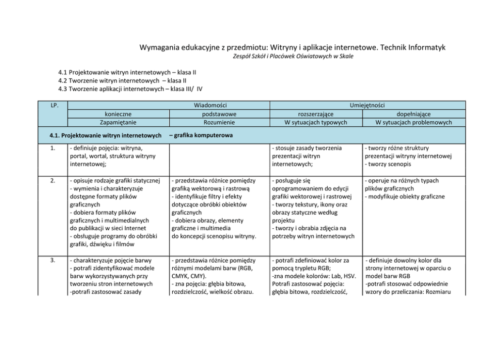 Wymagania edukacyjne z przedmiotu: Witryny i aplikacje internetowe. Technik Informatyk 4.1 Projektowanie witryn internetowych – klasa II 4.2 Tworzenie witryn internetowych – klasa II 4.3 Tworzenie aplikacji internetowych – klasa III/ IV LP. konieczne Zapamiętanie 4.1. Projektowanie witryn internetowych 1. - definiuje pojęcia: witryna, portal, wortal, struktura witryny internetowej; 2. - opisuje rodzaje grafiki statycznej - wymienia i charakteryzuje dostępne formaty plików graficznych - dobiera formaty plików graficznych i multimedialnych do publikacji w sieci Internet - obsługuje programy do obróbki grafiki, dźwięku i filmów 3. - charakteryzuje pojęcie barwy - potrafi zidentyfikować modele barw wykorzystywanych przy tworzeniu stron internetowych -potrafi zastosować zasady Zespół Szkół i Placówek Oświatowych w Skale Wiadomości podstawowe Rozumienie – grafika komputerowa rozszerzające W sytuacjach typowych Umiejętności dopełniające W sytuacjach problemowych - stosuje zasady tworzenia prezentacji witryn internetowych; - tworzy różne struktury prezentacji witryny internetowej - tworzy scenopis - przedstawia różnice pomiędzy grafiką wektorową i rastrową - identyfikuje filtry i efekty dotyczące obróbki obiektów graficznych - dobiera obrazy, elementy graficzne i multimedia do koncepcji scenopisu witryny. - posługuje się oprogramowaniem do edycji grafiki wektorowej i rastrowej - tworzy tekstury, ikony oraz obrazy statyczne według projektu - tworzy i obrabia zdjęcia na potrzeby witryn internetowych - operuje na różnych typach plików graficznych - modyfikuje obiekty graficzne - przedstawia różnice pomiędzy różnymi modelami barw (RGB, CMYK, CMY). - zna pojęcia: głębia bitowa, rozdzielczość, wielkość obrazu. - potrafi zdefiniować kolor za pomocą trypletu RGB; -zna modele kolorów: Lab, HSV. Potrafi zastosować pojęcia: głębia bitowa, rozdzielczość, - definiuje dowolny kolor dla strony internetowej w oparciu o model barw RGB -potrafi stosować odpowiednie wzory do przeliczania: Rozmiaru 4. 5. 6. 7. cyfrowego zapisu obrazu; -potrafi modyfikować zdjęcia: kadrowanie i korekcja, zmiana rozmiaru pliku, transformacja zdjęcia. - potrafi zdefiniować kolor za pomocą nazwy lub kodu szesnastkowego; - potrafi zastosować zasady doboru palety barw do projektowanych witryn; - potrafi stworzyć tekstury, ikony oraz obrazy statyczne według projektu; wielkość obrazu, interpolacja - potrafi dobrać obrazy, elementy graficzne i multimedia do koncepcji scenopisu witryny; - potrafi zaprojektować witrynę internetową z zastosowaniem różnych technik i formatów graficznych. obrazu cyfrowego. Interpolację. Rozdzielczość obrazu cyfrowego. Głębia bitowa. Wielkość obrazu cyfrowego - potrafi zaprojektować własny layout strony Internetowej - określa zasady tworzenia obrazu animowanego - przedstawia parametry jakie powinna spełniać animacja - tworzy animację - projektuje elementy graficzne, ikony nawigacyjne i inne elementy graficzne - tworzy i obrabia filmy na potrzeby witryn internetowych. - dobiera odpowiednie oprogramowanie do tworzenia animacji, elementów graficznych, ikon - określa zasady kompresji obrazów cyfrowych - przedstawia dostępne filtry obrazów - definiuje pojęcie dźwięku - określa formaty plików dźwiękowych - porównuje cechy obrazów analogowych i cyfrowych - edytuje obrazy analogowe i cyfrowe - dokonuje kompresji obrazów - nakłada filtry na obrazy - dobiera parametry kompresji - charakteryzuje dostępne programy umożliwiające edycję dźwięku - zapisuje i edytuje dźwięk za pomocą odpowiedniego oprogramowania - przeprowadza stratną i bezstratną kompresję dźwięku - przedstawia zagrożenia związane z bezpieczeństwem witryny - charakteryzuje programy ułatwiające tworzenie internetowej galerii zdjęć - tworzy internetową galerię zdjęć - przygotowuje elementy - zmienia atrybuty obiektów graficznych - zapewnia odpowiedni poziom graficzne do publikacji w sieci bezpieczeństwa witryny 4.2. Tworzenie witryn internetowych 1. HTML – hipertekstowy język znaczników 8. 9. 10. 11. 12. - przedstawia z jakich elementów zbudowany jest język HTML - określa jaką rolę pełnią komentarze - definiuje pojęcia HTML, XML, XHTML, znacznik otwarty i zamknięty - przedstawia elementy niezbędne do budowy dokumentu HTML - określa cechy dobrego edytora - opisuje z jakich części składa się podstawowa struktura dokumentu - przedstawia sposoby wyświetlania treści na stronie - przedstawia pojęcia: znaki diakrytyczne - opisuje sposoby kodowania strony - charakteryzuje elementy meta - wyjaśnia czym są roboty - wyjaśnia zasadność stosowania komentarzy - określa przeznaczenie znaków specjalnych - buduje dokument hipertekstowy w oparciu o znaczniki - stosuje znaki specjalne - porównuje wady i zalety dostępnych edytorów - buduje stronę www z wykorzystaniem edytora (Notatnik, Notepad ++) - charakteryzuje treści przechowywane w nagłówku dokumentu - wyjaśnia jakie znaczenie ma prawidłowe wyświetlanie znaków na stronie - określa jakie elementy meta są pomocne w pozycjonowaniu witryny w Internecie - tworzy podstawową strukturę dokumentu hipertekstowego - wprowadza tytuł dla strony - wyświetla treści na stronie - ustawia kodowanie strony - wprowadza odpowiednie metainformacje w nagłówku - stosuje komentarze w dokumencie hipertekstowym - buduje zaawansowaną stronę internetową z pomocą prostego edytora tekstu (Notatnik, Notepad ++) - uzupełnia elementy zawarte w nagłówku - poprawnie wyświetla polskie znaki diakrytyczne na stronie - wprowadza konkretne metainformacje pomocne w pozycjonowaniu witryny w Internecie 13. 14. 15. 16. 17. 18. - wyjaśnia pojęcia: akapit, blok, tytuł oraz określa ich cechy - przedstawia znaczniki odpowiedzialne za formatowanie tekstu - wyjaśnia zasadę tworzenia indeksów górnych i dolnych na stronie - określa w jaki sposób tworzone są listy w jęz