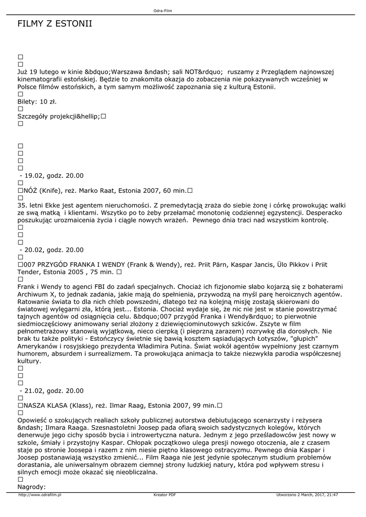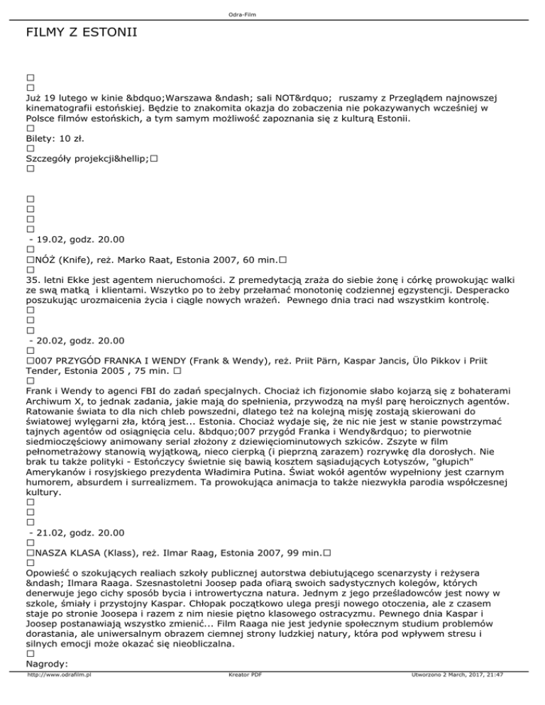 Odra-Film FILMY Z ESTONII Już 19 lutego w kinie „Warszawa – sali NOT” ruszamy z Przeglądem najnowszej kinematografii estońskiej. Będzie to znakomita okazja do zobaczenia nie pokazywanych wcześniej w Polsce filmów estońskich, a tym samym możliwość zapoznania się z kulturą Estonii. Bilety: 10 zł. Szczegóły projekcji… - 19.02, godz. 20.00 NÓŻ (Knife), reż. Marko Raat, Estonia 2007, 60 min. 35. letni Ekke jest agentem nieruchomości. Z premedytacją zraża do siebie żonę i córkę prowokując walki ze swą matką i klientami. Wszytko po to żeby przełamać monotonię codziennej egzystencji. Desperacko poszukując urozmaicenia życia i ciągle nowych wrażeń. Pewnego dnia traci nad wszystkim kontrolę. - 20.02, godz. 20.00 007 PRZYGÓD FRANKA I WENDY (Frank & Wendy), reż. Priit Pärn, Kaspar Jancis, Ülo Pikkov i Priit Tender, Estonia 2005 , 75 min. Frank i Wendy to agenci FBI do zadań specjalnych. Chociaż ich fizjonomie słabo kojarzą się z bohaterami Archiwum X, to jednak zadania, jakie mają do spełnienia, przywodzą na myśl parę heroicznych agentów. Ratowanie świata to dla nich chleb powszedni, dlatego też na kolejną misję zostają skierowani do światowej wylęgarni zła, którą jest... Estonia. Chociaż wydaje się, że nic nie jest w stanie powstrzymać tajnych agentów od osiągnięcia celu. „007 przygód Franka i Wendy” to pierwotnie siedmioczęściowy animowany serial złożony z dziewięciominutowych szkiców. Zszyte w film pełnometrażowy stanowią wyjątkową, nieco cierpką (i pieprzną zarazem) rozrywkę dla dorosłych. Nie brak tu także polityki - Estończycy świetnie się bawią kosztem sąsiadujących Łotyszów, "głupich" Amerykanów i rosyjskiego prezydenta Władimira Putina. Świat wokół agentów wypełniony jest czarnym humorem, absurdem i surrealizmem. Ta prowokująca animacja to także niezwykła parodia współczesnej kultury. - 21.02, godz. 20.00 NASZA KLASA (Klass), reż. Ilmar Raag, Estonia 2007, 99 min. Opowieść o szokujących realiach szkoły publicznej autorstwa debiutującego scenarzysty i reżysera – Ilmara Raaga. Szesnastoletni Joosep pada ofiarą swoich sadystycznych kolegów, których denerwuje jego cichy sposób bycia i introwertyczna natura. Jednym z jego prześladowców jest nowy w szkole, śmiały i przystojny Kaspar. Chłopak początkowo ulega presji nowego otoczenia, ale z czasem staje po stronie Joosepa i razem z nim niesie piętno klasowego ostracyzmu. Pewnego dnia Kaspar i Joosep postanawiają wszystko zmienić... Film Raaga nie jest jedynie społecznym studium problemów dorastania, ale uniwersalnym obrazem ciemnej strony ludzkiej natury, która pod wpływem stresu i silnych emocji może okazać się nieobliczalna. Nagrody: http://www.odrafilm.pl Kreator PDF Utworzono 2 March, 2017, 21:47 Odra-Film - Warszawski Międzynarodowy Festiwal Filmowy 2007 – nagroda FIPRESCI i Nagroda Specjalna Jury; - Międzynarodowy Festiwal Filmowy w Karlowych Warach 2007 – Wyróżnienie Specjalne w konkursie East of West. - 22.02, godz.17.00 KINNUNEN, reż. Andri Luup, Estonia 2007, 85 min. Fin Juha Kinnunen przyjeżdża do Estonii w poszukiwaniu żony. Jego rodaczki są dla niego zbyt mało kobiece i ma nadzieję, że w Tallinie szybko znajdzie niepalącą blondynkę, czekającą na wymarzonego kawalera. Aby móc porozumieć się z przyszłą żoną, zapisuje się na intensywny kurs estońskiego. Nauczycielką jest młoda kobieta, Õie. Niestety, zupełnie nie w typie Kinnunena. Juha zamieszcza ogłoszenie w gazecie i zaczyna czekać na kandydatki. Czy niezbyt przystojny, skrajnie introwertyczny, nie mający w Estonii żadnego źródła utrzymania i nie mówiący po estońsku główny bohater ma jakieś szanse na szczęśliwe zakończenie swojej wyprawy? A może szczęście jest bliżej niż mu się wydaje? - 23.02, godz.20.00 SKLEP Z MARZENIAMI (Shop of dreams) – reż. Peeter Urbla, Estonia 2005, 110 min. 25. letnia Alice wraca z wakacji w Portugalii i dowiaduję się, że właśnie została pozbawiona pracy. Studio telewizyjne, w którym zajmowała się projektowaniem kostiumów, bankrutuje. Kobieta wraz z dwiema przyjaciółkami: krawcową i makijażystką, postanawiają założyć własny interes. Film jest zabawną i wzruszającą, afirmującą życie, opowieścią o kobietach, przyjaźni i miłości. - 24.02, godz.20.00 TAARKA, reż. Ain Mäeots, Estonia 2008, 94 min. Pierwszy na świecie film nakręcony w języku Seto, opowiadający o życiu folkowej piosenkarki Hilany Taarki. Film pokazuje jej drogę do popularności od odrzuconej przez społeczność kobiety, po legendę muzyki folk. Zanim nadeszła sława i popularność, artystka wywodząca się z grupy etnicznej Seto, borykała się z biedą i odrzuceniem. W utworach swych śpiewała o prawdziwym życiu i emocjach. Hilana Taarka - pogardzana kobieta, uwielbiana piosenkarka. - 25.02, godz. 20.00 186 KILOMETRÓW /186 Kilometers/, reż. Andres Maimik, Rain Tolk, Estonia 2007, 106 min. Życie znanego komika Jana Uuspõlda nagle zamienia się w koszmar - jego dziewczyna wyrzuca go z apartamentu, on sam staje się bezrobotny i musi pożyczać pieniądze. Kiedy jego znajomy oferuje mu rolę w spektaklu teatralnym Jan zgadza się od razu. Jednak ma jeden problem - teatr w którym przygotowywane jest przedstawienie pt. "Kłamstwa w Tartu" znajduje się po drugiej stronie kraju. Jan nie mając żadnych pieniędzy, rusza w drogę autostopem. Czy zdąży na czas i czy przetrwa wszystkie niespodzianki, które czekają go w podróży? Czarna komedia inspirowana życiem aktora Jana Uuspolda. Hit kinowy w Estonii. http://www.odrafilm.pl Kreator PDF Utworzono 2 March, 2017, 21:47