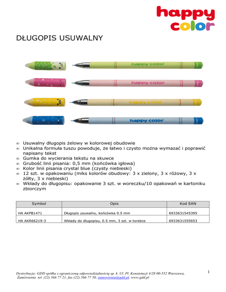 DŁUGOPIS USUWALNY • • • • • • • Usuwalny długopis żelowy w kolorowej obudowie Unikalna formuła tuszu powoduje, że łatwo i czysto można wymazać i poprawić napisany tekst Gumka do wycierania tekstu na skuwce Grubość linii pisania: 0,5 mm (końcówka igłowa) Kolor linii pisania crystal blue (czysty niebieski) 12 szt. w opakowaniu (miks kolorów obudowy: 3 x zielony, 3 x różowy, 3 x żółty, 3 x niebieski) Wkłady do długopisu: opakowanie 3 szt. w woreczku/10 opakowań w kartoniku zbiorczym Symbol Opis Kod EAN HA AKPB1471 Długopis usuwalny, końcówka 0.5 mm 6933631545395 HA AKR66219-3 Wkłady do długopisu, 0.5 mm, 3 szt. w torebce 6933631555653 Dystrybucja: GDD spółka z ograniczoną odpowiedzialnością sp. k. Ul. Pl. Konstytucji 4/28 00-552 Warszawa, Zamówienia tel. (22) 566 77 21, fax (22) 566 77 50, [email protected], www.gdd.pl 1
