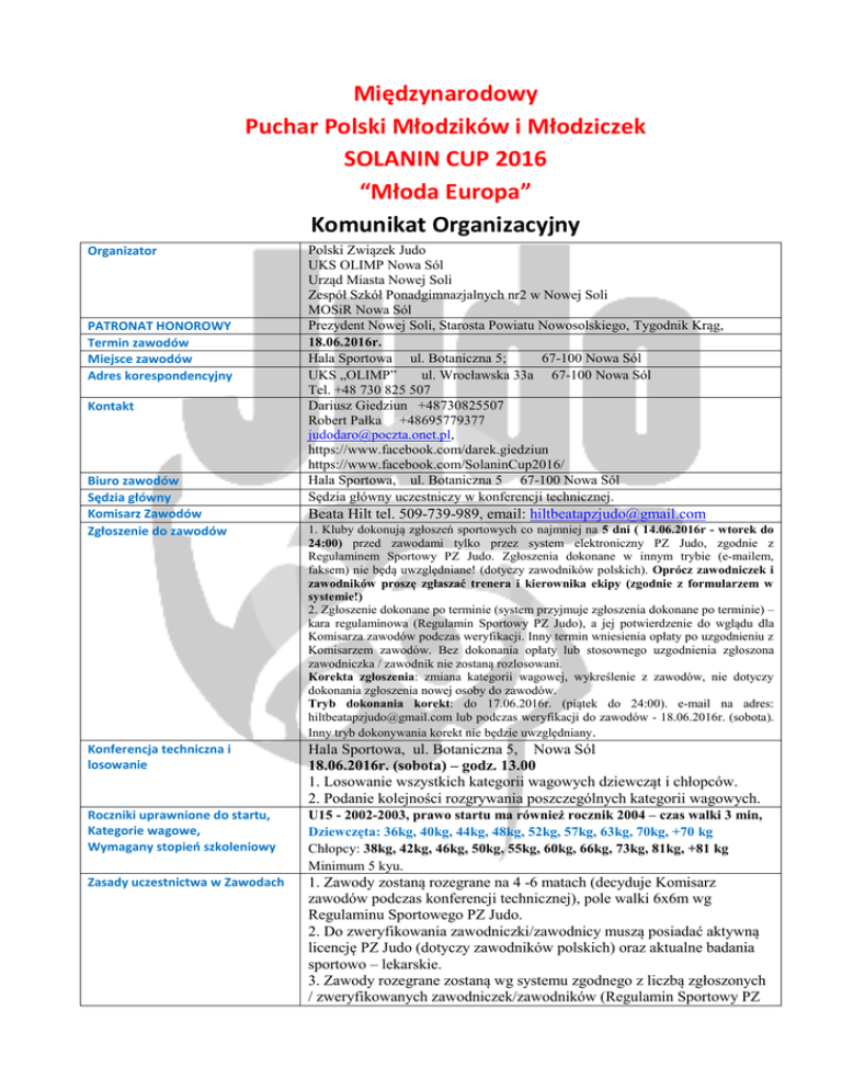Międzynarodowy Puchar Polski Młodzików i Młodziczek SOLANIN CUP 2016 “Młoda Europa” Komunikat Organizacyjny Organizator PATRONAT HONOROWY Termin zawodów Miejsce zawodów Adres korespondencyjny Kontakt Biuro zawodów Sędzia główny Komisarz Zawodów Zgłoszenie do zawodów Polski Związek Judo UKS OLIMP Nowa Sól Urząd Miasta Nowej Soli Zespół Szkół Ponadgimnazjalnych nr2 w Nowej Soli MOSiR Nowa Sól Prezydent Nowej Soli, Starosta Powiatu Nowosolskiego, Tygodnik Krąg, 18.06.2016r. Hala Sportowa ul. Botaniczna 5; 67-100 Nowa Sól UKS „OLIMP” ul. Wrocławska 33a 67-100 Nowa Sól Tel. +48 730 825 507 Dariusz Giedziun +48730825507 Robert Pałka +48695779377 [email protected], https://www.facebook.com/darek.giedziun https://www.facebook.com/SolaninCup2016/ Hala Sportowa, ul. Botaniczna 5 67-100 Nowa Sól Sędzia główny uczestniczy w konferencji technicznej. Beata Hilt tel. 509-739-989, email: [email protected] 1. Kluby dokonują zgłoszeń sportowych co najmniej na 5 dni ( 14.06.2016r - wtorek do 24:00) przed zawodami tylko przez system elektroniczny PZ Judo, zgodnie z Regulaminem Sportowy PZ Judo. Zgłoszenia dokonane w innym trybie (e-mailem, faksem) nie będą uwzględniane! (dotyczy zawodników polskich). Oprócz zawodniczek i zawodników proszę zgłaszać trenera i kierownika ekipy (zgodnie z formularzem w systemie!) 2. Zgłoszenie dokonane po terminie (system przyjmuje zgłoszenia dokonane po terminie) – kara regulaminowa (Regulamin Sportowy PZ Judo), a jej potwierdzenie do wglądu dla Komisarza zawodów podczas weryfikacji. Inny termin wniesienia opłaty po uzgodnieniu z Komisarzem zawodów. Bez dokonania opłaty lub stosownego uzgodnienia zgłoszona zawodniczka / zawodnik nie zostaną rozlosowani. Korekta zgłoszenia: zmiana kategorii wagowej, wykreślenie z zawodów, nie dotyczy dokonania zgłoszenia nowej osoby do zawodów. Tryb dokonania korekt: do 17.06.2016r. (piątek do 24:00). e-mail na adres: [email protected] lub podczas weryfikacji do zawodów - 18.06.2016r. (sobota). Inny tryb dokonywania korekt nie będzie uwzględniany. Konferencja techniczna i losowanie Hala Sportowa, ul. Botaniczna 5, Nowa Sól 18.06.2016r. (sobota) – godz. 13.00 1. Losowanie wszystkich kategorii wagowych dziewcząt i chłopców. 2. Podanie kolejności rozgrywania poszczególnych kategorii wagowych. Roczniki uprawnione do startu, Kategorie wagowe, Wymagany stopień szkoleniowy U15 - 2002-2003, prawo startu ma również rocznik 2004 – czas walki 3 min, Dziewczęta: 36kg, 40kg, 44kg, 48kg, 52kg, 57kg, 63kg, 70kg, +70 kg Chłopcy: 38kg, 42kg, 46kg, 50kg, 55kg, 60kg, 66kg, 73kg, 81kg, +81 kg Minimum 5 kyu. Zasady uczestnictwa w Zawodach 1. Zawody zostaną rozegrane na 4 -6 matach (decyduje Komisarz zawodów podczas konferencji technicznej), pole walki 6x6m wg Regulaminu Sportowego PZ Judo. 2. Do zweryfikowania zawodniczki/zawodnicy muszą posiadać aktywną licencję PZ Judo (dotyczy zawodników polskich) oraz aktualne badania sportowo – lekarskie. 3. Zawody rozegrane zostaną wg systemu zgodnego z liczbą zgłoszonych / zweryfikowanych zawodniczek/zawodników (Regulamin Sportowy PZ Judogi Ważenie: Judo). 4. Kluby dokonujące zgłoszeń zawodników do zawodów muszą posiadać aktywną licencję klubową PZ Judo (dotyczy zawodników polskich). 1. Zawodniczka/zawodnik wyczytany jako pierwszy ubiera białą judogi. Drugi zakłada niebieskie judogi lub białą judogi z czerwoną przepaską. 2. Kontrola judogi odbywa się zgodnie z przepisami walki. 3. Podczas ceremonii otwarcia i dekoracji obowiązuje judogi koloru białego. Hala Sportowa, ul. Botaniczna 5, Nowa Sól 17.06.2016r. (piątek): 17.00 – 18.30 – waga nieoficjalna 18.06.2016r. (sobota): godz. 10.00 - 10.30 – waga nieoficjalna godz. 10.30 - 12.00 – waga oficjalna Podczas ważenia należy posiadać: - dokument tożsamości oraz ważne badania lekarskie - identyfikator wraz z kodem kreskowym wydawany w biurze zawodów po opłaceniu startowego. Uwaga: Nie zezwala się na ważenie zawodniczek i zawodników bez odzieży. Podczas ważenia zawodniczka musi mieć na sobie bieliznę osobistą i T-shirt, zawodnik bieliznę osobistą (spodenki). Limity wagowe są powiększone o dodatkowe 100g. Program Turnieju 17.06.2016r. (piątek): 17.00 – 18.30 – waga nieoficjalna 20.00 – 21.00 – weryfikacja do zawodów (wraz z ostatecznym zgłoszeniem zawodników zagranicznych). 18.06.2016r. (sobota): 10.30 - 12.00 – waga oficjalna dziewcząt i chłopców (brak możliwości zmiany kategorii wagowej po ważeniu) 12.00 – 12.30 – weryfikacja ostateczna (zgodnie ze zgłoszeniami dokonanymi poprzez system i zmianami dokonanymi do czasu zakończenia weryfikacji w dniu 17.06.2016r. - brak możliwości zmiany kategorii wagowych, zgłoszeń zawodników do zawodów 13.00 - konferencja techniczna i losowanie (zgodnie z weryfikacją dokonaną w dniu 17.06.2016r. do godziny 21.00) 14.00 – otwarcie zawodów i rozpoczęcie walk do zakończenia zawodów; - dekoracja po zakończeniu kilku kategorii wagowych – zgodnie z informacjami podanymi podczas Konferencji technicznej. Trening camp Opłata startowa: Opłata za uczestnictwo w campie Zakwaterowanie i wyżywienie Kluby zainteresowane rezerwują noclegi i wyżywienie we własnym zakresie 19.06.2016 (trening camp) – trening camp prowadzi Pan Paweł Zagrodnik - godz. 09.00 – 11.00 – trening camp - godz.11.00 – 14.00 – Solanin Cup 2016 dla roczników U9 i Olimpiad Specjalnych - godz. 14.00 – 16.00 – trening camp 35 zł, 8 euro (ekipy zagraniczne) Zawodnicy uczestniczący w campie 30 zł, 8 euro Zgłoszenia uczestnictwa w campie wraz ze zgłoszeniem do turnieju http://meteor-turystyka.pl/noclegi,nowa-sol,0.html http://www.eholiday.pl/tanio-nowa_sol-28349.html http://www.zlotylan.pl/ https://e-turysta.net/zajazd-kacper-nowe-miasteczko-130161.… http://meteor24.pl/noclegi/nowa-sol,0.html http://www.zumi.pl/2602008,Bar_Portowy,Nowa_Sol,firma.html http://www.trivago.pl/…& ht
