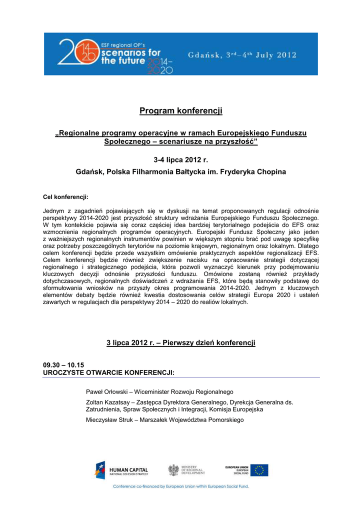 Program konferencji „Regionalne programy operacyjne w ramach Europejskiego Funduszu Społecznego – scenariusze na przyszłość” 3-4 lipca 2012 r. Gdańsk, Polska Filharmonia Bałtycka im. Fryderyka Chopina Cel konferencji: Jednym z zagadnień pojawiających się w dyskusji na temat proponowanych regulacji odnośnie perspektywy 2014-2020 jest przyszłość struktury wdrażania Europejskiego Funduszu Społecznego. W tym kontekście pojawia się coraz częściej idea bardziej terytorialnego podejścia do EFS oraz wzmocnienia regionalnych programów operacyjnych. Europejski Fundusz Społeczny jako jeden z ważniejszych regionalnych instrumentów powinien w większym stopniu brać pod uwagę specyfikę oraz potrzeby poszczególnych terytoriów na poziomie krajowym, regionalnym oraz lokalnym. Dlatego celem konferencji będzie przede wszystkim omówienie praktycznych aspektów regionalizacji EFS. Celem konferencji będzie również zwiększenie nacisku na opracowanie strategii dotyczącej regionalnego i strategicznego podejścia, która pozwoli wyznaczyć kierunek przy podejmowaniu kluczowych decyzji odnośnie przyszłości funduszu. Omówione zostaną również przykłady dotychczasowych, regionalnych doświadczeń z wdrażania EFS, które będą stanowiły podstawę do sformułowania wniosków na przyszły okres programowania 2014-2020. Jednym z kluczowych elementów debaty będzie również kwestia dostosowania celów strategii Europa 2020 i ustaleń zawartych w regulacjach dla perspektywy 2014 – 2020 do realiów lokalnych. 3 lipca 2012 r. – Pierwszy dzień konferencji 09.30 – 10.15 UROCZYSTE OTWARCIE KONFERENCJI: Paweł Orłowski – Wiceminister Rozwoju Regionalnego Zoltan Kazatsay – Zastępca Dyrektora Generalnego, Dyrekcja Generalna ds. Zatrudnienia, Spraw Społecznych i Integracji, Komisja Europejska Mieczysław Struk – Marszałek Województwa Pomorskiego 10.15 – 12.15 EUROPEJSKI FUNDUSZ SPOŁECZNY DLA REGIONÓW – CASE STUDIES Celem tego panelu będzie prezentacja różnorodnych doświadczeń państw członkowskich oraz regionów w ramach procesu regionalizacji. Zaprezentowane zostaną między innymi przykłady państw, które zmieniły swoje podejście z regionalnego na centralny lub odwrotnie. Celem tego panelu będzie próba wyjaśnienia konkretnych okoliczności, które wpływają na podjęcie decyzji odnośnie wyboru regionalnego lub centralnego sposobu wdrażania Europejskiego Funduszu Społecznego. Jakie czynniki o tym decydują? Czy nowy kształt programów operacyjnych zapewnia im wyższą efektywność? Moderator: Paweł Chorąży – Ministerstwo Rozwoju Regionalnego Paneliści: Aurelio Cecilio – Dyrekcja Generalna ds. Zatrudnienia, Spraw Społecznych i Integreacji, Komisja Europejska Alessandra Tomai – Ministerstwo Pracy i Polityki Społecznej, Włochy Jane Mcmillan -Rząd Walijski, Wielka Brytania (tbc) Francisco Javier Rodriguez Seijo – Departament Planowania i Zasobów, Ministerstwo Finansów, Region Galicji, Hiszpania Georg Moser – Ministerstwo Pracy, Spraw Społecznych, Rodziny i Kobiet, Bawaria, Niemcy 12.15 – 13.45 – Lunch 13.45 – 15.45 REGIONALNE PROGRAMY OPERACYJNE W KONTEKŚCIE STRATEGII EUROPA 2020 – WYZWANIA ZWIĄZANE Z PROGRAMOWANIEM I ZARZĄDZANIEM Panel poświęcony będzie zagadnieniom strategicznym takim jak regionalizacja celów strategii Europa 2020 czy poziom wdrażania priorytetów inwestycyjnych. Szczególny nacisk w dyskusji zostanie położony na to, do jakiego stopnia regionalizacja może być wdrażana oraz jakie warunki powinny zaistnieć w celu jej przeprowadzenia. Poruszone zostaną również zagadnienia dotyczące elastyczności celów krajowych w polityce regionalnej. Dotychczasowa praktyka wskazuje również, że istnieje potrzeba głębszego omówienia kwestii dotyczących koordynacji działań podejmowanych na poziomie krajowym i lokalnym. W ramach panelu zostaną poruszone także zagadnienia, mające swoje źródło w regulacjach dotyczących polityki spójności na lata 2014 – 2020, takie jak: umowa partnerska oraz jej wpływ na regionalizację Europejskiego Funduszu Społecznego, zasady warunkowości ex-ante oraz kwestia programów jedno lub wielo funduszowych. Moderator: Manuela Geleng – Dyrekcja Generalna ds. Zatrudnienia, Spraw Społecznych I Integracji, Komisja Europejska Paneliści: Marjorie Jouen – Komitet Regionów Marcin Nowicki - Instytut Badań nad Gospodarką Rynkową Arnold Hemmann – Ministerstwo Pracy i Spraw Społecznych, Niemcy Luciano Galetti – Agencja Zatrudnienia, Autonomiczny Region Trento, Włochy 15.45 – 16.15 – przerwa kawowa 16.15 – 18.15 PRAKTYCZNE ASPEKTY FINANSOWEJ 2014-2020 PROGRAMOWANIA W RAMACH PERSPEKTYWY Co jest istotą regionalnych programów operacyjnych? Jak usprawnić cele regionalne? Co przede wszystkim brać pod uwagę podczas procesu programowania? Jak odkryć oraz wspierać potencjał społeczny oraz potrzeby społeczne w regionie? Jak wprowadzać lokalne rozwiązania w programach regionalnych? Jak sprostać różnym wymaganiom, na przykład wszystkim typom koncentracji wyszczególnionym w regulacjach? Jakie są możliwości regionalnych programów operacyjnych? Te i inne pytania zostaną zadane podczas panelu dotyczącego programowania regionalnego. Celem debaty będzie również omówienie praktycznych aspektów zastosowania koncentracji tematycznej, która będzie miała znaczący wpływ na kształt programów operacyjnych. Kwestia ta zostanie również poruszona w kontekście warunkowości exante oraz praktycznych aspektów programów wielofunduszowych. Celem dyskusji będzie próba wskazania warunków ex-ante dla regionalnych programów operacyjnych i identyfikacja przykładów realizacji wybranych warunków. Moderator: Louis Vervloet – ESF Agency Flanders Paneliści: Krystyna Gurbiel - PSDB Sp z o.o. Carlos Tortuero – Ministerstwo Pracy i Bezpieczeństwa Społecznego, Hiszpania Karina Bedrunka – Urząd Marszałkowski Województwa Opolsk