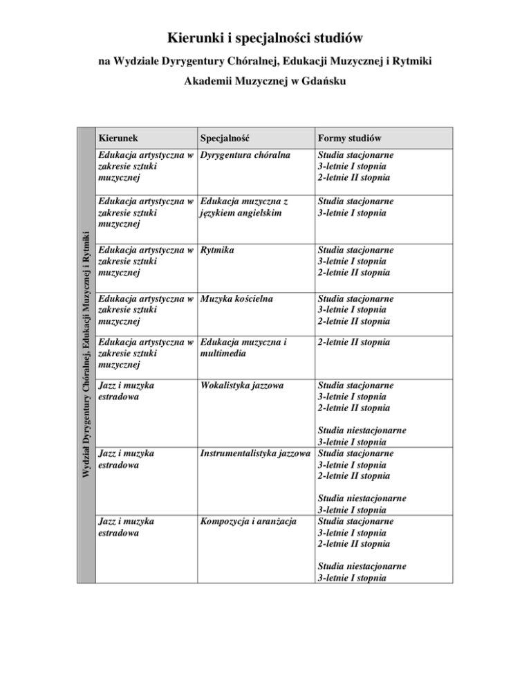Kierunki i specjalności studiów na Wydziale Dyrygentury Chóralnej, Edukacji Muzycznej i Rytmiki Akademii Muzycznej w Gdańsku Wydział Dyrygentury Chóralnej, Edukacji Muzycznej i Rytmiki Kierunek Specjalność Formy studiów Edukacja artystyczna w Dyrygentura chóralna zakresie sztuki muzycznej Studia stacjonarne 3-letnie I stopnia 2-letnie II stopnia Edukacja artystyczna w Edukacja muzyczna z zakresie sztuki językiem angielskim muzycznej Studia stacjonarne 3-letnie I stopnia Edukacja artystyczna w Rytmika zakresie sztuki muzycznej Studia stacjonarne 3-letnie I stopnia 2-letnie II stopnia Edukacja artystyczna w Muzyka kościelna zakresie sztuki muzycznej Studia stacjonarne 3-letnie I stopnia 2-letnie II stopnia Edukacja artystyczna w Edukacja muzyczna i zakresie sztuki multimedia muzycznej 2-letnie II stopnia Jazz i muzyka estradowa Studia stacjonarne 3-letnie I stopnia 2-letnie II stopnia Jazz i muzyka estradowa Jazz i muzyka estradowa Wokalistyka jazzowa Studia niestacjonarne 3-letnie I stopnia Instrumentalistyka jazzowa Studia stacjonarne 3-letnie I stopnia 2-letnie II stopnia Kompozycja i aranżacja Studia niestacjonarne 3-letnie I stopnia Studia stacjonarne 3-letnie I stopnia 2-letnie II stopnia Studia niestacjonarne 3-letnie I stopnia Studia na WYDZIALE DYRYGENTURY CHÓRALNEJ, EDUKACJI MUZYCZNEJ i RYTMIKI kształcą w specjalnościach: 1. Dyrygentura chóralna zorientowana jest na przygotowanie wysoko kwalifikowanej kadry przyszłych dyrygentów. Absolwenci tej specjalności znajdują zatrudnienie w zawodowych instytucjach muzycznych, w akademiach muzycznych, na uniwersytetach i w wyższych szkołach pedagogicznych, w szkołach muzycznych stopnia podstawowego i średniego, w szkolnictwie ogólnokształcącym i zawodowym, jak i w amatorskim ruchu muzycznym. 2. Edukacja muzyczna – absolwent tej specjalności powinien posiadać umiejętności w zakresie edukacji i animacji muzycznej, jak również wiedzę teoretyczną i praktyczną do prowadzenia zajęć dydaktycznych i ogólnomuzycznych w szkolnictwie muzycznym, zajęć w zakresie szkolnej edukacji artystycznej w szkołach ogólnokształcących oraz działalności muzycznej w instytucjach kultury. Ponadto absolwent specjalności Edukacja Muzyczna z Językiem Angielskim (studia pierwszego stopnia) może osiągnąć znajomość języka angielskiego na poziomie biegłości C1 Europejskiego Systemu Opisu Kształcenia Językowego Rady Europy, w zakresie dającym przygotowanie do nauczania tego języka w przedszkolu i w klasach I – III szkoły podstawowej. Absolwent specjalności Edukacja Muzyczna i Multimedia (studia drugiego stopnia) powinien posiadać umiejętności prowadzenia zajęć w zakresie szkolnej edukacji artystycznej z wykorzystaniem różnorodnych technik informatycznych i multimediów. 3. Rytmika przygotowuje studentów do prowadzenia przedmiotów kierunkowych związanych z tą specjalnością, równocześnie zapewniając zdobycie przygotowania do prowadzenia przedmiotów ogólnomuzycznych. Obszary działania, na których poszukiwani są absolwenci, to instytucje, które prowadzą kierunek rytmika: akademie muzyczne, średnie szkoły muzyczne, policealne studia zawodowe, a także uczelnie kształcące nauczycieli: uniwersytety, wyższe szkoły pedagogiczne, akademie wychowania fizycznego, kolegia nauczycielskie. Absolwenci rytmiki podejmują również pracę w wyższych szkołach teatralnych i filmowych oraz studium wokalno – aktorskich. Specjaliści tego kierunku zatrudniani są przez szkoły muzyczne I stopnia i szkoły baletowe, szkoły podstawowe, ośrodki szkolno – wychowawcze i terapeutyczne oraz instytucje prowadzące zajęcia muzyczno – ruchowe: domy i pałace kultury, placówki oświatowo – wychowawcze, społeczne ogniska muzyczne, teatralne i baletowe. 4. Muzyka Kościelna przygotowuje studentów do pracy w charakterze organistów, kantorów i chórmistrzów (Katedra Muzyki Kościelnej) 5. Jazz i Muzyka Estradowa kształci muzyków wykonawców z dziedziny jazzu, muzyki estradowej i rozrywkowej. Szczegółowe kwalifikacje oraz sylwetka absolwenta studiów I oraz II stopnia zawarte są w Rozporządzeniu Ministra Edukacji Narodowej i Sportu z dnia 18 kwietnia 2002 r. w sprawie określenia standardów nauczania dla poszczególnych kierunków studiów i poziomów kształcenia (Dz. U. Nr 116, poz. 1004) Wymagania egzaminacyjne Wydział Dyrygentury Chóralnej, Edukacji Muzycznej i Rytmiki Studia pierwszego stopnia (stacjonarne) Kierunek: Edukacja artystyczna w zakresie sztuki muzycznej Specjalność: Dyrygentura chóralna I etap: • Kształcenie słuchu: pisemny – dyktando 2gł. (dwugłosowe), ustny – badanie predyspozycji słuchowych • Wykonanie na instrumencie głównym przygotowanego programu – 3 utwory o różnej stylistyce Uczelnia zapewnia akompaniatora, wymagane jest wcześniejsze dostarczenie materiałów nutowych z wyprzedzeniem dwutygodniowym II etap: • Dyrygowanie dwóch utworów na zespół chóralny w różnych tempach i różnym metrum Uczelnia zapewnia akompaniatora, wymagane jest wcześniejsze dostarczenie materiałów nutowych z wyprzedzeniem dwutygodniowym Studia pierwszego stopnia (stacjonarne) Specjalność: Edukacja muzyczna z językiem angielskim Specjalność: Muzyka kościelna • Wykonanie na fortepianie 2 utworów – utwór techniczny oraz barokowy lub klasyczny (nie dotyczy pianistów, nie jest wymagane wykonanie z pamięci) • Sprawdzian dyspozycji głosowych I etap: • Kształcenie słuchu: pisemny – dyktando 2gł. (dwugłosowe), ustny – badanie predyspozycji słuchowych • Wykonanie na instrumencie głównym przygotowanego programu – 3 utwory o różnej stylistyce Uczelnia zapewnia akompaniatora, wymagane jest wcześniejsze dostarczenie materiałów nutowych z wyprzedzeniem dwutygodniowym Studia pierwszego stopnia (stacjonarne) Wydział Dyrygentury Chóralnej, Edukacji Muzycznej i Rytmiki Studia pierwszego stopnia (stacjonarne) Specjalność: Rytmika Kier