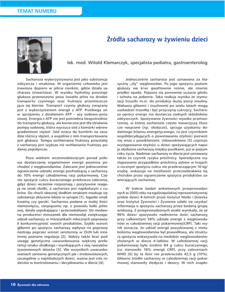 Źródła sacharozy w żywieniu dzieci lek. med. Witold Klemarczyk, specjalista pediatra, gastroenterolog Sacharoza wykorzystywana jest jako substancja odżywcza i smakowa. W organizmie człowieka jest trawiona dopiero w jelicie cienkim, gdzie działa sacharaza (inwertaza). W wyniku hydrolizy powstaje glukoza przenoszona poza światło jelita na drodze transportu czynnego oraz fruktoza przemieszczająca się biernie. Transport czynny glukozy związany jest z wykorzystaniem energii z ATP. Przebiega on w sprzężeniu z działaniem ATP – azy sodowo-potasowej. Energia z ATP nie jest potrzebna bezpośrednio do transportu glukozy, ale konieczna jest dla działania pompy sodowej, która wyrzuca sód z komórki wbrew gradientowi stężeń. Sód wraca do komórki na zasadzie różnicy stężeń, a wspólnie z nim transportowana jest glukoza. Tempo wchłaniania fruktozy powstałej z sacharozy jest szybsze niż wchłanianie fruktozy podanej pojedynczo. Poza wiekiem wczesnodziecięcym ponad połowa dostarczanej organizmowi energii powinna pochodzić z węglowodanów. Zalecane jest jednocześnie ograniczenie udziału energii pochodzącej z sacharozy do 10% energii całodziennej racji pokarmowej. Często spożycie cukru buraczanego przekracza zalecenia, gdyż dzieci wcześnie rozpoznają i pozytywnie reagują na smak słodki, a sacharoza jest najsłodszym z cukrów. Do chwili obecnej słodkim smakiem maskuje się substancje aktywne leków w syropie [1], łagodzi smak kwaśny czy gorzki. Sacharoza podana w małej ilości niemowlęciu, cierpiącemu np. z powodu kolki jelitowej, działa uspokajająco i przeciwbólowo. Do niedawna producenci mieszanek dla niemowląt zwiększając udział sacharozy w mieszankach mlecznych poprawiali konkurencyjność swoich produktów. Szybki wzrost glikemii po spożyciu sacharozy wpływa na poprawę nastroju poprzez wzrost serotoniny w OUN lub inne mniej poznane regulacje [2]. Należy także brać pod uwagę genetyczne uwarunkowania większej preferencji smaku słodkiego i wynikających z niej nawyków żywieniowych dziecka [3]. We wszystkich uwarunkowaniach zarówno genetycznych jak i środowiskowych, szczególnie u najmłodszych dzieci, ważna jest rola rodziców w kontrolowaniu i decydowaniu o diecie [4]. 10 Żywność dla zdrowia Jednocześnie sacharoza jest uznawana za klasyczny „zły” węglowodan. Po jego spożyciu poziom glukozy we krwi gwałtownie rośnie, ale równie prędko opada. Pojawia się ponownie uczucie głodu i ochota na jedzenie. Taka reakcja wynika ze stymulacji trzustki m.in. do produkcji dużej porcji insuliny. Wahania glikemii i insulinemii po wielu latach mogą uszkadzać trzustkę i być przyczyną cukrzycy. Sacharoza oprócz energii nie dostarcza żadnych składników odżywczych. Spożywanie żywności wysoko przetworzonej, w której sacharozie często towarzyszą tłuszcze nasycone (np. słodycze), sprzyja uzyskaniu dodatniego bilansu energetycznego, co jest czynnikiem współdecydujących o powstawaniu otyłości pierwotnej wraz z powikłaniami. Udowodniono [5] częstsze występowanie otyłości u dzieci spożywających napoje słodzone sacharozą między posiłkami, już w piątym roku życia. Nadmiar sacharozy w diecie jest uznawany także za czynnik ryzyka próchnicy. Sporadyczne występowanie przypadków próchnicy zębów w krajach o rocznym spożyciu cukru nie przekraczającym 10 kg/ osobę, wskazuje na możliwość przeciwdziałania tej chorobie przez ograniczenie spożycia produktów zawierających sacharozę. W trakcie badań ankietowych przeprowadzonych w 2005 roku na ogólnopolskiej reprezentatywnej próbie dzieci 4-letnich przez Instytut Matki i Dziecka oraz Instytut Żywności i Żywienia udało się uzyskać informacje o spożyciu sacharozy przez badaną grupę wiekową. Z przeprowadzonych analiz wynikało, że aż 96% dzieci spożywało nadmierne ilości sacharozy, przy całkowitym 58% udziale energii z węglowodanów w całodziennej racji pokarmowej(CRP). Taki wynik oznacza, że udział energii pozyskiwanej z metabolizmu węglowodanów był prawidłowy, ale struktura spożycia wskazywała na niedobór węglowodanów złożonych w diecie 4-latków. W całodziennej racji pokarmowej było średnio 84 g cukru buraczanego, (co stanowiło 18% energii CRP), przy zaleceniach WHO [6] by ta ilość nie przekraczała 42,5 g (10%). Główne źródło sacharozy w całodziennej racji pokarmowej stanowiły słodycze i desery. W nich znajdo- wało się około 28% średniej dziennej podaży cukru. 20% przyjmowanej w CRP sacharozy było skutkiem dosładzania posiłków, a 14% zawierały słodkie napoje i kompoty. Wbrew często prezentowanym opiniom, na przykład na forach internetowych, okazało się, że ilość sacharozy spożywana w sokach owocowych (8%) jest zbliżona do tej, którą dzieci przyjmują w ciągu dnia wraz ze świeżymi owocami (7%). Owoce i soki z nich produkowane, oprócz zaspokajania pragnienie, są w diecie źródłem witamin rozpuszczalnych w wodzie, przede wszystkim witaminy C. W rozwoju dzieci ważne jest, by tej witaminy nie brakowało. Tak samo składnikiem niezbędnym diety jest wapń. Jest on konieczny do mineralizacji układu kostnego i uzyskania optymalnej szczytowej masy kostnej. Produkty mleczne są zasadniczym źródłem tego biopierwiastka w diecie. Dzieci chętniej niż mleko spożywają przetwory mleczne. Często są one słodzone, gdyż owoce lub składnik smakowy zawiera sacharozę. Z przeprowadzonych badań wynika, że ilość cukru konsumowana wraz z produktami mlecznymi jest mała. Razem z twarożkami dzieci chłonęły 6%, a z jogurtami tylko 2% sacharozy zawartej w całodziennej diecie. Z zaprezentowanych danych wynikają wnioski, jak należy walczyć z nadmiarem sacharozy w diecie przedszkolaków. Po pierwsze konieczna jest rezygnacja z tej części spożywanej sacharozy, której obecności w diecie nie towarzyszy pozyskanie innych składników odżywczych. Słodycze najczęściej są wymieniane