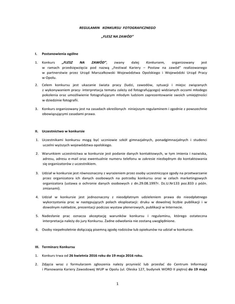 REGULAMIN KONKURSU FOTOGRAFICZNEGO „FLESZ NA ZAWÓD” I. Postanowienia ogólne 1. Konkurs „FLESZ NA ZAWÓD”, zwany dalej Konkursem, organizowany jest w ramach przedsięwzięcia pod nazwą „Festiwal Kariery – Postaw na zawód” realizowanego w partnerstwie przez Urząd Marszałkowski Województwa Opolskiego i Wojewódzki Urząd Pracy w Opolu. 2. Celem konkursu jest ukazanie świata pracy (ludzi, zawodów, sytuacji i miejsc związanych z wykonywaniem pracy- interpretacja tematu zależy od fotografującego) widzianych oczami młodego pokolenia oraz umożliwienie fotografującym młodym ludziom zaprezentowanie swoich umiejętności w dziedzinie fotografii. 3. Konkurs organizowany jest na zasadach określonych niniejszym regulaminem i zgodnie z powszechnie obowiązującymi zasadami prawa. II. Uczestnictwo w konkursie 1. Uczestnikami konkursu mogą być uczniowie szkół gimnazjalnych, ponadgimnazjalnych i studenci uczelni wyższych województwa opolskiego. 2. Warunkiem uczestnictwa w konkursie jest podanie danych kontaktowych, w tym imienia i nazwiska, adresu, adresu e-mail oraz ewentualnie numeru telefonu w zakresie niezbędnym do kontaktowania się organizatorów z uczestnikiem. 3. Udział w konkursie jest równoznaczny z wyrażeniem przez osoby uczestniczące zgody na przetwarzanie przez organizatora ich danych osobowych na potrzeby konkursu oraz w celach marketingowych organizatora (ustawa o ochronie danych osobowych z dn.29.08.1997r. Dz.U.Nr133 poz.833 z późn. zmianami). 4. Udział w konkursie jest jednoznaczny z nieodpłatnym udzieleniem prawa do nieodpłatnego wykorzystania prac w następujących polach eksploatacji: druku w dowolnej liczbie publikacji i w dowolnym nakładzie, prezentacji podczas wystaw plenerowych, publikacji w Internecie. 5. Nadesłanie prac oznacza akceptację warunków konkursu i regulaminu, którego ostateczna interpretacja należy do jury Konkursu. Żadne odwołania nie zostaną uwzględnione. 6. Osoby niepełnoletnie dołączają pisemną zgodę rodziców lub opiekunów na udział w konkursie. III. Terminarz Konkursu 1. Konkurs trwa od 26 kwietnia 2016 roku do 19 maja 2016 roku. 2. Zdjęcia wraz z formularzem zgłoszenia należy przynieść lub przesłać do Centrum Informacji i Planowania Kariery Zawodowej WUP w Opolu (ul. Oleska 127, budynek WORD II piętro) do 19 maja 1 2016r. do godziny 14.00. Decyduje data wpływu do Centrum, a prace dostarczone po terminie nie będą oceniane). 3. Rozstrzygnięcie Konkursu i ogłoszenie imion i nazwisk zwycięzców nastąpi podczas „Festiwalu Kariery – Postaw na zawód” w dniu 25 maja 2016 roku. IV Zasady Konkursu 1. Do konkursu należy zgłaszać zdjęcia w dwóch wersjach- elektronicznej (zdjęcia zapisane w formacie JPG na płytę CD) oraz w formie odbitki fotograficznej w formacie A4. 2. Zdjęcia zapisane na płycie CD powinny posiadać rozdzielczość nie mniejszą niż 3000x3000 pikseli i długość krótszego boku nie mniejszą niż 20cm. Płyta CD powinna być podpisana imieniem, nazwiskiem, a także zawierać adres i numer telefonu autora zdjęcia. W przypadku odbitek, dane należy zapisać na odwrocie zdjęcia. 3. Każdy autor może nadesłać maksymalnie 3 zdjęcia. 4. Ingerencja komputerowa dopuszczalna jest jedynie w zakresie działań odpowiadających zabiegom stosowanym w ciemni fotograficznej, polegających na rozjaśnianiu, kontrastowaniu, redukcji koloru, wypalaniu, poszerzaniu tonalności, wyostrzeniu, redukcji szumu. Wszelkie inne zmiany, opracowania, fotomontaż są niedopuszczalne. V. Przebieg oraz zasady prowadzenia Konkursu 1. O wyłonieniu zwycięzców Konkursu decyduje powołana w tym celu Komisja Konkursowa, zwana dalej Komisją. 2. Komisje powołuje Organizator. 3. Prace konkursowe nie spełniające warunków regulaminu nie będą klasyfikowane przez Komisję. 4. Spośród zgłoszonych do Konkursu prac Komisja wybierze najciekawsze i przyzna nagrody. 5. W uzasadnionych przypadkach istnieje możliwość przyznania specjalnych wyróżnień dla autorów prac nienagrodzonych. 6. Decyzja Komisji jest ostateczna. 7. Nagrody nie podlegają zamianie na inne ani zamianie na ekwiwalent pieniężny. 2