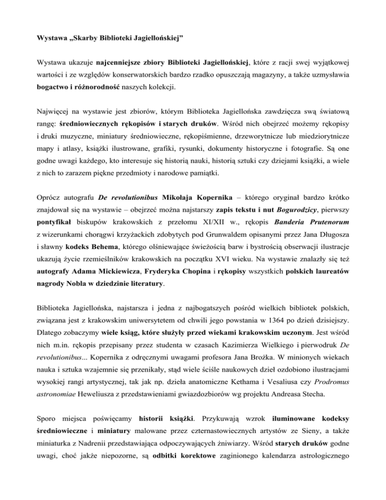 Wystawa „Skarby Biblioteki Jagiellońskiej” Wystawa ukazuje najcenniejsze zbiory Biblioteki Jagiellońskiej, które z racji swej wyjątkowej wartości i ze względów konserwatorskich bardzo rzadko opuszczają magazyny, a także uzmysławia bogactwo i różnorodność naszych kolekcji. Najwięcej na wystawie jest zbiorów, którym Biblioteka Jagiellońska zawdzięcza swą światową rangę: średniowiecznych rękopisów i starych druków. Wśród nich obejrzeć możemy rękopisy i druki muzyczne, miniatury średniowieczne, rękopiśmienne, drzeworytnicze lub miedziorytnicze mapy i atlasy, książki ilustrowane, grafiki, rysunki, dokumenty historyczne i fotografie. Są one godne uwagi każdego, kto interesuje się historią nauki, historią sztuki czy dziejami książki, a wiele z nich to zarazem piękne przedmioty i narodowe pamiątki. Oprócz autografu De revolutionibus Mikołaja Kopernika – którego oryginał bardzo krótko znajdował się na wystawie – obejrzeć można najstarszy zapis tekstu i nut Bogurodzicy, pierwszy pontyfikał biskupów krakowskich z przełomu XI/XII w., rękopis Banderia Prutenorum z wizerunkami chorągwi krzyżackich zdobytych pod Grunwaldem opisanymi przez Jana Długosza i sławny kodeks Behema, którego olśniewające świeżością barw i bystrością obserwacji ilustracje ukazują życie rzemieślników krakowskich na początku XVI wieku. Na wystawie znalazły się też autografy Adama Mickiewicza, Fryderyka Chopina i rękopisy wszystkich polskich laureatów nagrody Nobla w dziedzinie literatury. Biblioteka Jagiellońska, najstarsza i jedna z najbogatszych pośród wielkich bibliotek polskich, związana jest z krakowskim uniwersytetem od chwili jego powstania w 1364 po dzień dzisiejszy. Dlatego zobaczymy wiele ksiąg, które służyły przed wiekami krakowskim uczonym. Jest wśród nich m.in. rękopis przepisany przez studenta w czasach Kazimierza Wielkiego i pierwodruk De revolutionibus... Kopernika z odręcznymi uwagami profesora Jana Brożka. W minionych wiekach nauka i sztuka wzajemnie się przenikały, stąd wiele ściśle naukowych dzieł ozdobiono ilustracjami wysokiej rangi artystycznej, tak jak np. dzieła anatomiczne Kethama i Vesaliusa czy Prodromus astronomiae Heweliusza z przedstawieniami gwiazdozbiorów wg projektu Andreasa Stecha. Sporo miejsca poświęcamy historii książki. Przykuwają wzrok iluminowane kodeksy średniowieczne i miniatury malowane przez czternastowiecznych artystów ze Sieny, a także miniaturka z Nadrenii przedstawiająca odpoczywających żniwiarzy. Wśród starych druków godne uwagi, choć jakże niepozorne, są odbitki korektowe zaginionego kalendarza astrologicznego Gutenberga i książki z działającego w Krakowie warsztatu Szwajpolta Fiola, pierwszego na świecie drukarza publikującego druki cyrylickie, a także dzieła z pierwszej czynnej na ziemiach Polski drukarni. Bloki wielu książek na wystawie mają piękne oprawy. Wśród opraw renesansowych wyróżnia się ta ozdobiona orłem haftowanym perłami – dar królowej Anny Jagiellonki – oraz haftowane na jedwabiu oprawy z kolekcji Jana Ponętowskiego. Kilka prac gotyckich i renesansowych introligatorów to tylko mała próbka bogatych zbiorów Biblioteki. Niektóre wydawnictwa od początku były pomyślane jako dzieła sztuki, np. książka będąca ongiś własnością księcia Józefa Poniatowskiego: jej tekst został odbity z miedzianej płyty, na którą wcześniej wpisano go ręcznie. Kolekcja rękopisów muzycznych obejmuje średniowieczne zapisy nutowe i wielki antyfonarz bernardyński w oryginalnej średniowiecznej oprawie. Z późniejszych epok pokazujemy m.in. autografy Chopina, Moniuszki i Szymanowskiego. Dzieje kartografii – od rękopiśmiennego atlasu Ptolemeusza i włoskiego atlasu morskiego Agnese z XVI wieku po geologiczną mapę Karpat Staszica – dokumentują zmieniające się obrazy świata i próby jego przedstawiania, zgodne z rozwojem nauk i informacjami przywożonymi przez zamorskich podróżników. Dokumentem historii Polski jest nie tylko średniowieczny pergamin z czasów Władysława Łokietka, ale także tak niepozorne kawałki papieru, jak rozkazy i odezwy z czasów powstań narodowych czy kartka ze zbioru dokumentów polskiego Państwa Podziemnego z archiwum Adam Bienia (przetrwało ono kilkadziesiąt lat w skrytce pod podłogą). W skromnym wyborze dzieł grafiki i rysunku znalazły się m.in. ryciny Dürera i Rembrandta oraz niezwykły miedzioryt Claude Mellana, który jedną nieprzerwaną spiralną linią stworzył bardzo sugestywny wizerunek twarzy Chrystusa. Z bliższych nam czasów pochodzi akwarela Michałowskiego, wiek XX przywołują pojedyncze rysunki Schulza, Witkacego i Kantora. Na wystawie znalazły się też dwa spośród najstarszych widoków Krakowa: drzeworyt z Liber chronicarum Schedla i akwaforta z dzieła Brauna i Hogenberga. Z bogatej kolekcji fotografii, której bardzo istotną część stanowią teatralia, prezentujemy m.in. zdjęcia Heleny Modrzejewskiej.
