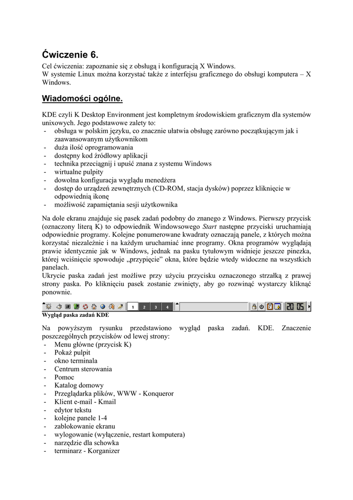 Ćwiczenie 6. Cel ćwiczenia: zapoznanie się z obsługą i konfiguracją X Windows. W systemie Linux można korzystać także z interfejsu graficznego do obsługi komputera – X Windows. Wiadomości ogólne. KDE czyli K Desktop Environment jest kompletnym środowiskiem graficznym dla systemów unixowych. Jego podstawowe zalety to: - obsługa w polskim języku, co znacznie ułatwia obsługę zarówno początkującym jak i zaawansowanym użytkownikom - duża ilość oprogramowania - dostępny kod źródłowy aplikacji - technika przeciągnij i upuść znana z systemu Windows - wirtualne pulpity - dowolna konfiguracja wyglądu menedżera - dostęp do urządzeń zewnętrznych (CD-ROM, stacja dysków) poprzez kliknięcie w odpowiednią ikonę - możliwość zapamiętania sesji użytkownika Na dole ekranu znajduje się pasek zadań podobny do znanego z Windows. Pierwszy przycisk (oznaczony literą K) to odpowiednik Windowsowego Start następne przyciski uruchamiają odpowiednie programy. Kolejne ponumerowane kwadraty oznaczają panele, z których można korzystać niezależnie i na każdym uruchamiać inne programy. Okna programów wyglądają prawie identycznie jak w Windows, jednak na pasku tytułowym widnieje jeszcze pinezka, której wciśnięcie spowoduje „przypięcie” okna, które będzie wtedy widoczne na wszystkich panelach. Ukrycie paska zadań jest możliwe przy użyciu przycisku oznaczonego strzałką z prawej strony paska. Po kliknięciu pasek zostanie zwinięty, aby go rozwinąć wystarczy kliknąć ponownie. Wygląd paska zadań KDE Na powyższym rysunku przedstawiono wygląd poszczególnych przycisków od lewej strony: - Menu główne (przycisk K) - Pokaż pulpit - okno terminala - Centrum sterowania - Pomoc - Katalog domowy - Przeglądarka plików, WWW - Konqueror - Klient e-mail - Kmail - edytor tekstu - kolejne panele 1-4 - zablokowanie ekranu - wylogowanie (wyłączenie, restart komputera) - narzędzie dla schowka - terminarz - Korganizer paska zadań. KDE. Znaczenie W oknie terminala można uruchamiać wszystkie programy przeznaczone do pracy w trybie tekstowym. Jeśli program jest przeznaczony także do pracy w X Windows automatycznie zostanie uruchomiona wersja okienkowa. Program Midnight Commander uruchomiony w oknie terminala. Konfiguracja KDE Przy zarządzaniu KDE przydatny jest program Centrum Sterowania. Umożliwia on konfigurację praktycznie wszystkich elementów X Windows jak na przykład język, wygląd okien, pasków przewijania. Z lewej strony można wybrać element, który chcemy zmienić. Po wybraniu go z prawej strony pojawią się odpowiednie opcje konfiguracyjne. Główny ekran Centrum Sterowania Konfiguracja wyglądu ekranu w centrum sterowania. Skróty Podobnie jak w Windows w KDE można także tworzyć skróty. Tworzy się je w następujący sposób: - klikamy na pulpicie prawym przyciskiem - wybieramy nowe > skrót - ustawiamy odpowiednie parametry skrótu w oknie jak na poniższym rysunku Klikając na rysunek z lewej strony można zmienić ikonę dla skrótu i wybrać z wielu dostępnych ikon systemowych. W zakładce prawa dostępu możemy zmienić odpowiednie prawa dla innych użytkowników, grupy oraz dla właściciela pliku. Zakładka uruchom zawiera opcje pozwalające uruchomić dowolne polecenie. W wierszu Polecenie: należy wpisać polecenie jakie ma zostać uruchomione po kliknięciu skrótu. Programy można uruchamiać w terminalu, można je także uruchamiać z uprawnieniami innych użytkowników. Polecenie do uruchomienia można wybrać za pomocą przycisku Przeglądaj... W zakładce aplikacja możliwe jest skojarzenie typów plików z nowo utworzonym skrótem. Wyszukiwanie plików Narzędzie do wyszukiwania plików dostępne jest po kliknięciu: K > What to do > find files Obsługa narzędzia jest praktycznie taka sama jak w systemach Windows. Ćwiczenia: 1. Zapoznaj się z elementami opisanymi w części teoretycznej. Sprawdź działanie wszystkich opisanych przycisków. 2. Uruchom dowolny program. Sprawdź jak działa podwójne kliknięcie na pasku tytułowym. Czy jest różnica pomiędzy systemem Linux, a Windows? 3. Uruchom kilka okien z programami. Część z nich „przypnij” pinezką i przełączaj się między panelami. Zwróć uwagę na obrazy paneli na pasku zadań. 4. Uruchom jeden program na każdym z paneli. 5. Uruchom Centrum Sterowania, przeczytaj pomoc dostępną w programie. W Centrum sterowania zapoznaj się z możliwymi ustawieniami biurka (pulpitu). 6. Zmień wygląd pulpitu, ustaw takie elementy jak tapeta, wygląd okien itp. 7. Ustaw zmianę tapety co 3 minuty. 8. Jak można wysłać okno na inny pulpit? Postaraj się znaleźć odpowiednią opcję. 9. Przejrzyj dostępne aplikacje uruchom i sprawdź możliwości kilku z nich. 10. Utwórz na pulpicie skrót uruchamiający program Midnight Commander w oknie terminala. 11. Postaraj się wyszukać za pomocą odpowiedniego narzędzia pliki o nazwie zawierającej słowo linux 12. Znajdź aplikację umożliwiającą podgląd wszystkich paneli. 13. Uruchom edytor tekstu dostępny w KDE. Przy jego pomocy stwórz skrypt, który po uruchomieniu wyśle do wszystkich zalogowanych użytkowników krótką wiadomość (użyj poleceń who, cut, write). Pytania: 1. Jaki program służy do zmian w konfiguracji KDE? 2. Czy w X Windows możliwa jest praca w trybie poleceń? 3. Jaki program w KDE umożliwia przeglądanie plików i stron WWW? 4. Jak przełączać się pomiędzy panelami? 5. Jaki efekt przynosi podwójne kliknięcie na pasku tytułowym okna? 6. Czy wygląd KDE można zmienić tak, żeby przypominał system MAC OS? Do sprawozdania: Opisać przebieg ćwiczeń wraz z odpowiedziami na pytania.