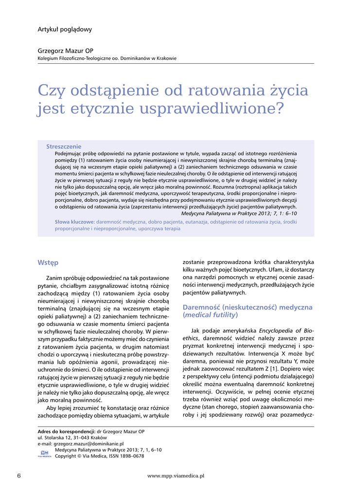 Artykuł poglądowy Grzegorz Mazur OP Kolegium Filozoficzno-Teologiczne oo. Dominikanów w Krakowie Czy odstąpienie od ratowania życia jest etycznie usprawiedliwione? Streszczenie Podejmując próbę odpowiedzi na pytanie postawione w tytule, wypada zacząć od istotnego rozróżnienia pomiędzy (1) ratowaniem życia osoby nieumierającej i niewyniszczonej skrajnie chorobą terminalną (znajdującej się na wczesnym etapie opieki paliatywnej) a (2) zaniechaniem technicznego odsuwania w czasie momentu śmierci pacjenta w schyłkowej fazie nieuleczalnej choroby. O ile odstąpienie od interwencji ratującej życie w pierwszej sytuacji z reguły nie będzie etycznie usprawiedliwione, o tyle w drugiej widzieć je należy nie tylko jako dopuszczalną opcję, ale wręcz jako moralną powinność. Rozumna (roztropna) aplikacja takich pojęć bioetycznych, jak daremność medyczna, uporczywość terapeutyczna, środki proporcjonalne i nieproporcjonalne, dobro pacjenta, wydaje się niezbędna przy podejmowaniu etycznie usprawiedliwionych decyzji o odstąpieniu od ratowania życia (zaprzestaniu interwencji przedłużających życie) pacjentów paliatywnych. Medycyna Paliatywna w Praktyce 2013; 7, 1: 6–10 Słowa kluczowe: daremność medyczna, dobro pacjenta, eutanazja, odstąpienie od ratowania życia, środki proporcjonalne i nieproporcjonalne, uporczywa terapia Wstęp Zanim spróbuję odpowiedzieć na tak postawione pytanie, chciałbym zasygnalizować istotną różnicę zachodzącą między (1) ratowaniem życia osoby nieumierającej i niewyniszczonej skrajnie chorobą terminalną (znajdującej się na wczesnym etapie opieki paliatywnej) a (2) zaniechaniem technicznego odsuwania w czasie momentu śmierci pacjenta w schyłkowej fazie nieuleczalnej choroby. W pierwszym przypadku faktycznie możemy mieć do czynienia z ratowaniem życia pacjenta, w drugim natomiast chodzi o uporczywą i nieskuteczną próbę powstrzymania lub opóźnienia agonii, prowadzącej nieuchronnie do śmierci. O ile odstąpienie od interwencji ratującej życie w pierwszej sytuacji z reguły nie będzie etycznie usprawiedliwione, o tyle w drugiej widzieć je należy nie tylko jako dopuszczalną opcję, ale wręcz jako moralną powinność. Aby lepiej zrozumieć tę konstatację oraz różnice zachodzące pomiędzy obiema sytuacjami, w artykule zostanie przeprowadzona krótka charakterystyka kilku ważnych pojęć bioetycznych. Ufam, iż dostarczy ona narzędzi pomocnych w etycznej ocenie zasadności interwencji medycznych, przedłużających życie pacjentów paliatywnych. Daremność (nieskuteczność) medyczna (medical futility) Jak podaje amerykańska Encyclopedia of Bioethics, daremność widzieć należy zawsze przez pryzmat konkretnej interwencji medycznej i spodziewanych rezultatów. Interwencja X może być daremna, ponieważ nie przynosi rezultatu Y, może jednak zaowocować rezultatem Z [1]. Dopiero więc z perspektywy celu (intencji podmiotu działającego) określić można ewentualną daremność konkretnej interwencji. Oczywiście, w pełnej ocenie etycznej trzeba również wziąć pod uwagę okoliczności medyczne (stan chorego, stopień zaawansowania choroby i jej spodziewany rozwój) oraz pozamedycz- Adres do korespondencji: dr Grzegorz Mazur OP ul. Stolarska 12, 31–043 Kraków e-mail: [email protected] Medycyna Paliatywna w Praktyce 2013; 7, 1, 6–10 Copyright © Via Medica, ISSN 1898–0678 6 www.mpp.viamedica.pl Grzegorz Mazur, Czy odstąpienie od ratowania życia jest etycznie usprawiedliwione? ne (światopogląd chorego, wiek, doświadczenie życiowe, preferencje dotyczące dalszego leczenia etc.). Dla przykładu, odłączenie terminalnie chorego od respiratora oznaczać będzie samą interwencję (przedmiot działania wybrany przez konkretny podmiot, czyli intencję bliższą), a nie cel (intencję dalszą) lekarza, który interwencję tę przeprowadza, lub pacjenta, który jest jej poddawany. Sprawę dodatkowo komplikuje fakt, że cel lekarza nie zawsze pokrywa się z celem pacjenta. Wśród etyków poruszających ten temat panuje znaczny konsensus, co do tego, że pacjent nie posiada pozytywnego prawa uzyskiwania nieskutecznych świadczeń lekarskich. Innymi słowy, nie może on wymuszać na lekarzu interwencji, która z medycznego punktu widzenia jest daremna. Pytania bardziej kontrowersyjne rodzą się w kontekście ustalania, która interwencja rzeczywiście wyczerpuje kryteria daremności, a która nie. Sami lekarze niekiedy zdecydowanie różnią się w medycznej ocenie konkretnych przypadków. Bywa, że skonsultowawszy sprawę z kilkoma lekarzami, zdezorientowany pacjent i/lub jego rodzina nalega na interwencję, która w opinii lekarza prowadzącego będzie nieskuteczna [1]. W etyce rozbieżności sięgają głębiej. Z jednej strony sytuują się stanowiska radykalne, w myśl których życie ludzkie ma wartość nieskończoną, dlatego zawsze i za wszelką cenę należy je ratować. Oznacza to, iż odstępowanie od leczenia, choćby daremnego, nie może być usprawiedliwione. Pogląd taki głoszą współcześnie między innymi myśliciele związani z ortodoksyjnym judaizmem (na przykład David J. Bleich i Fred Rosner) [2]. Z drugiej strony znajdują się stanowiska permisywne. Reprezentant jednego z nich, Charles F. McKhann, twierdzi, że lekarz nie tylko nie ma obowiązku ratowania (podtrzymywania, przedłużania) życia chorego, ale wręcz powinien je skracać, asystując na przykład przy „racjonalnie wybranym” przez pacjenta samobójstwie. Leczenie staje się daremne, jeśli w jego wyniku pacjent nadmiernie cierpi. Innymi słowy, autonomiczny i kompetentny pacjent ma prawo uznać terapię przysparzającą mu cierpień za daremną oraz zrezygnować z niej, prosząc o eutanazję [2]. W podobnym, proeutanatycznym tonie, choć nie bez istotnych różnic, wypowiada się także Joseph Fletcher, prekursor etyki sytuacyjnej, oraz James Rachels [2]. Jak nietrudno się domyślić, stos