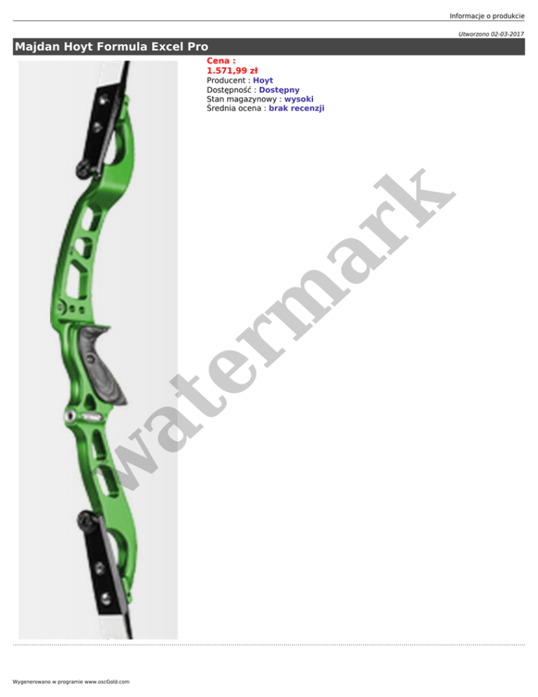 Informacje o produkcie Utworzono 02-03-2017 Majdan Hoyt Formula Excel Pro Cena : 1.571,99 zł w at er m ar k Producent : Hoyt Dostępność : Dostępny Stan magazynowy : wysoki Średnia ocena : brak recenzji Wygenerowano w programie www.oscGold.com er m ar k at w Dostępne opcje Majdan Hoyt Formula Excel Pro » długość majdanu: wybierz, 25". » kolor: wybierz, Green, Orange, Pink.