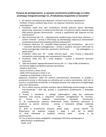 Pytania do postępowania w sprawie zamówienia publicznego w trybie przetargu nieograniczonego na „Przebudowę targowiska w Szczytnie” 1. W zakresie zamówienia jest dostawa i montaż trzech bram wjazdowych z furtkami. Proszę o podanie typu bram, czy mają być otwierane ręcznie czy automatycznie. 2. Przedmiar robót oraz opis architektury określa pokrycie dachu dachówką bitumiczną, natomiast w opisie konstrukcji pkt. 4.0 pokrycie dachu stanowi płyta OSB pokryta gontem bitumicznym – proszę o wyjaśnienie jaki materiał ma być zastosowany? 3. Opis konstrukcji pkt 5.0 – zabezpieczenie antykorozyjne konstrukcji stalowej (…) system malarski – proszę o informację czy Zamawiający dopuszcza zastosowanie ocynkowanej konstrukcji stalowej (zamiast malowania)? 4. Przedmiar robót poz. 21 – świetliki i klapy dymowe, opis architektury pkt. 6.2.6 – naświetla dachowe piliwęglanowe – proszę o podanie szerszych informacji na temat wymaganego materiału, parametry techniczne, typ poliwęglanu, w jakiej ramie? 5. Przedmiar robót poz. 39 – środki ochrony ppoż. - 5szt. Proszę o załączenie zestawienia zawierającego opis zamawianych materiałów. 6. Przedmiar robót poz. 38 – znaki drogowe – proszę o udzielenie szerszych informacji. 7. Opis do projektu zagospodarowania terenu pkt. 11 – Opis małej architektury: Na terenie objętym projektem planuje się budowę : - ławek w ilości 8 szt. - koszy na śmieci w ilości 10 szt. - tablic informacyjnych w ilości 3 szt. - stojaków na jednoślady w ilości 4 szt. Załączony przedmiar robót nie zawiera wymienionych elementów, w związku z powyższym proszę o informację czy wchodzą one w zakres zamówienia. Jeśli tak, to proszę o uzupełnienie przedmiaru o brakujące pozycje oraz załączenie szczegółowego opisu tych elementów. 8. Czy w zakres wyceny wchodzi wymiana złącza kablowego-pomiarowego na złącze trzy-licznikowe ? Jeśli tak, proszę o uzupełnienie przedmiarów o brakujące pozycje. 9. Proszę o określenie z jakiego poliwenglanu mają być wykonane naświetla oraz proszę o załączenie rysunków szczegółowych ich montażu. 10. Proszę o podanie parametrów dachówki bitumicznej. 11. W przedmiarach założono deskowanie połaci dachowej natomiast w projekcie są panele wiórowe - proszę o wskazanie jakiego materiału wykonawca ma użyć. 12. Brak w przedmiarze pokrycia połaci papą - proszę określić czy Wykonawca ma wykonać izolację z papy a jeśli tak to jakiej? 13. Brak informacji o środkach ochrony ppoż - proszę o jej zamieszczenie 14. Czy w wycenie należy uwzględnić następujące elementy występujące w dokumentacji projektowej: - ławki szt 8 - kosze na śmieci szt 10 - stojaki na jednoślady szt 4 ( prosimy o podanie na ile stanowisk przewidziana jest 1 szt) ODPOWIEDZI 1. Bramy otwierane ręcznie. 2. Panele wiórowe - zgodnie z projektem. 3. Tak, Dopuszcza się zastosowanie ocynkowanej konstrukcji (cynkowanie ogniowe). 4. Informacji na temat wymaganego materiału, parametry techniczne, typ poliwęglanu, ramy - Rama aluminiowa, - poliwęglan 2-o komorowy gr. 16 mm Własności cieplne Temperatura mięknienia Vicata ‘B’ 145 – 150 °C Temperatura trwałości kształtu (obciążenie 1,82 MPa) 135 – 140 °C Współczynnik liniowej rozszerzalności cieplnej 6,7 x 10/ K Przewodność cieplna 0,21 W/(m x K) Maksymalna temperatura pracy - bez obciążenia - praca ciągła 100 °C - praca krótkotrwała 135 °C 5. Środki ochrony ppoż. - 5szt. Gaśnica proszkowa 2 kg typ 6P4x / 500 m2- 5 szt. 6. Znaki drogowe zgodnie z rys. nr D1 7.Tak. Elementy małej architektury wchodzą w zakres zamówienia. Dodatkowe dane: - ławki w ilości 8 szt. - dł. 1,8 m z siedziskiem z drewna - koszy na śmieci w ilości 10 szt. 80 l - typowy stojący kosz betonowy z wkładem z blachy ocynkowanej - tablic informacyjnych w ilości 3 szt. – stalowe - stojaków na jednoślady w ilości 4 szt. - stalowe 8-o stanowiskowe 8. Zakres zamówienia obejmuje wymianę złącza kablowo-pomiarowego zgodnie z projektem instalacji elektrycznych. 9. Poliwęglan 2-o komorowy gr. 16 mm Własności cieplne Temperatura mięknienia Vicata ‘B’ 145 – 150 °C Temperatura trwałości kształtu (obciążenie 1,82 MPa) 135 – 140 °C Współczynnik liniowej rozszerzalności cieplnej 6,7 x 10/ K Przewodność cieplna 0,21 W/(m x K) Maksymalna temperatura pracy - bez obciążenia - praca ciągła 100 °C - praca krótkotrwała 135 °C Montaż zgodnie z wytycznymi producenta płyt poliwęglanowych. 10. Parametry dachówki bitumicznej. - rdzeń z welonu szklanego110 g/m2, - masa bitumiczna oksydowana, - posypka z granulatu mineralnego UWAGA: Dopuszcza się zastosowanie jedynie dachówki bitumicznej zaklasyfikowanej jako materiał nierozprzestrzeniający ognia, co należy potwierdzić atestem lub certyfikatem 11. Połać dachowa z paneli wiórowych. 12. Zgodnie z wymogami producenta dachówki bitumicznej. Jeżeli producent przewiduje papę podkładową to należy ją uwzględnić w ofercie. 13. Środki ochrony ppoż. - 5szt. Gaśnica proszkowa 2 kg typ 6P4x / 500 m2- 5 szt. 14. Tak. Należy uwzględnić powyższe elementy. - stojak na jednoślady minimum 8-o stanowiskowy