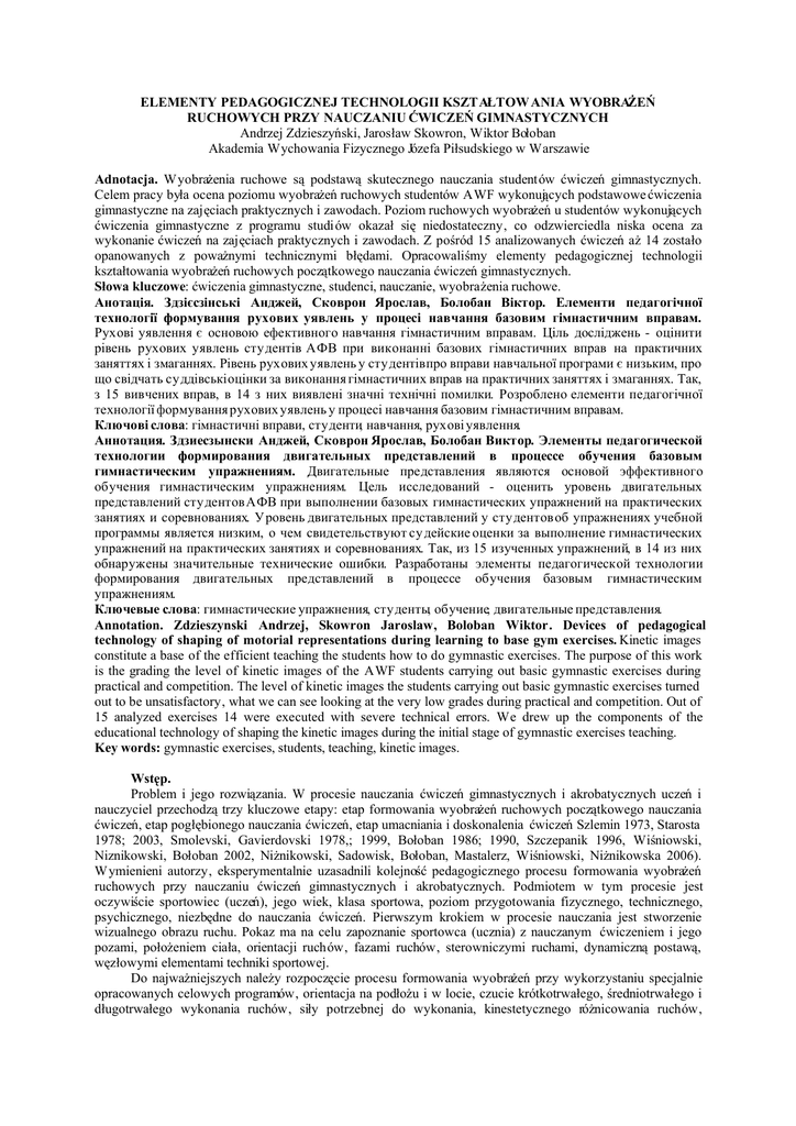 ELEMENTY PEDAGOGICZNEJ TECHNOLOGII KSZTAŁTOW ANIA WYOBRAŻEŃ RUCHOWYCH PRZY NAUCZANIU ĆWICZEŃ GIMNASTYCZNYCH Andrzej Zdzieszyński, Jarosław Skowron, Wiktor Bołoban Akademia Wychowania Fizycznego Józefa Piłsudskiego w Warszawie Adnotacja. Wyobrażenia ruchowe są podstawą skutecznego nauczania studentów ćwiczeń gimnastycznych. Celem pracy była ocena poziomu wyobrażeń ruchowych studentów AWF wykonujących podstawowe ćwiczenia gimnastyczne na zajęciach praktycznych i zawodach. Poziom ruchowych wyobrażeń u studentów wykonujących ćwiczenia gimnastyczne z programu studiów okazał się niedostateczny, co odzwierciedla niska ocena za wykonanie ćwiczeń na zajęciach praktycznych i zawodach. Z pośród 15 analizowanych ćwiczeń aż 14 zostało opanowanych z poważnymi technicznymi błędami. Opracowaliśmy elementy pedagogicznej technologii kształtowania wyobrażeń ruchowych początkowego nauczania ćwiczeń gimnastycznych. Słowa kluczowe: ćwiczenia gimnastyczne, studenci, nauczanie, wyobrażenia ruchowe. Анотація. Здзієсзінські Анджей, Сковрон Ярослав, Болобан Віктор. Елементи педагогічної технології формування рухових уявлень у процесі навчання базовим гімнастичним вправам. Рухові уявлення є основою ефективного навчання гімнастичним вправам. Ціль досліджень - оцінити рівень рухових уявлень студентів АФВ при виконанні базових гімнастичних вправ на практичних заняттях і змаганнях. Рівень рухових уявлень у студентів про вправи навчальної програми є низьким, про що свідчать суддівські оцінки за виконання гімнастичних вправ на практичних заняттях і змаганнях. Так, з 15 вивчених вправ, в 14 з них виявлені значні технічні помилки. Розроблено елементи педагогічної технології формування рухових уявлень у процесі навчання базовим гімнастичним вправам. Ключові слова: гімнастичні вправи, студенти, навчання, рухові уявлення. Аннотация. Здзиесзынски Анджей, Сковрон Ярослав, Болобан Виктор. Элементы педагогической технологии формирования двигательных представлений в процессе обучения базовым гимнастическим упражнениям. Двигательные представления являются основой эффективного обучения гимнастическим упражнениям. Цель исследований - оценить уровень двигательных представлений студентов АФВ при выполнении базовых гимнастических упражнений на практических занятиях и соревнованиях. Уровень двигательных представлений у студентов об упражнениях учебной программы является низким, о чем свидетельствуют су дейские оценки за выполнение гимнастических упражнений на практических занятиях и соревнованиях. Так, из 15 изученных упражнений, в 14 из них обнаружены значительные технические ошибки. Разработаны элементы педагогической технологии формирования двигательных представлений в процессе обучения базовым гимнастическим упражнениям. Ключевые слова: гимнастические упражнения, студенты, обучение, двигательные представления. Annotation. Zdzieszynski Andrzej, Skowron Jaroslaw, Boloban Wiktor. Devices of pedagogical technology of shaping of motorial representations during learning to base gym exercises. Kinetic images constitute a base of the efficient teaching the students how to do gymnastic exercises. The purpose of this work is the grading the level of kinetic images of the AWF students carrying out basic gymnastic exercises during practical and competition. The level of kinetic images the students carrying out basic gymnastic exercises turned out to be unsatisfactory, what we can see looking at the very low grades during practical and competition. Out of 15 analyzed exercises 14 were executed with severe technical errors. We drew up the components of the educational technology of shaping the kinetic images during the initial stage of gymnastic exercises teaching. Key words: gymnastic exercises, students, teaching, kinetic images. Wstęp. Problem i jego rozwiązania. W procesie nauczania ćwiczeń gimnastycznych i akrobatycznych uczeń i nauczyciel przechodzą trzy kluczowe etapy: etap formowania wyobrażeń ruchowych początkowego nauczania ćwiczeń, etap pogłębionego nauczania ćwiczeń, etap umacniania i doskonalenia ćwiczeń Szlemin 1973, Starosta 1978; 2003, Smolevski, Gavierdovski 1978,; 1999, Bołoban 1986; 1990, Szczepanik 1996, Wiśniowski, Niznikowski, Bołoban 2002, Niżnikowski, Sadowisk, Bołoban, Mastalerz, Wiśniowski, Niżnikowska 2006). Wymienieni autorzy, eksperymentalnie uzasadnili kolejność pedagogicznego procesu formowania wyobra