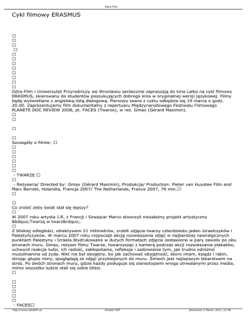 Odra-Film Cykl filmowy ERASMUS Odra-Film i Uniwersytet Przyrodniczy we Wrocławiu serdecznie zapraszają do kina Lalka na cykl filmowy ERASMUS, skierowany do studentów poszukujących dobrego kina w oryginalnej wersji językowej. Filmy będą wyświetlane z angielską listą dialogową. Pierwszy seans z cyklu odbędzie się 19 marca o godz. 20.00. Zaprezentujemy film dokumentalny z repertuaru Międzynarodowego Festiwalu Filmowego PLANETE DOC REVIEW 2008, pt. FACES (Twarze), w reż. Gmax (Gérard Maximin). Szczegóły o filmie: - TWARZE - Reżyseria/ Directed by: Gmax (Gérard Maximin), Produkcja/ Production: Pieter van Huystee Film and Marc Berrebi, Holandia, Francja 2007/ The Netherlands, France 2007, 76 min. Co zrobić żeby świat stał się lepszy? W 2007 roku artysta J.R. z Francji i Szwajcar Marco stworzyli niezależny projekt artystyczny „Twarzą w twarz”. Z bliskiej odległości, obiektywem 21 milimetrów, zrobili zdjęcia twarzy czterdziestu jeden Izraelczyków i Palestyńczyków. W marcu 2007 roku rozpoczęli akcję rozwieszania zdjęć w najbardziej newralgicznych punktach Palestyny i Izraela.Wydrukowane w dużych formatach zdjęcia zestawione w pary zawisły po obu stronach muru. Gmax, reżyser filmu Twarze, towarzysząc z kamerą podczas akcji rozwieszania plakatów, uchwycił reakcje ludzi, ich radość, zakłopotanie, refleksje i zadziwienie tym, jak trudno odróżnić muzułmanina od żyda. Nikt nie był obojętny, bo jak zachować obojętność, skoro imam, ksiądz i rabin, strojąc głupie miny, spoglądają ze zdjęć przyklejonych do muru. Śmiech jest najlepszym lekarstwem na stres. Po dwóch stronach muru, gdzie każdy posługuje się stereotypami wroga utrwalanymi przez media, mimo wszystko ludzie stali się sobie bliżsi. - FACES http://www.odrafilm.pl Kreator PDF Utworzono 2 March, 2017, 21:48 Odra-Film - Directed by: Gmax (Gérard Maximin), Production: Pieter van Huystee Film and Marc Berrebi, The Netherlands, France 2007, 76 min In March 2007, French photographer and street artist JR and his friend Marco embarked on the biggest illegal photo exhibition ever. Enormous portraits were pasted on both sides of the Wall of Separation / Security Fence, as well as in eight Palestinian and Israeli cities. The portraits were shot by JR and depicted laughing Israeli and Palestinians who hold the same job on different sides of the Wall of Separation / Security Fence. By pasting them side to side, Face 2 Face, on the notorious Wall of Separation / Security Fence of Separation, JR urged both Israelis and Palestinians to fight the stereotypes of ‘the other’ through the faces.The documentary Faces tells the fascinating story behind the Face 2 Face project. From the first photo shoots to the eventual pasting in such hotbeds like Bethlehem, Tel Aviv, Hebron and Ramallah: the camera was there, capturing JR’s work, the pasting, but also the emotional reactions of the people of Israel and Palestine. www.docreview.pl Kolejne filmy z cyklu ERASMUS odbędą się 9 i 23 kwietnia. Szczegółowe informacje ukazywać się będą na bieżąco na naszej stronie internetowej. http://www.odrafilm.pl Kreator PDF Utworzono 2 March, 2017, 21:48