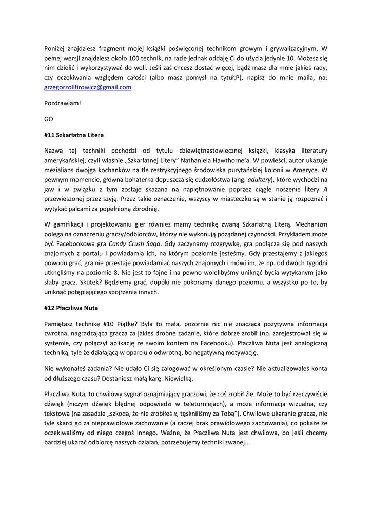 Poniżej znajdziesz fragment mojej książki poświęconej technikom growym i grywalizacyjnym. W pełnej wersji znajdziesz około 100 technik, na razie jednak oddaję Ci do użycia jedynie 10. Możesz się nim dzielić i wykorzystywać do woli. Jeśli zaś chcesz dostać więcej, bądź masz dla mnie jakieś rady, czy oczekiwania względem całości (albo masz pomysł na tytuł:P), napisz do mnie maila, na: [email protected] Pozdrawiam! GO #11 Szkarłatna Litera Nazwa tej techniki pochodzi od tytułu dziewiętnastowiecznej książki, klasyka literatury amerykańskiej, czyli właśnie „Szkarłatnej Litery” Nathaniela Hawthorne’a. W powieści, autor ukazuje mezialians dwojga kochanków na tle restrykcyjnego środowiska purytańskiej kolonii w Ameryce. W pewnym momencie, główna bohaterka dopuszcza się cudzołóstwa (ang. adultery), które wychodzi na jaw i w związku z tym zostaje skazana na napiętnowanie poprzez ciągłe noszenie litery A przewieszonej przez szyję. Przez takie oznaczenie, wszyscy w miasteczku są w stanie ją rozpoznać i wytykać palcami za popełnioną zbrodnię. W gamifikacji i projektowaniu gier również mamy technikę zwaną Szkarłatną Literą. Mechanizm polega na oznaczeniu graczy/odbiorców, którzy nie wykonują pożądanej czynności. Przykładem może być Facebookowa gra Candy Crush Saga. Gdy zaczynamy rozgrywkę, gra podłącza się pod naszych znajomych z portalu i powiadamia ich, na którym poziomie jesteśmy. Gdy przestajemy z jakiegoś powodu grać, gra nie przestaje powiadamiać naszych znajomych i mówi im, że np. od dwóch tygodni utknęliśmy na poziomie 8. Nie jest to fajne i na pewno wolelibyśmy uniknąć bycia wytykanym jako słaby gracz. Skutek? Będziemy grać, dopóki nie pokonamy danego poziomu, a wszystko po to, by uniknąć potępiającego spojrzenia innych. #12 Płaczliwa Nuta Pamiętasz technikę #10 Piątkę? Była to mała, pozornie nic nie znacząca pozytywna informacja zwrotna, nagradzająca gracza za jakieś drobne zadanie, które dobrze zrobił (np. zarejestrował się w systemie, czy połączył aplikację ze swoim kontem na Facebooku). Płaczliwa Nuta jest analogiczną techniką, tyle że działającą w oparciu o odwrotną, bo negatywną motywację. Nie wykonałeś zadania? Nie udało Ci się zalogować w określonym czasie? Nie aktualizowałeś konta od dłuższego czasu? Dostaniesz małą karę. Niewielką. Płaczliwa Nuta, to chwilowy sygnał oznajmiający graczowi, że coś zrobił źle. Może to być rzeczywiście dźwięk (niczym dźwięk błędnej odpowiedzi w teleturniejach), a może informacja wizualna, czy tekstowa (na zasadzie „szkoda, że nie zrobiłeś x, tęskniliśmy za Tobą”). Chwilowe ukaranie gracza, nie tyle skarci go za nieprawidłowe zachowanie (a raczej brak prawidłowego zachowania), co pokaże że oczekiwaliśmy od niego czegoś innego. Ważne, że Płaczliwa Nuta jest chwilowa, bo jeśli chcemy bardziej ukarać odbiorcę naszych działań, potrzebujemy techniki zwanej... #13 Widoczny Nagrobek Widoczny Nagrobek, to kolejna wariacja na temat dawania negatywnego feedbacku odbiorcy naszej gamifikacji. Podobnie jak Szkarłatna Litera, Widoczny Nagrobek jest wizualną karą, która utrzymuje się przed graczem przez dłuższy czas, albo nawet przez cały czas funkcjonowania gry. Po co korzystać z Widocznych Nagrobków? Podobnie jak Szkarłatna Litera i Płaczliwa Nuta, Nagrobki operują wokół motywacji unikającej negatywnych elementów. Gracze chcą uniknąć wszelkich negatywnych elementów, tak samo jak utraty już wypracowanych osiągnięć. Widoczne Nagrobki są potężną techniką, która wspiera to unikanie. Warto jednak pamiętać, że zbyt częste używanie Widocznych Nagrobków może spowodować frustrację, a w rezultacie rezygnację z gry. #14 Narracja Narracja, to opowiadanie historii. W grach, bogata i głęboka Narracja jest często tym, co przykuwa uwagę gracza i decyduje o sukcesie tytułu. Interesująca historia potrafi wkręcić słuchaczy na tyle, by przemienić ich w fanboyów i oddanych głosicieli danej produkcji. W grywalizacji używamy Narracji by zwiększyć zainteresowanie odbiorcy, ale też odciągnąć go od pozostałych elementów, które mogą wydać się dla niego uciążliwe. Idealnym przykładem wykorzystania Narracji są wszelkie aplikacje zachęcające nas do niekoniecznie przyjemnych czynności. Chcesz biegać, ale masz problem ze znalezieniem energii? A co powiesz na epicką ucieczkę przed goniącymi Cię zombie? Brzmi ekscytująco, prawda? A na pewno o wiele lepiej, niż zwykłe bieganie po parku. Dzieci nie chcą pomagać w sprzątaniu? A co, jeśli zachęcimy je do przeżywania przygód jako czarodziej, rozwijania swojej postaci i wykonywania misji dawanych przez władcę? Brzmi ciekawiej? Jasne, że tak, bo nagle uciążliwe zadania zmieniają się, dzięki Narracji, w epickie questy i skrywające tajemnice przygody. Narracja idealnie nadaję się też do usług edukacyjnych, gdzie opakowujemy lekcje i zadania w pełną epickości, interesującą historię o bohaterach, przeciwnościach losu i legendarnych wydarzeniach, których gracze mogą być częscią. Podanie w ten sposób standardowych zadań i czynności pozwala na skierowanie uwagi odbiorcy na coś innego, niż nauka, codzienne czynności, czy wymagany od niego wysiłek. Technika Narracji idealnie sprawdza się zarówno podczas pierwszych etapów grywalizacji – odkrycia i onboardingu, jak i później, w czasie korzystania z naszych usług, czy produktów. #15 Dziecko Przeznaczenia Nie możemy mówić o technice Narracji bez wspomnienia o Dziecku Przeznaczenia. To również technika narracyjna, polegająca na tym, że głównym bohaterem historii staje się sam gracz, czyli główny odbiorca naszych usług/produktów. Ale to nie wszystko. Jeśli chcesz skorzystać z techniki Dziecka Przeznaczenia, musisz oprawić swoją grę lub grywalizację w Narrację, w której występuje super groź